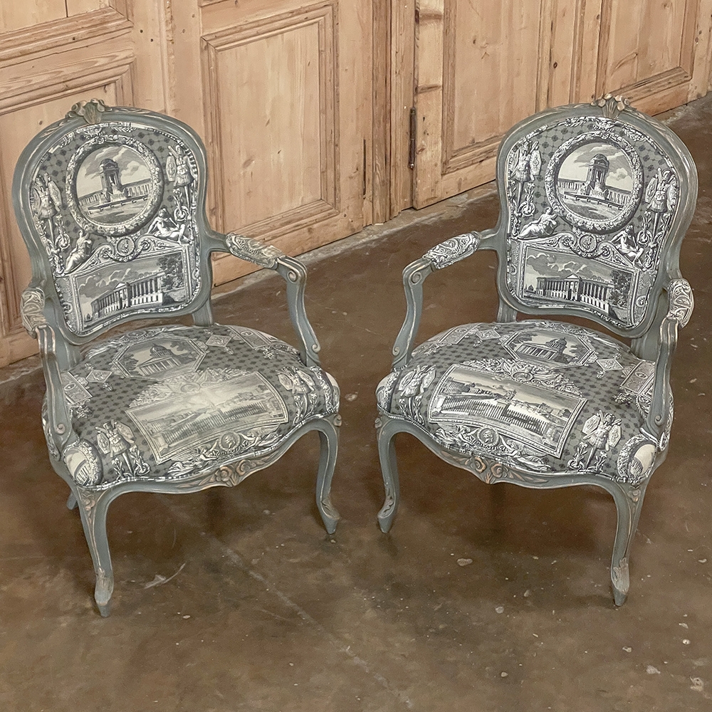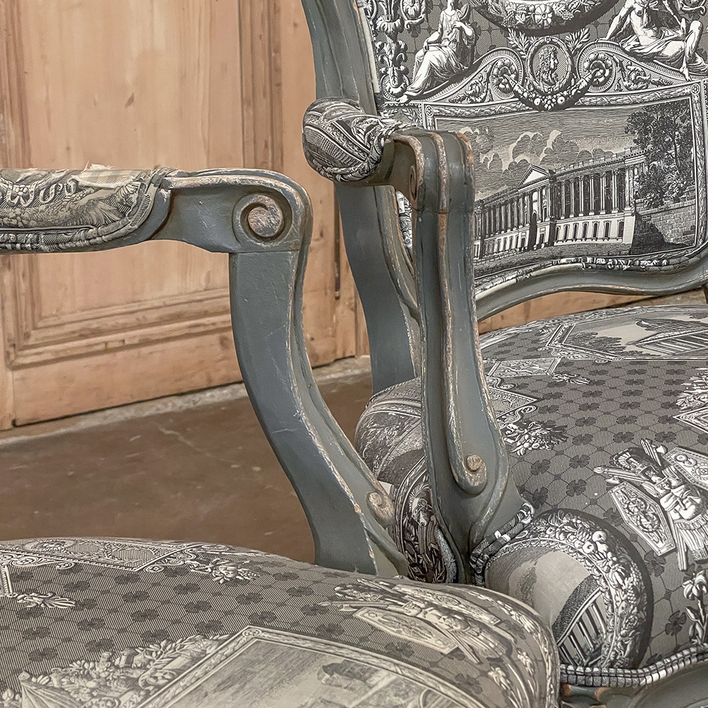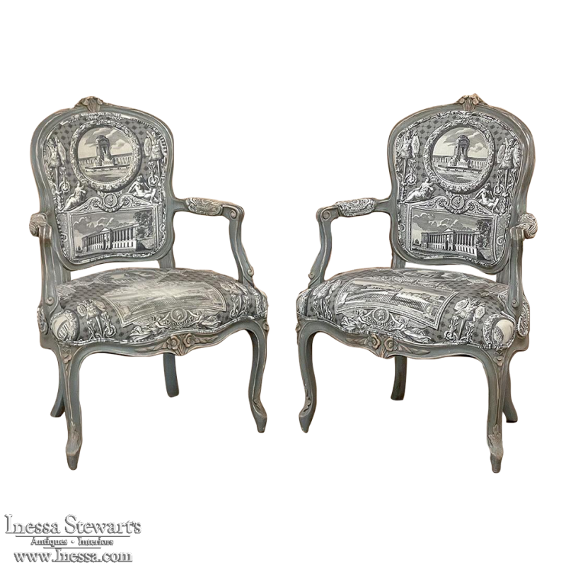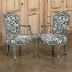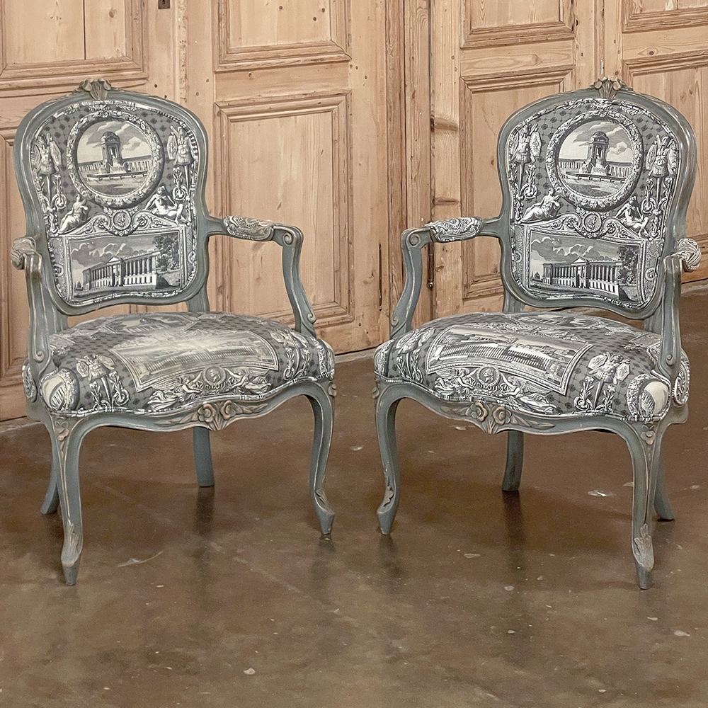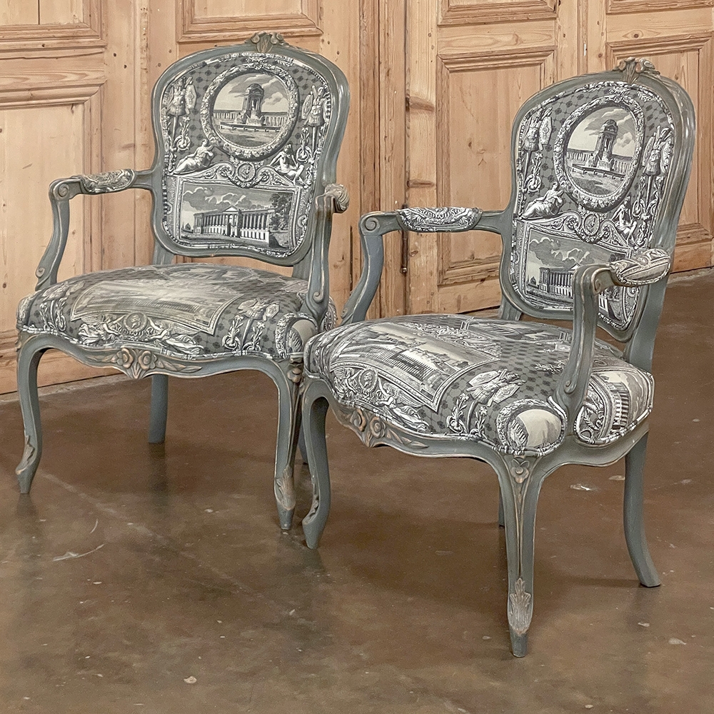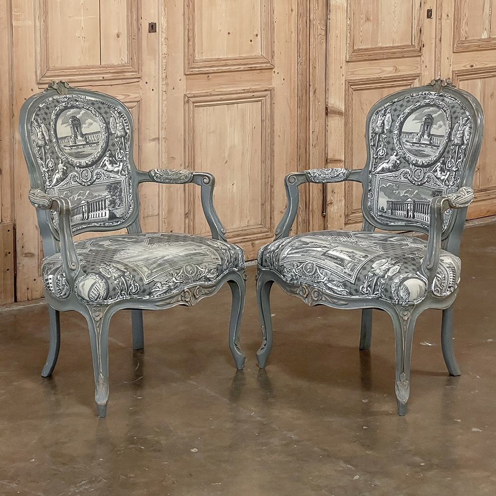 Pair Antique French Painted Louis XV Armchairs ~ Fauteuils will add a visually soft, classic accent to any room, plus surprising comfort in the bargain! Sculpted from solid hardwood in the manner of Louis XV, each features a contoured shield-shaped seat back topped with hand-carved flowers, all connected to padded armrests and a generously sized seat. The seat back is upholstered front and back matching the seat, with a lovely classical gray monotone pattern evoking the grandeur of classic art and architecture in multiple framed panels. The remainder of the framework features elegant scrolled form with fine molded detail, and the apron and legs below are also carved with floral and foliate relief, all of which is enhanced by the hand-painted finish which has achieved a lovely level of patina and aging over the decades.