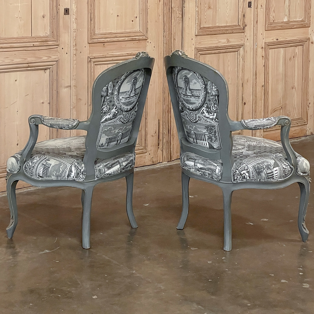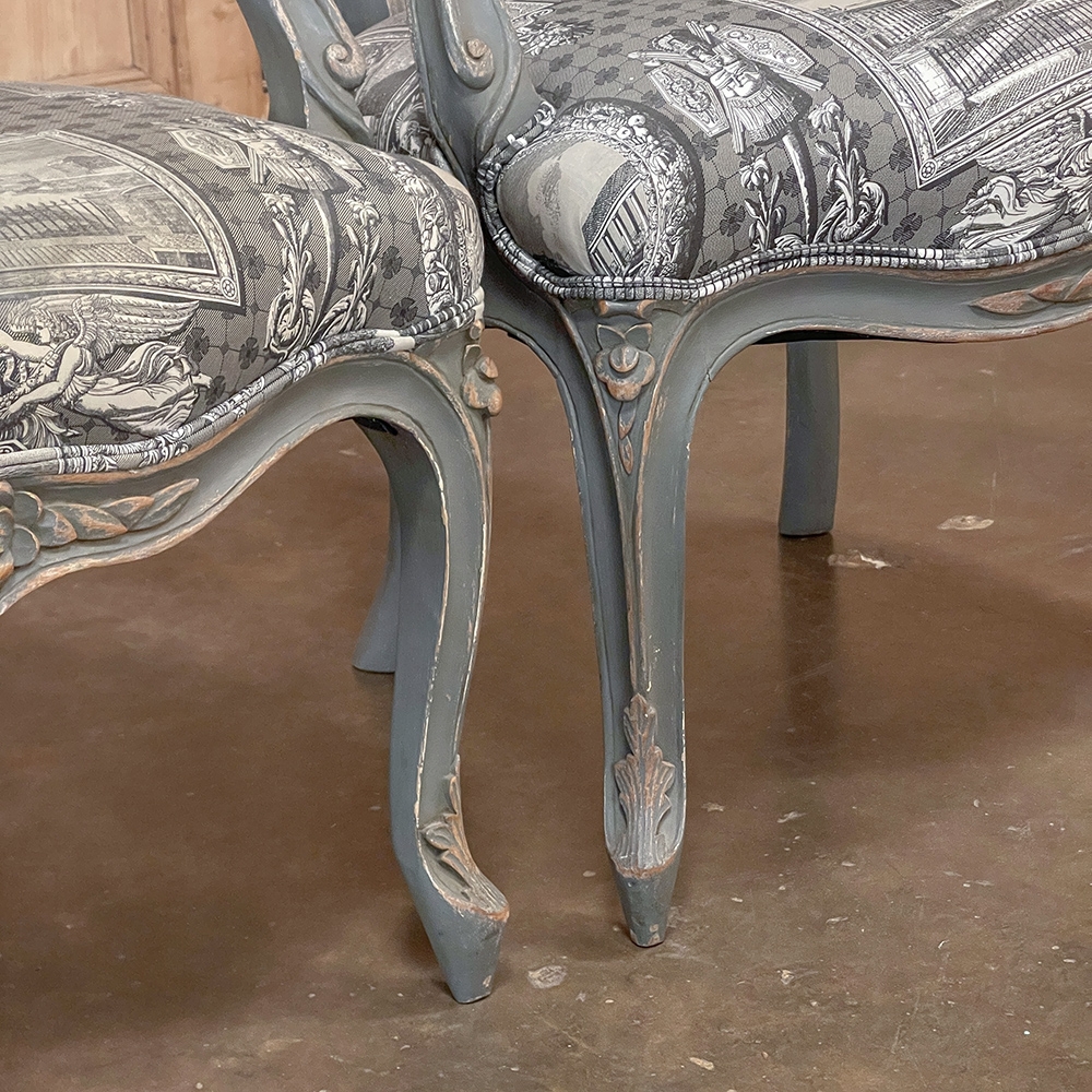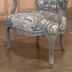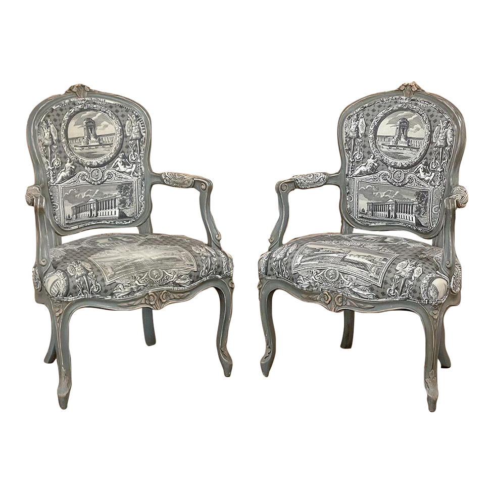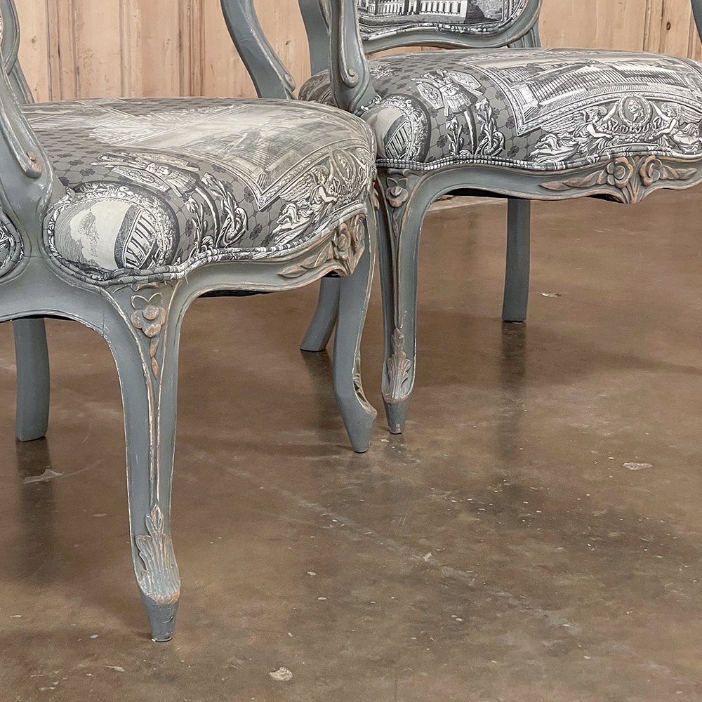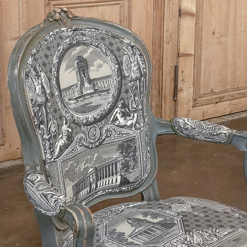 Pair Antique French Painted Louis XV Armchairs ~ Fauteuils will add a visually soft, classic accent to any room, plus surprising comfort in the bargain! Sculpted from solid hardwood in the manner of Louis XV, each features a contoured shield-shaped seat back topped with hand-carved flowers, all connected to padded armrests and a generously sized seat. The seat back is upholstered front and back matching the seat, with a lovely classical gray monotone pattern evoking the grandeur of classic art and architecture in multiple framed panels. The remainder of the framework features elegant scrolled form with fine molded detail, and the apron and legs below are also carved with floral and foliate relief, all of which is enhanced by the hand-painted finish which has achieved a lovely level of patina and aging over the decades.