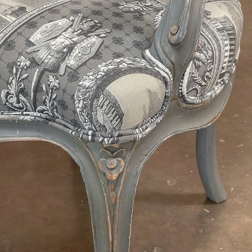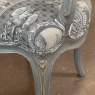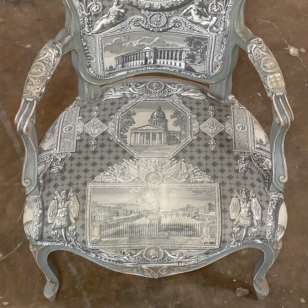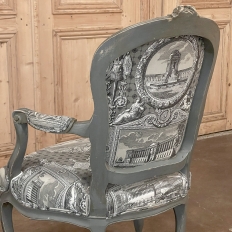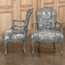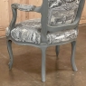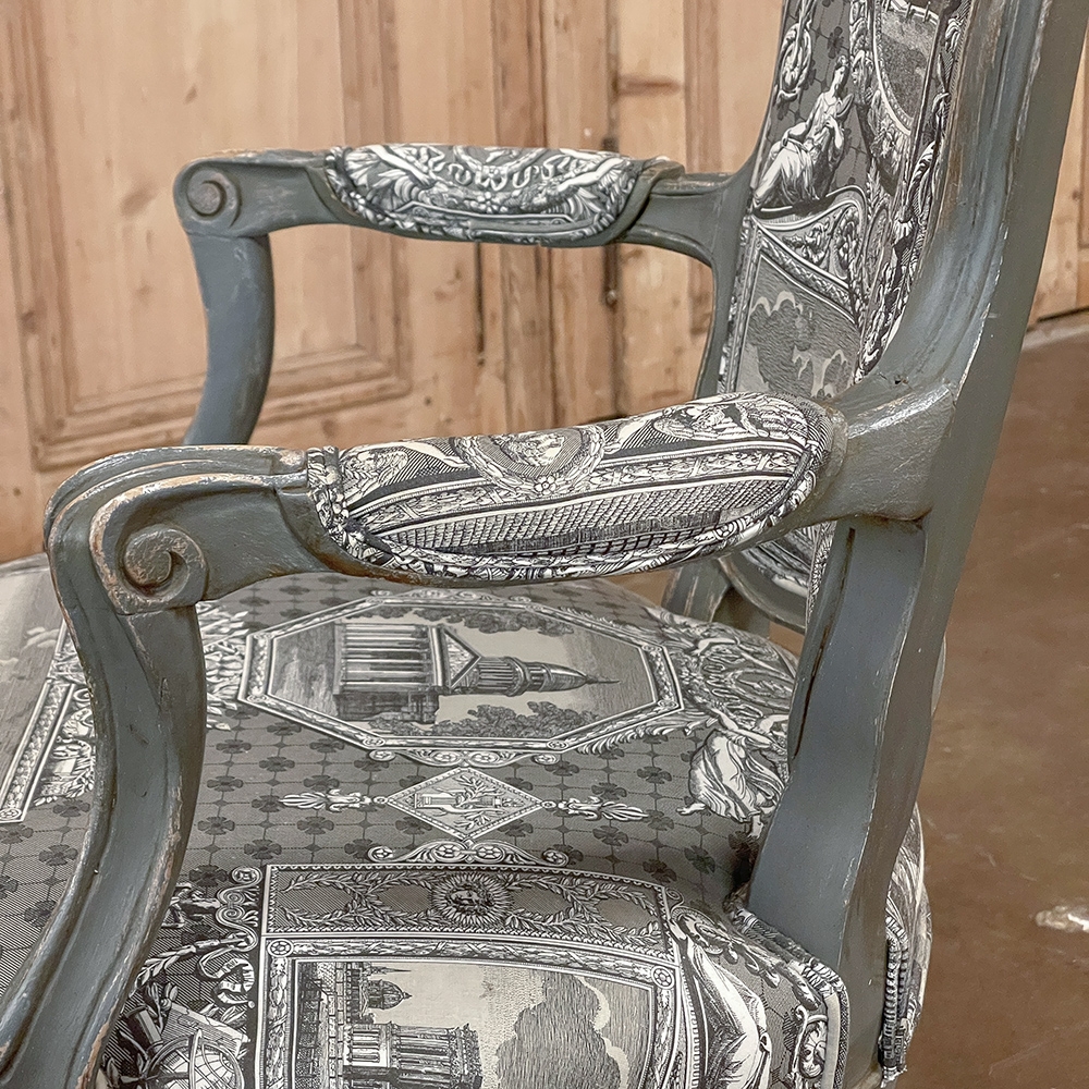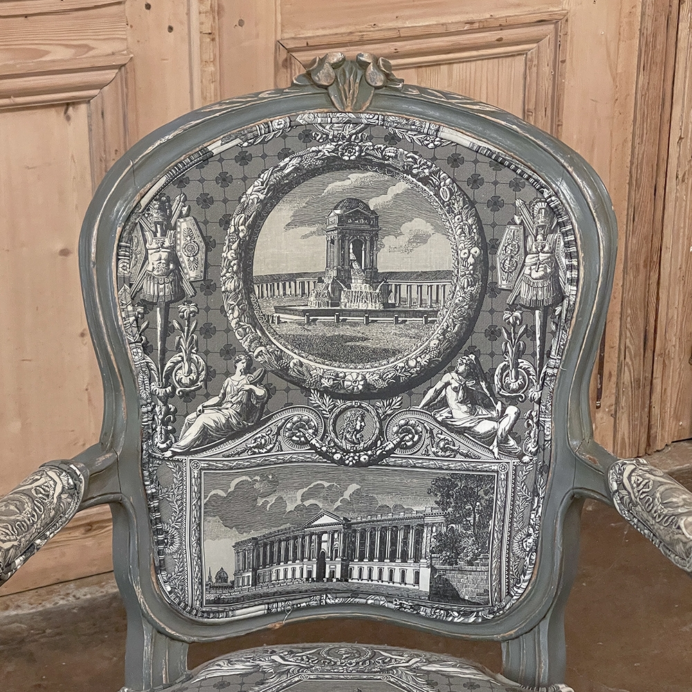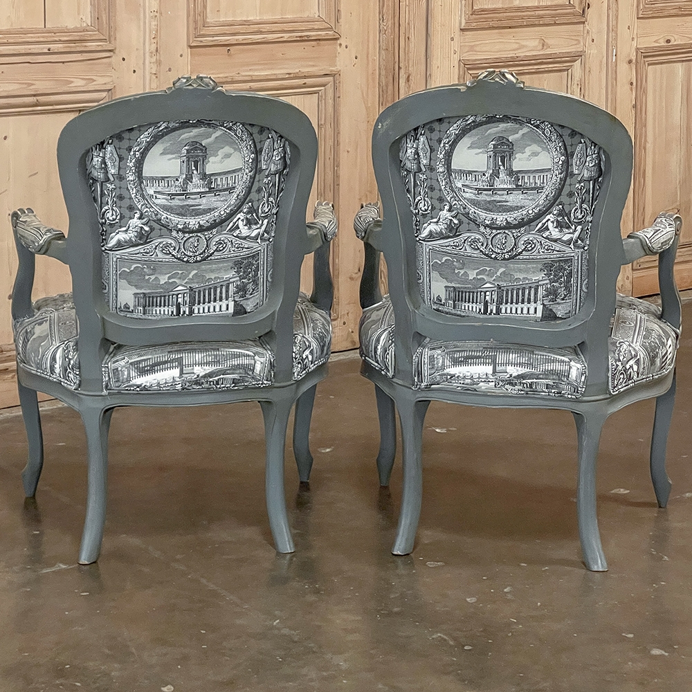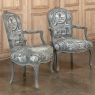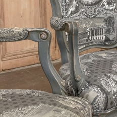 Pair Antique French Painted Louis XV Armchairs ~ Fauteuils will add a visually soft, classic accent to any room, plus surprising comfort in the bargain! Sculpted from solid hardwood in the manner of Louis XV, each features a contoured shield-shaped seat back topped with hand-carved flowers, all connected to padded armrests and a generously sized seat. The seat back is upholstered front and back matching the seat, with a lovely classical gray monotone pattern evoking the grandeur of classic art and architecture in multiple framed panels. The remainder of the framework features elegant scrolled form with fine molded detail, and the apron and legs below are also carved with floral and foliate relief, all of which is enhanced by the hand-painted finish which has achieved a lovely level of patina and aging over the decades.