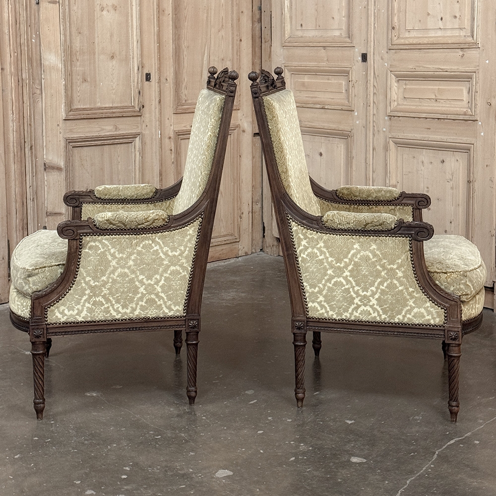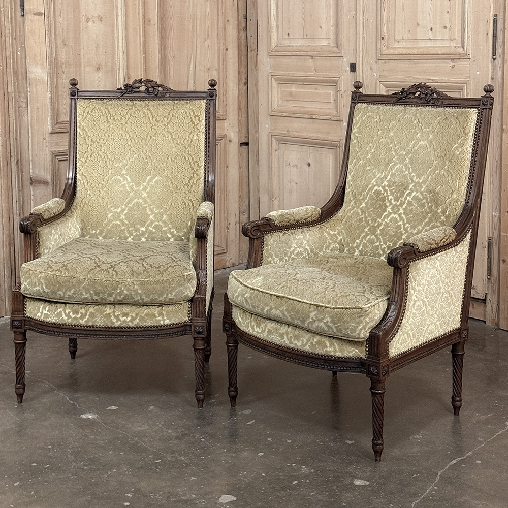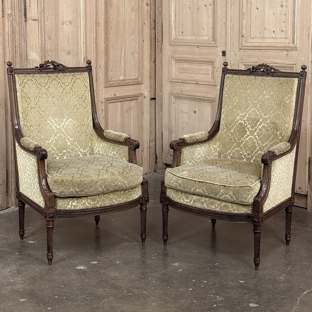 Pair of 19th Century French Louis XVI Walnut Armchairs ~ Bergeres represents the epitome of the neoclassic style! Lovingly hand-crafted from select, sumptuous French walnut, each features a tailored architecture enhanced by scrolled armrest supports, tapered legs, a bowed apron and lavish wood sculpture adornment. Most noticeable is the spray of laurel with ribbon centered on the seat back crown, with pomegranate finials on each corner. Acanthus leaves and scrolls appear on each armrest, with the apron adorned with egg & dart molding accented with rosettes atop the spiral fluted, tapered legs. Upholstery shows age but is of original high quality damascene mohair.