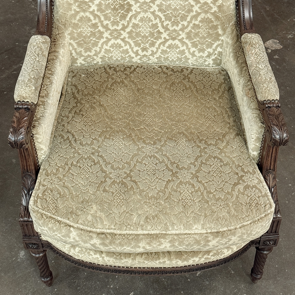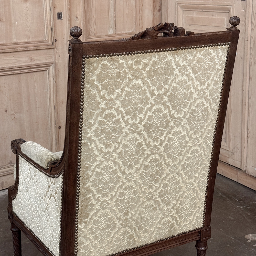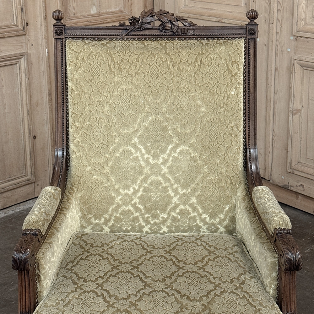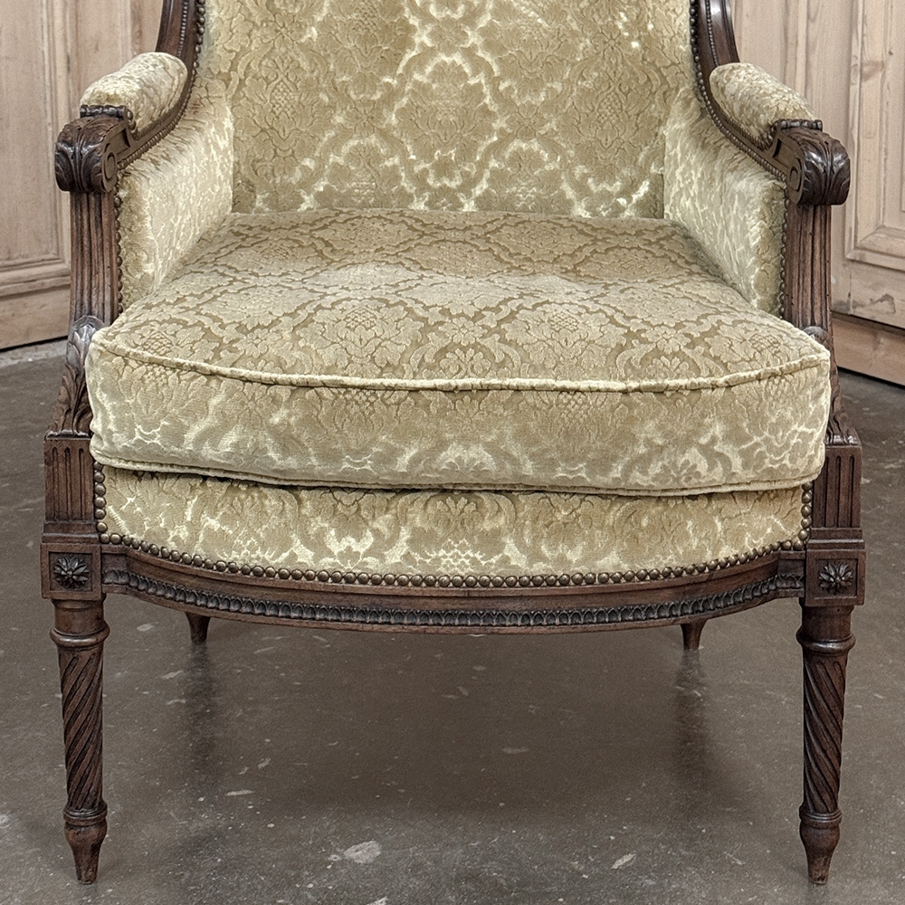 Pair of 19th Century French Louis XVI Walnut Armchairs ~ Bergeres represents the epitome of the neoclassic style! Lovingly hand-crafted from select, sumptuous French walnut, each features a tailored architecture enhanced by scrolled armrest supports, tapered legs, a bowed apron and lavish wood sculpture adornment. Most noticeable is the spray of laurel with ribbon centered on the seat back crown, with pomegranate finials on each corner. Acanthus leaves and scrolls appear on each armrest, with the apron adorned with egg & dart molding accented with rosettes atop the spiral fluted, tapered legs. Upholstery shows age but is of original high quality damascene mohair.