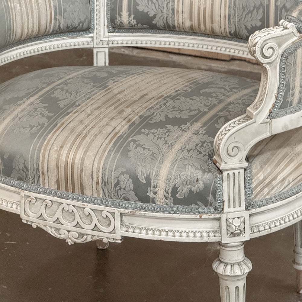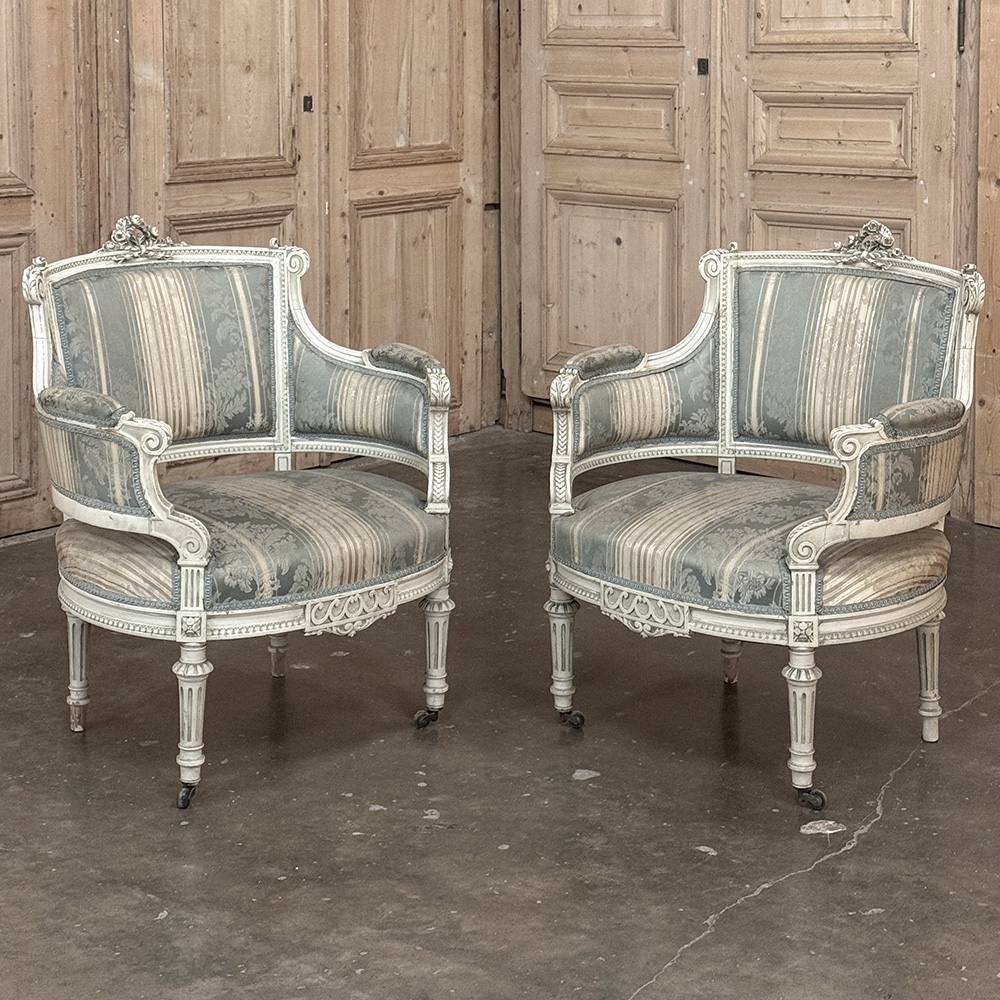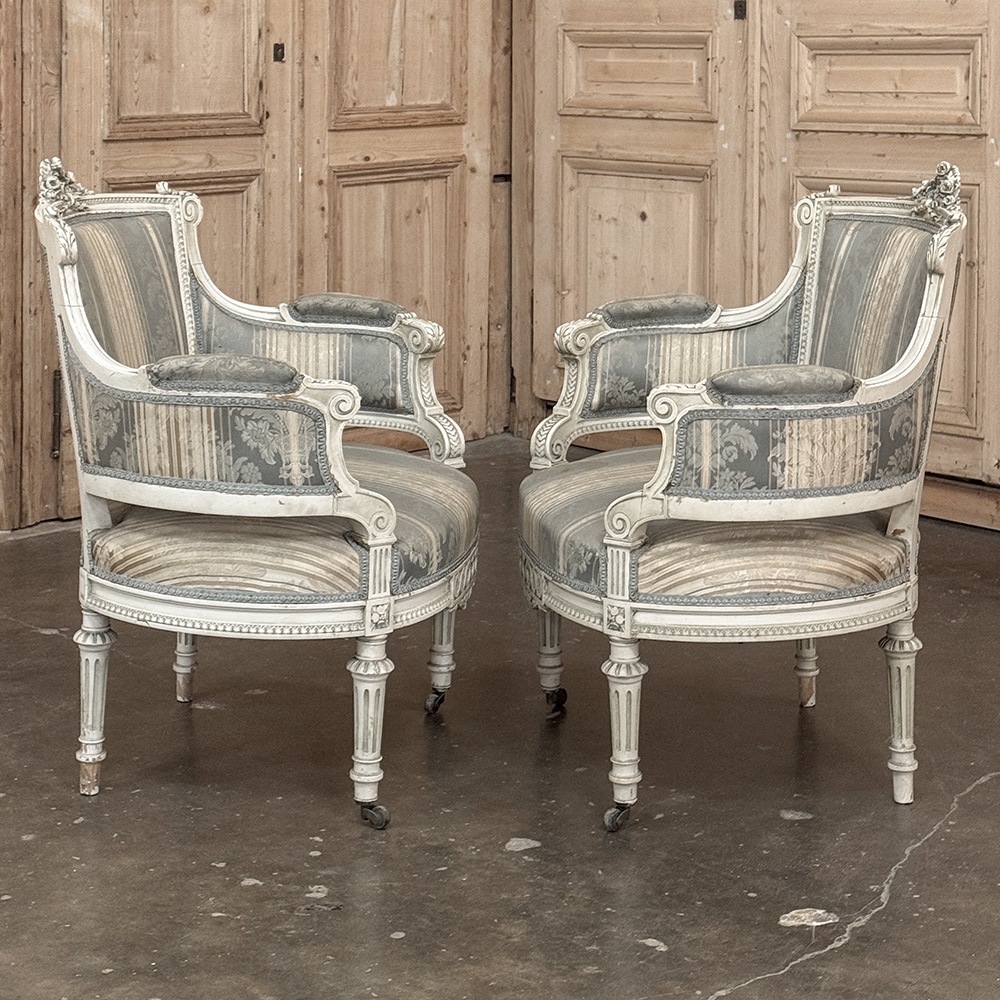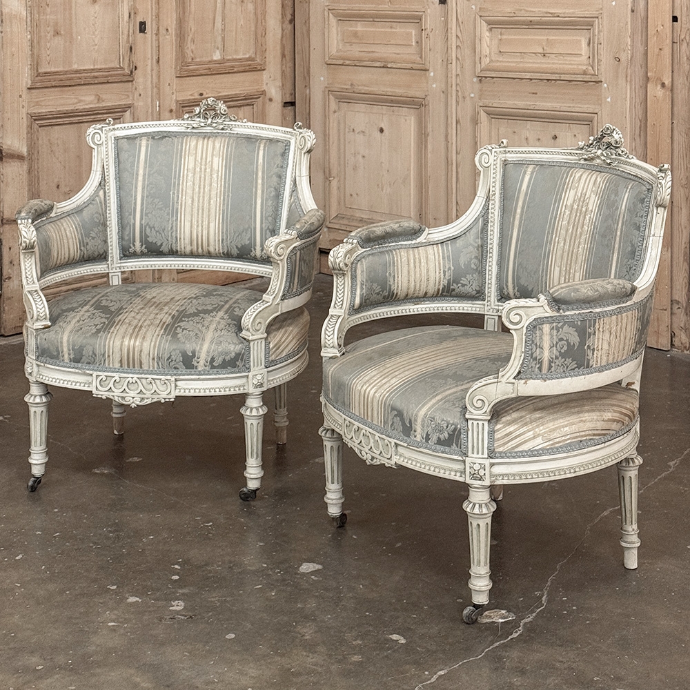 Pair of Louis XVI Painted Bergères is a charming pair, discovered in Paris, embodying the graceful restraint and refinement of French neoclassical design. The frames retain their original painted finish, softly aged to a beautiful patina that only time can create.