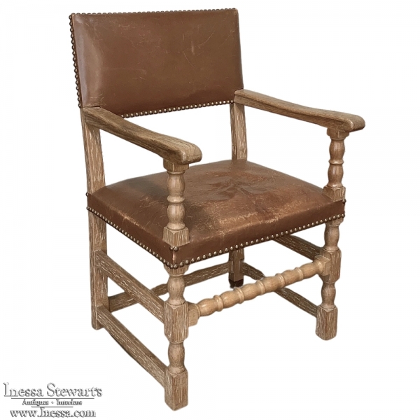 Mid-Century Rustic Country French Ceruse Finish Armchair with Leather.