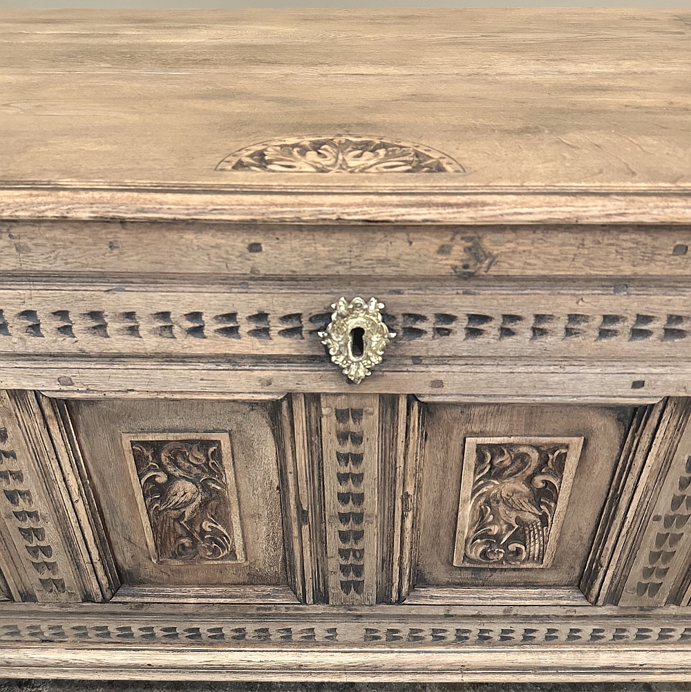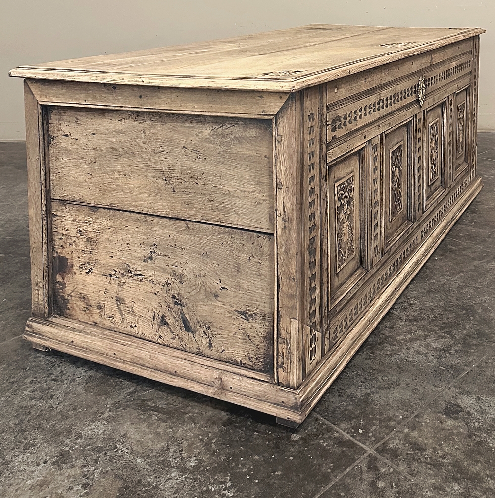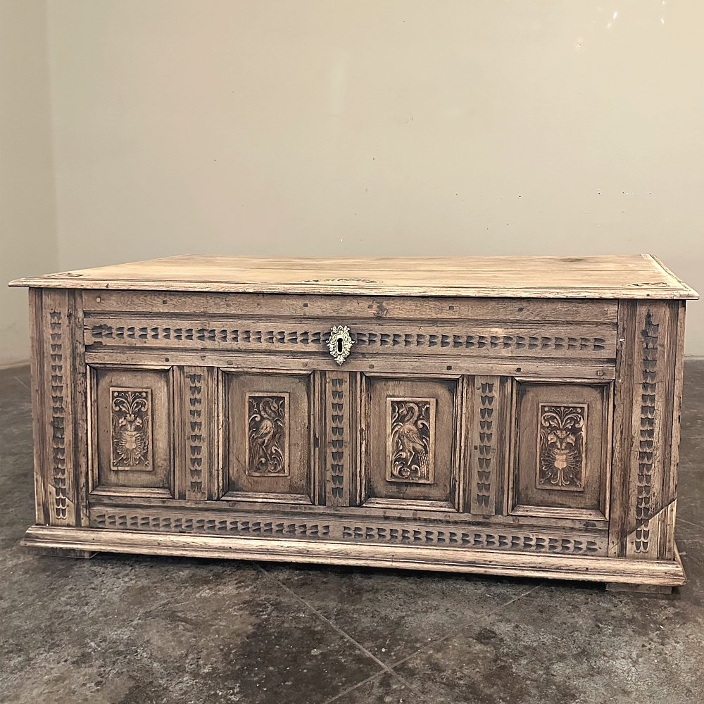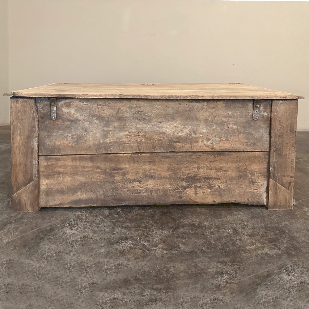 18th Century Country French Stripped Neoclassical Trunk ~ Blanket Chest is a reminder of a bygone era in which none of the modern conveniences we take for granted had been invented or developed! The trunk is considered the first cased furniture, and this example was designed to store large quantities of textiles and family keepsakes, including candles which were a valuable necessity and sometimes even needed to be locked up! Note the photos showing the separate lidded compartment inside where the candles would be kept. Useful as a surface as well, the artisans added a little carved detailing on the top for visual interest, as the piece would have been placed in the family room for all to see and access. Four raised carved panels appear across the front facade, depicting stylized birds and flora. Repeating notches were used to create a bordering design, which appears horizontally across the front above and below, as well as vertically on the corners and separating the carved panels. A cast brass key guard adds a nice touch, and the hinges were forged from solid iron by hand to literally last for centuries! Painstakingly stripped using our proprietary process that retains the patina and sheer natural beauty of the old wood, all performed by our expert in-house staff.