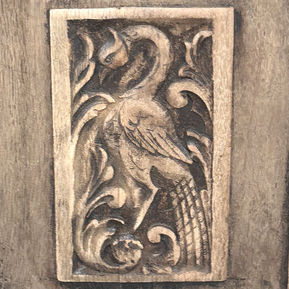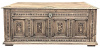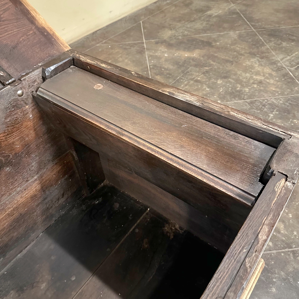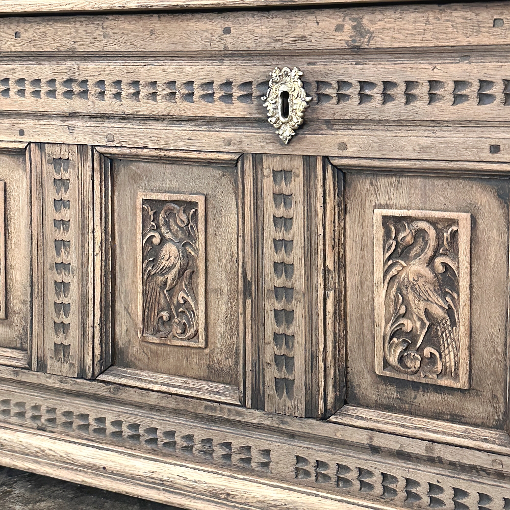 18th Century Country French Stripped Neoclassical Trunk ~ Blanket Chest is a reminder of a bygone era in which none of the modern conveniences we take for granted had been invented or developed! The trunk is considered the first cased furniture, and this example was designed to store large quantities of textiles and family keepsakes, including candles which were a valuable necessity and sometimes even needed to be locked up! Note the photos showing the separate lidded compartment inside where the candles would be kept. Useful as a surface as well, the artisans added a little carved detailing on the top for visual interest, as the piece would have been placed in the family room for all to see and access. Four raised carved panels appear across the front facade, depicting stylized birds and flora. Repeating notches were used to create a bordering design, which appears horizontally across the front above and below, as well as vertically on the corners and separating the carved panels. A cast brass key guard adds a nice touch, and the hinges were forged from solid iron by hand to literally last for centuries! Painstakingly stripped using our proprietary process that retains the patina and sheer natural beauty of the old wood, all performed by our expert in-house staff.