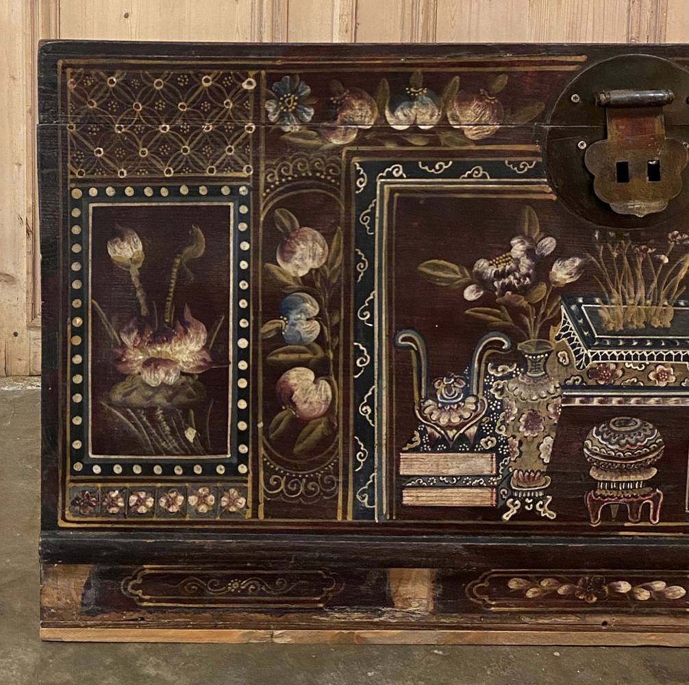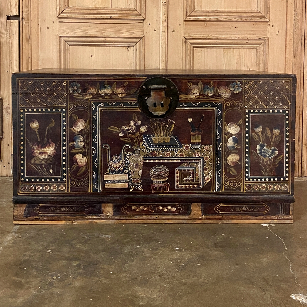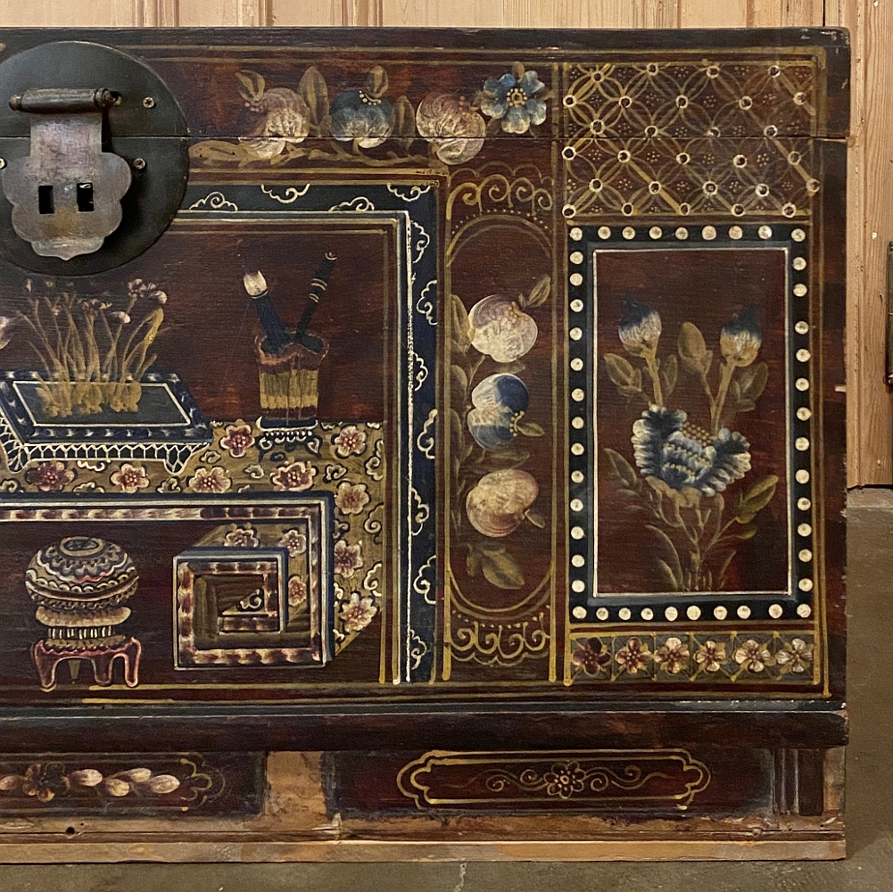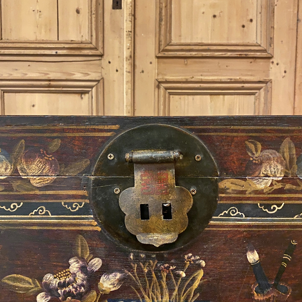 Sale19th Century Antique Hand-Painted Trunk will make a charming selection as a coffee table, storage and a seat at the foot of the bed, or anywhere a rustic and whimsical family keepsake is needed! Constructed of solid pine, it features copious storage inside, and a colorful decorative scheme on the facade in subtle earth tones.