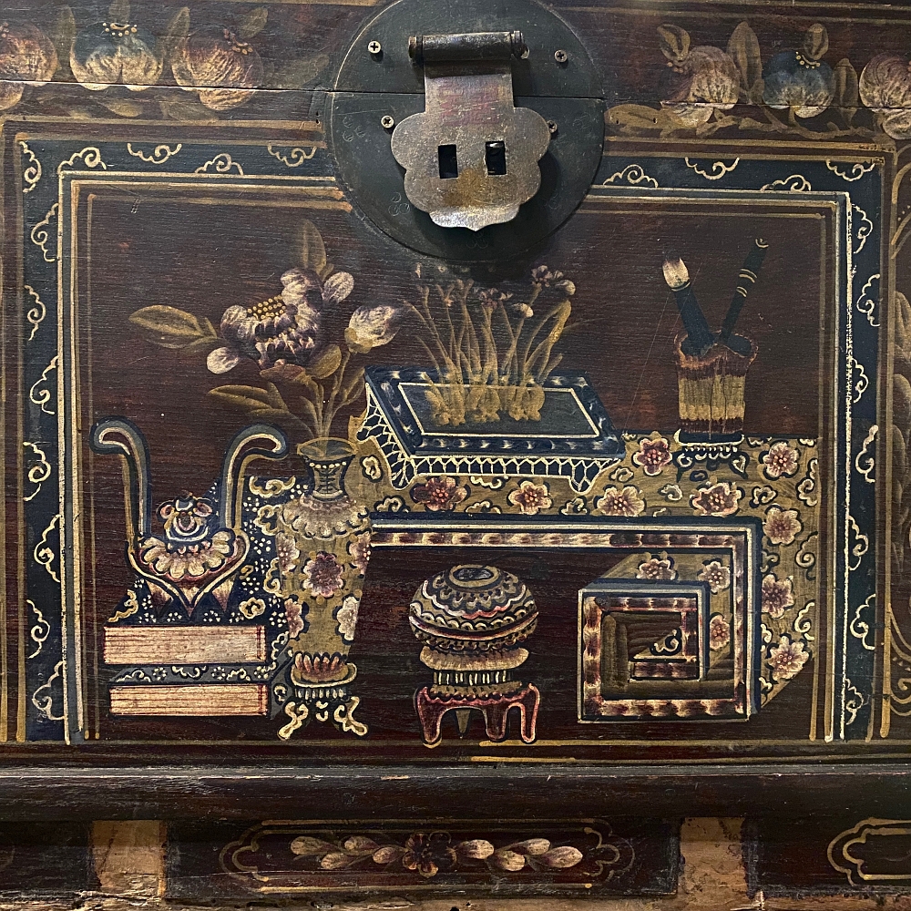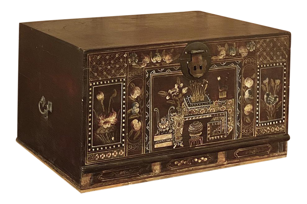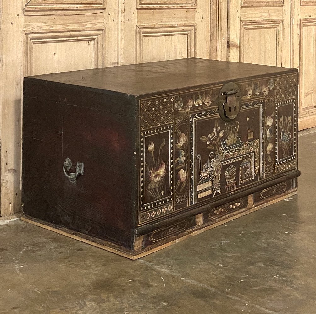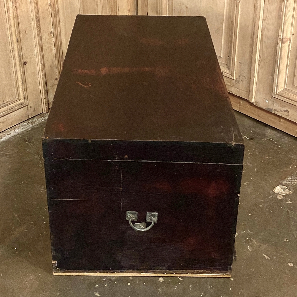 Sale19th Century Antique Hand-Painted Trunk will make a charming selection as a coffee table, storage and a seat at the foot of the bed, or anywhere a rustic and whimsical family keepsake is needed! Constructed of solid pine, it features copious storage inside, and a colorful decorative scheme on the facade in subtle earth tones.