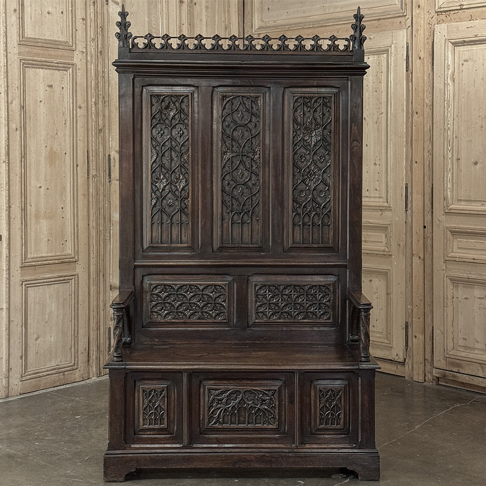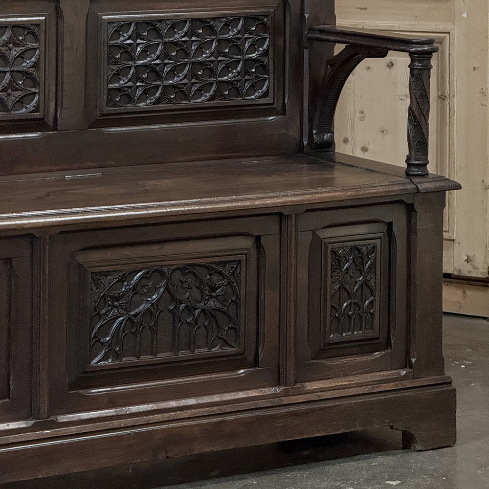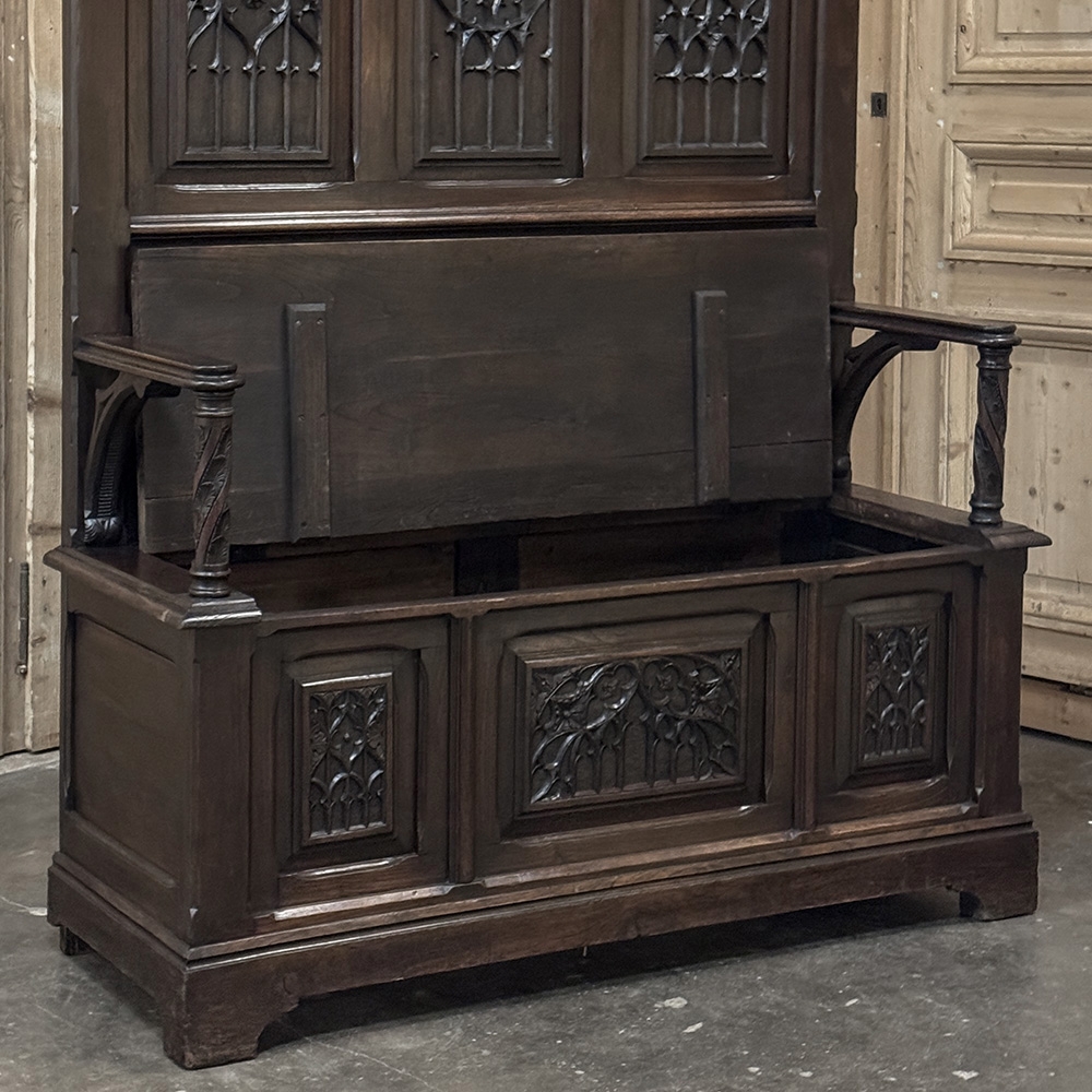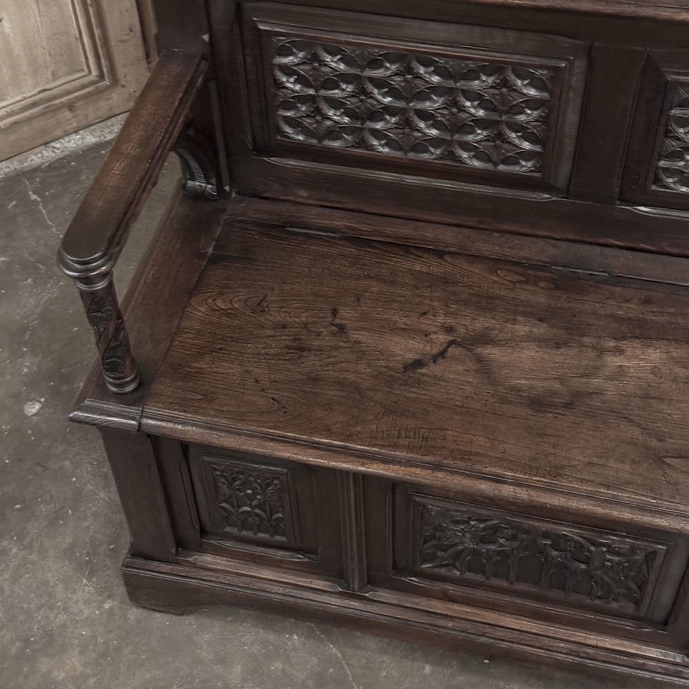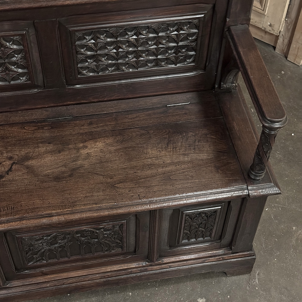 19th Century French Gothic Hall Bench with Trunk is a stately example of the genre which dates back to the middle of the 12th century in France! Hand-crafted from solid oak, it features a high seat back to create an impressive visual effect that overlooks a bench with armrests. The high seat of the trunk portion indicates it was made for taller folks than typical of the time period, which works out great for us in the 21st century. The seat lifts up to reveal surprising storage. Three unique vertical panels adorn the upper seatback, with two matching horizontal panels below that, and three panels on the trunk facade with two matching flanking a center panel. All the carving is in full relief and bas relief for a stunning effect. Even the armrests feature carved supports. A pediment base completes the look. Imagine how impressive this will look in your entry way or hall!