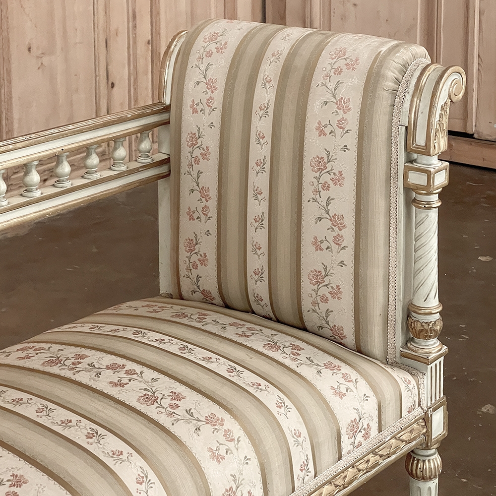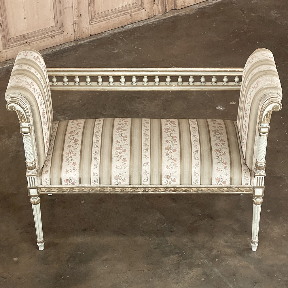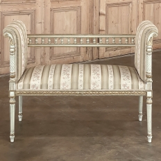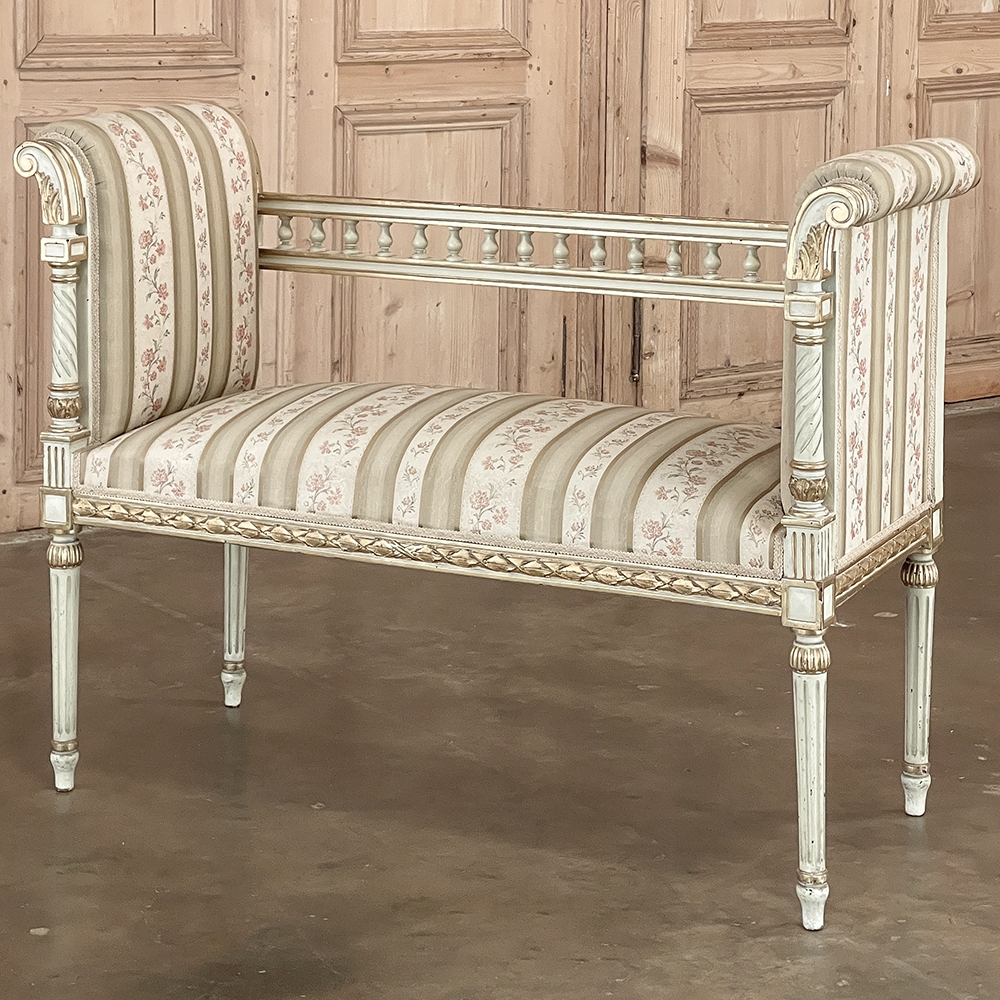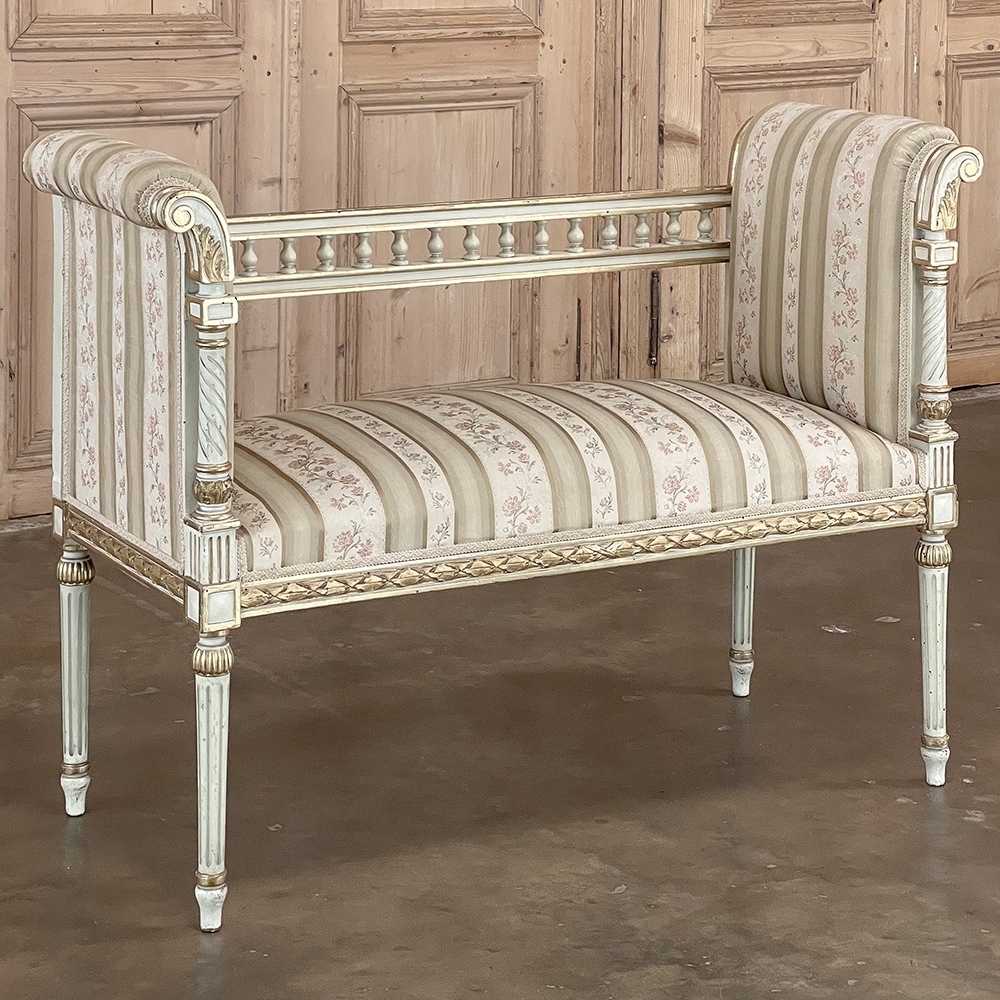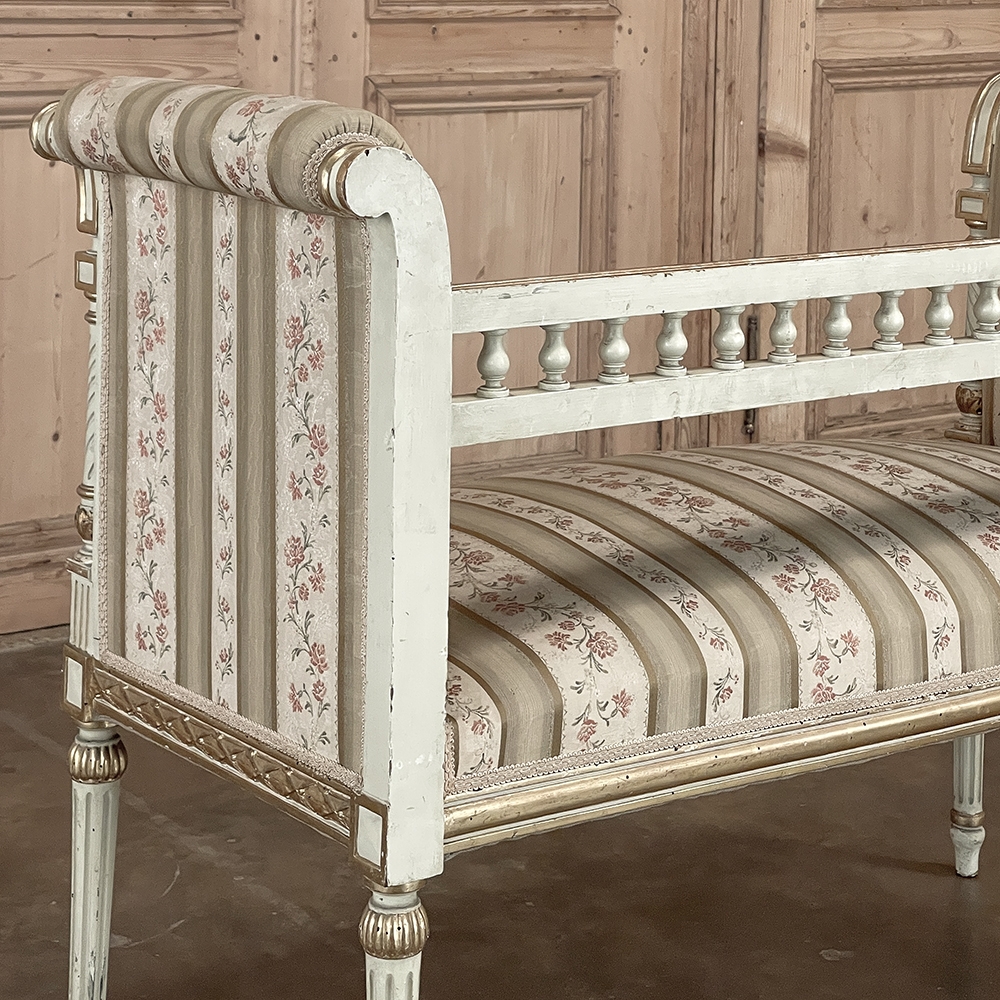 19th Century French Louis XVI Neoclassical Painted Armbench ~ Vanity Bench was originally designed for the vanity, but its versatility allows it anywhere a convenient seat is required that does not take up much room. The spirit of the neoclassical revival is evident in the styling and architecture of the piece, with just a subtle hint of ancient Egyptian influence on the tops of the uprights blending with the ancient Greek and Roman motifs that pervade the design. The armrests are rolled over and fully upholstered down to the bench seat, all of which are covered in a luxurious pattern silk fabric that remains in very serviceable condition. A most unusual design aspect is the suspended gallery rail across the back that provides structural enhancement with stylistic flair, comprised of turned spindles framed above and below like a baluster. Banded laurels are carved into the apron in front on the same horizontal plane as the gallery rail, while the remainder of the elements are vertical, and include acanthus plumes, scrolls, spiral fluting and tapered legs with straight flutes and teardrop feet. The painted finish has achieved a lovely patina, especially with the gold highlighting on the carved accents to create an opulent yet timeless effect. Finished on all sides for placement even in the middle of the room!