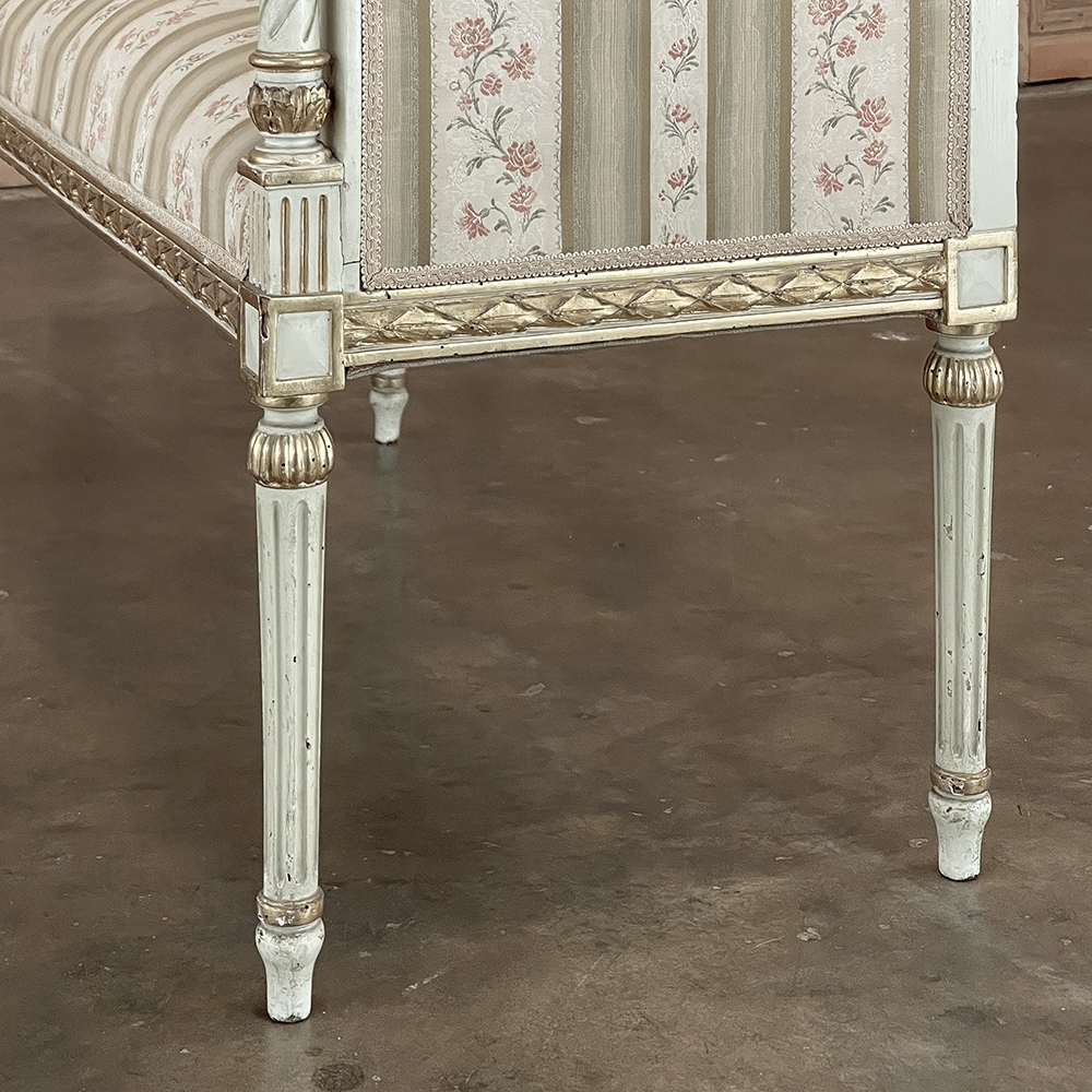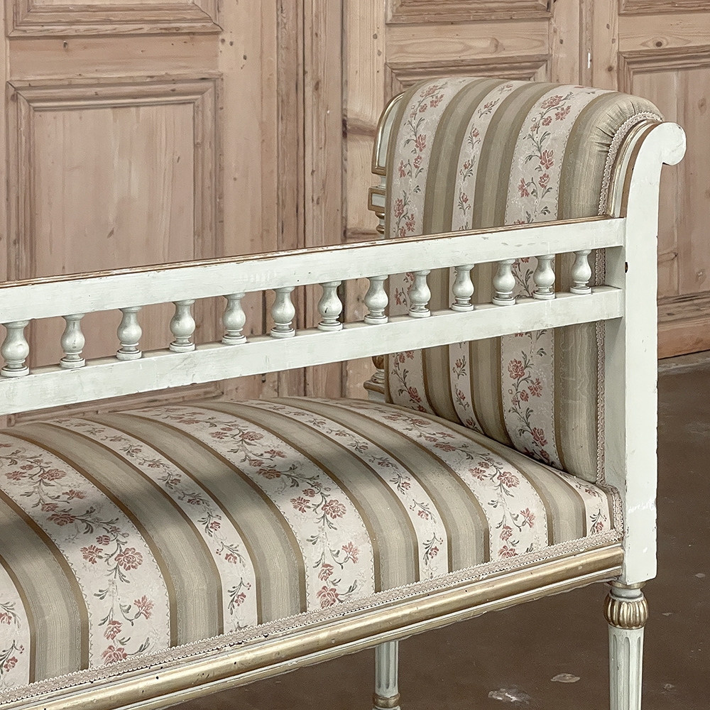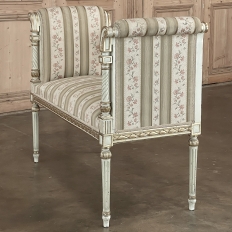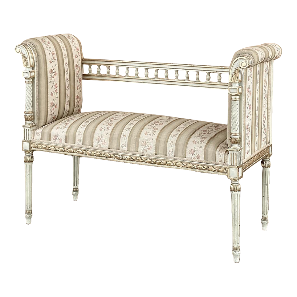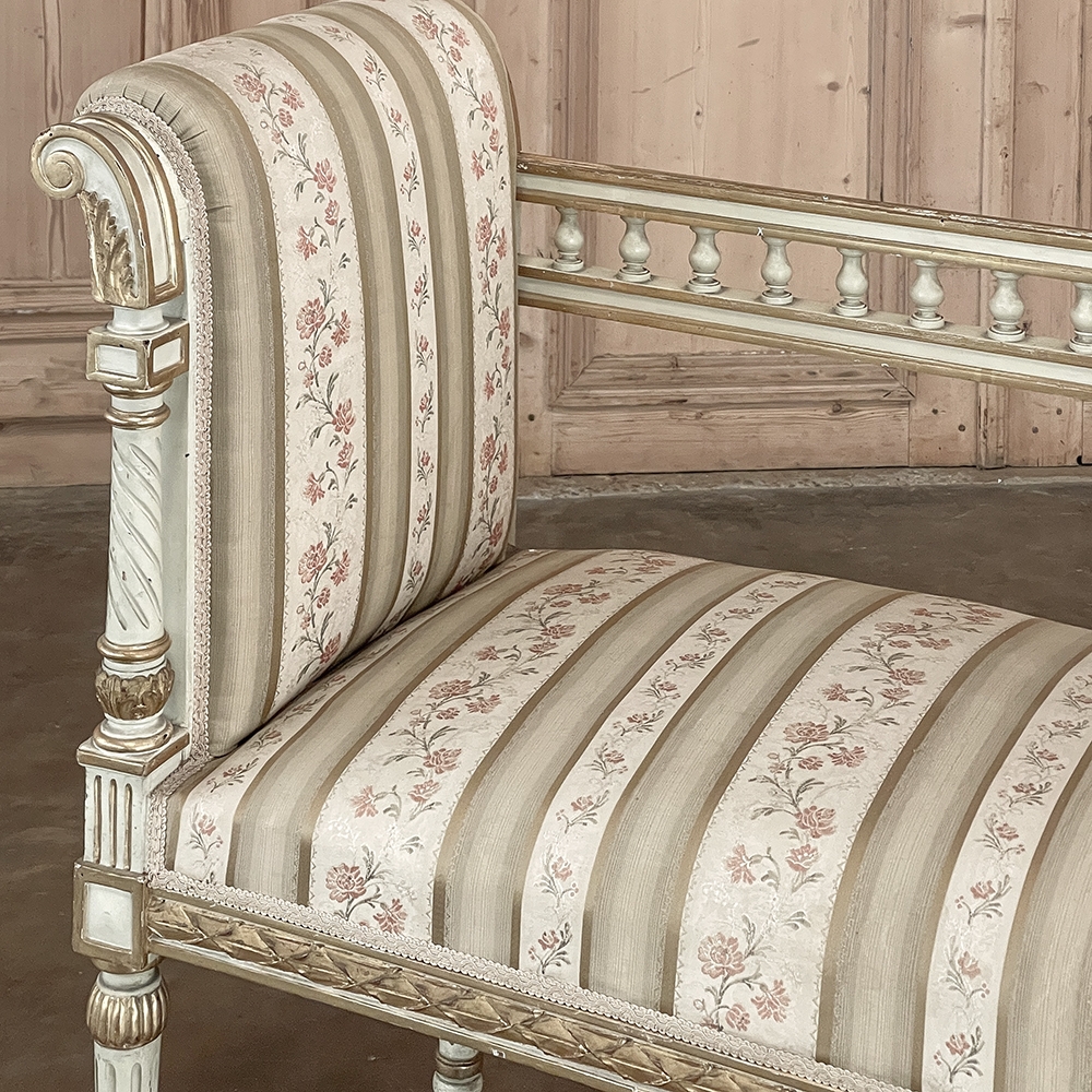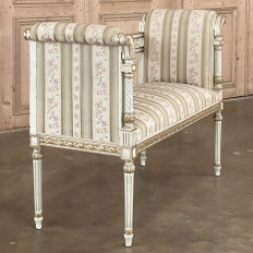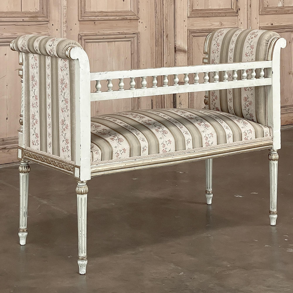 19th Century French Louis XVI Neoclassical Painted Armbench ~ Vanity Bench was originally designed for the vanity, but its versatility allows it anywhere a convenient seat is required that does not take up much room. The spirit of the neoclassical revival is evident in the styling and architecture of the piece, with just a subtle hint of ancient Egyptian influence on the tops of the uprights blending with the ancient Greek and Roman motifs that pervade the design. The armrests are rolled over and fully upholstered down to the bench seat, all of which are covered in a luxurious pattern silk fabric that remains in very serviceable condition. A most unusual design aspect is the suspended gallery rail across the back that provides structural enhancement with stylistic flair, comprised of turned spindles framed above and below like a baluster. Banded laurels are carved into the apron in front on the same horizontal plane as the gallery rail, while the remainder of the elements are vertical, and include acanthus plumes, scrolls, spiral fluting and tapered legs with straight flutes and teardrop feet. The painted finish has achieved a lovely patina, especially with the gold highlighting on the carved accents to create an opulent yet timeless effect. Finished on all sides for placement even in the middle of the room!