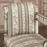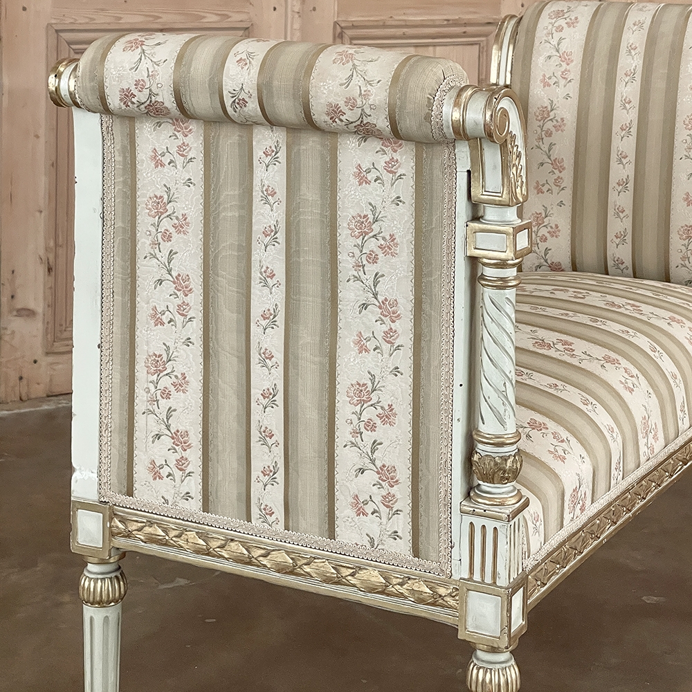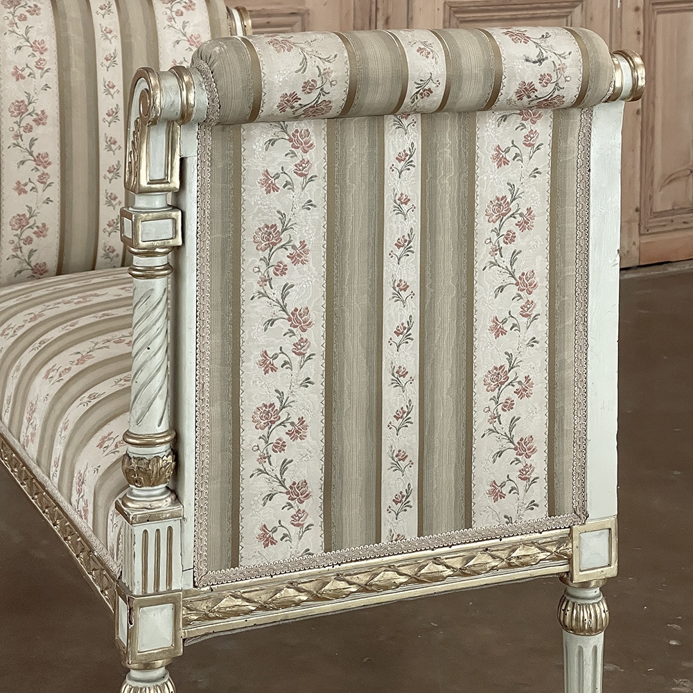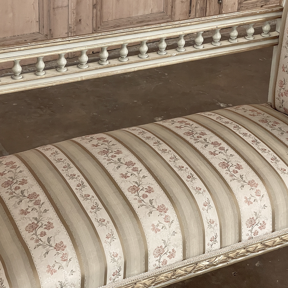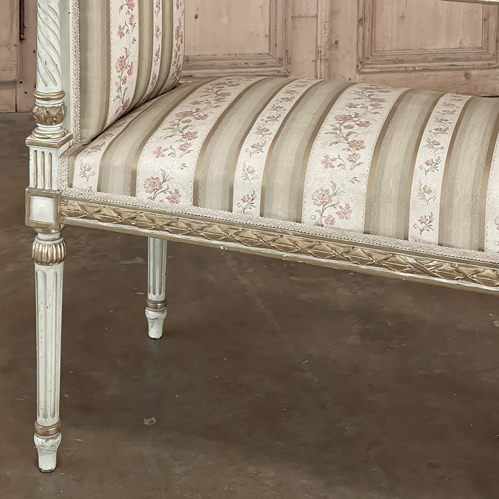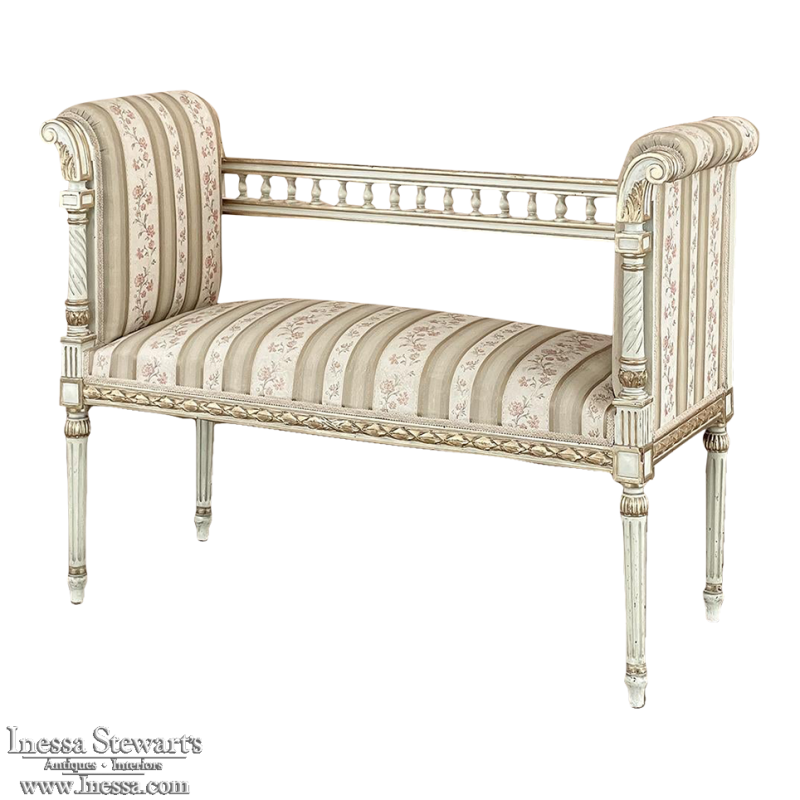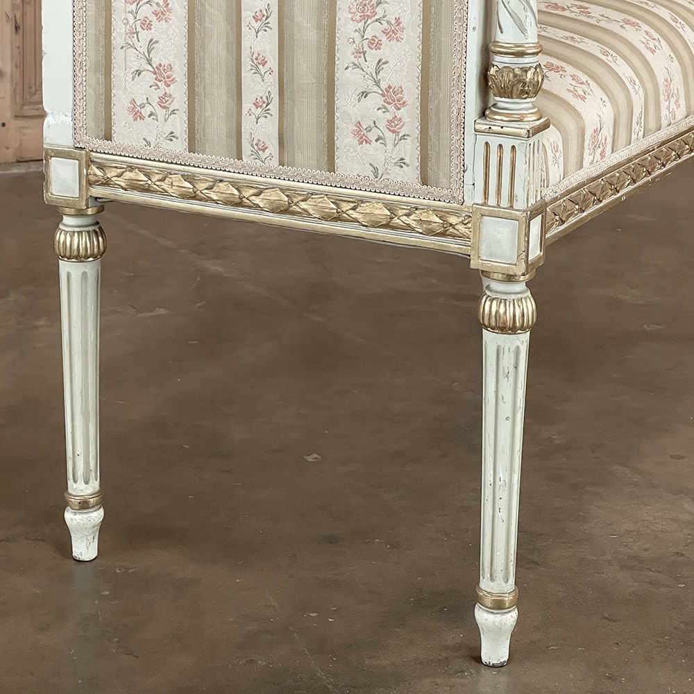 19th Century French Louis XVI Neoclassical Painted Armbench ~ Vanity Bench was originally designed for the vanity, but its versatility allows it anywhere a convenient seat is required that does not take up much room. The spirit of the neoclassical revival is evident in the styling and architecture of the piece, with just a subtle hint of ancient Egyptian influence on the tops of the uprights blending with the ancient Greek and Roman motifs that pervade the design. The armrests are rolled over and fully upholstered down to the bench seat, all of which are covered in a luxurious pattern silk fabric that remains in very serviceable condition. A most unusual design aspect is the suspended gallery rail across the back that provides structural enhancement with stylistic flair, comprised of turned spindles framed above and below like a baluster. Banded laurels are carved into the apron in front on the same horizontal plane as the gallery rail, while the remainder of the elements are vertical, and include acanthus plumes, scrolls, spiral fluting and tapered legs with straight flutes and teardrop feet. The painted finish has achieved a lovely patina, especially with the gold highlighting on the carved accents to create an opulent yet timeless effect. Finished on all sides for placement even in the middle of the room!