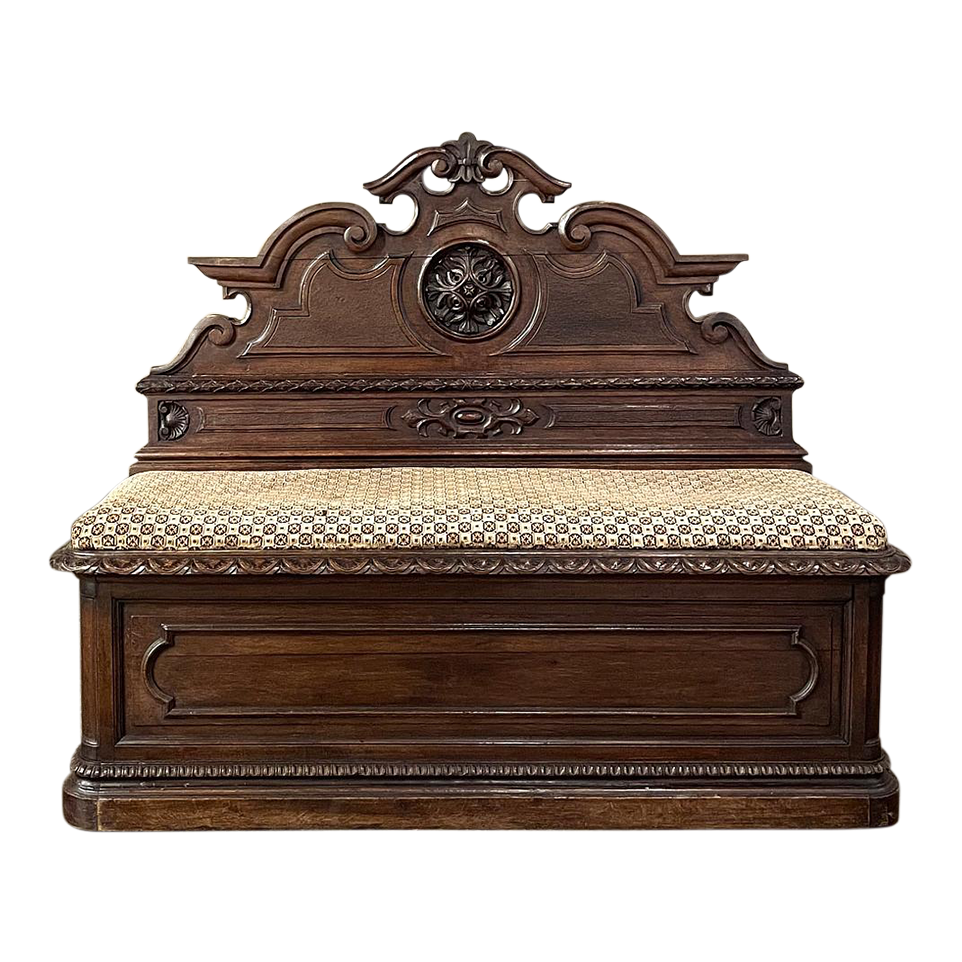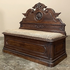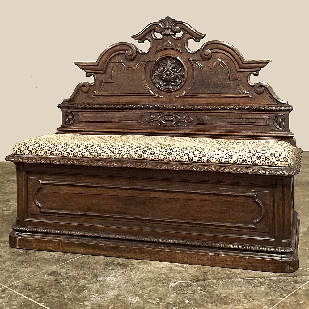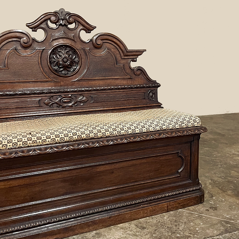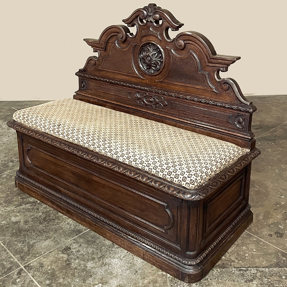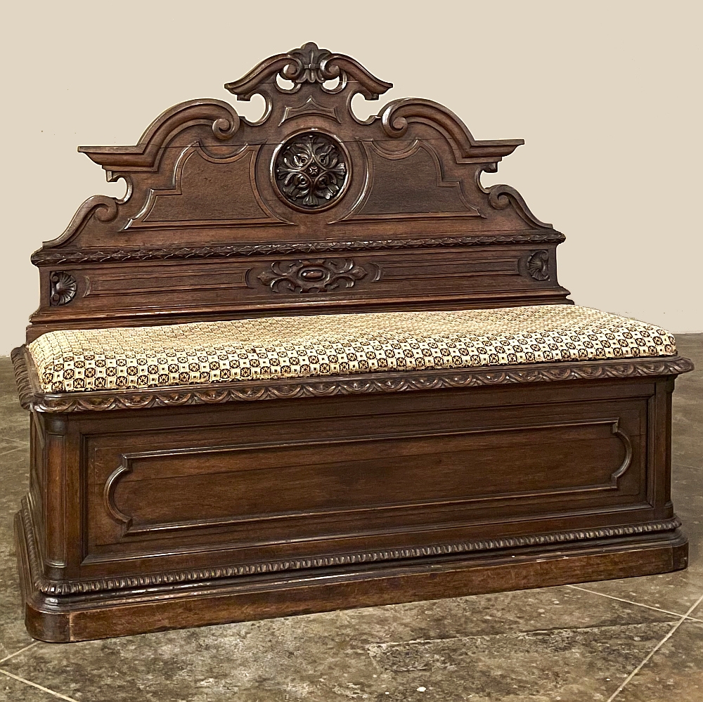 Sale19th Century French Napoleon III Period Walnut Hall Bench is the ideal choice to greet your visitors and guests in style! Designed to provide a comfy waiting area for friends and callers to wait while the host or hostess is able to come to the foyer to greet them, such benches predate the telephone and internet, so no advance notice was possible other than expensive courier. This example, rendered in the neoclassical style with definite attributions to ancient Greek and Roman architecture, features a triple arched crown with bold scrollwork centered at the top with a stylized fleur de lys. A large full relief rosette appears under the crown, providing a stunning focal point. Below the scrollwork appears a separately molded tier embellished with foliates and rosettes, leading the eye to the upholstered and comfy full width seat, which is framed by demilune gadrooning all around. The tailored lines of the trunk below allude to the classical design, with fine molding and a bold base board. The padded & upholstered seat opens up to reveal the storage within, which comes in quite handy as there's no such thing as too much storage!
