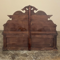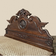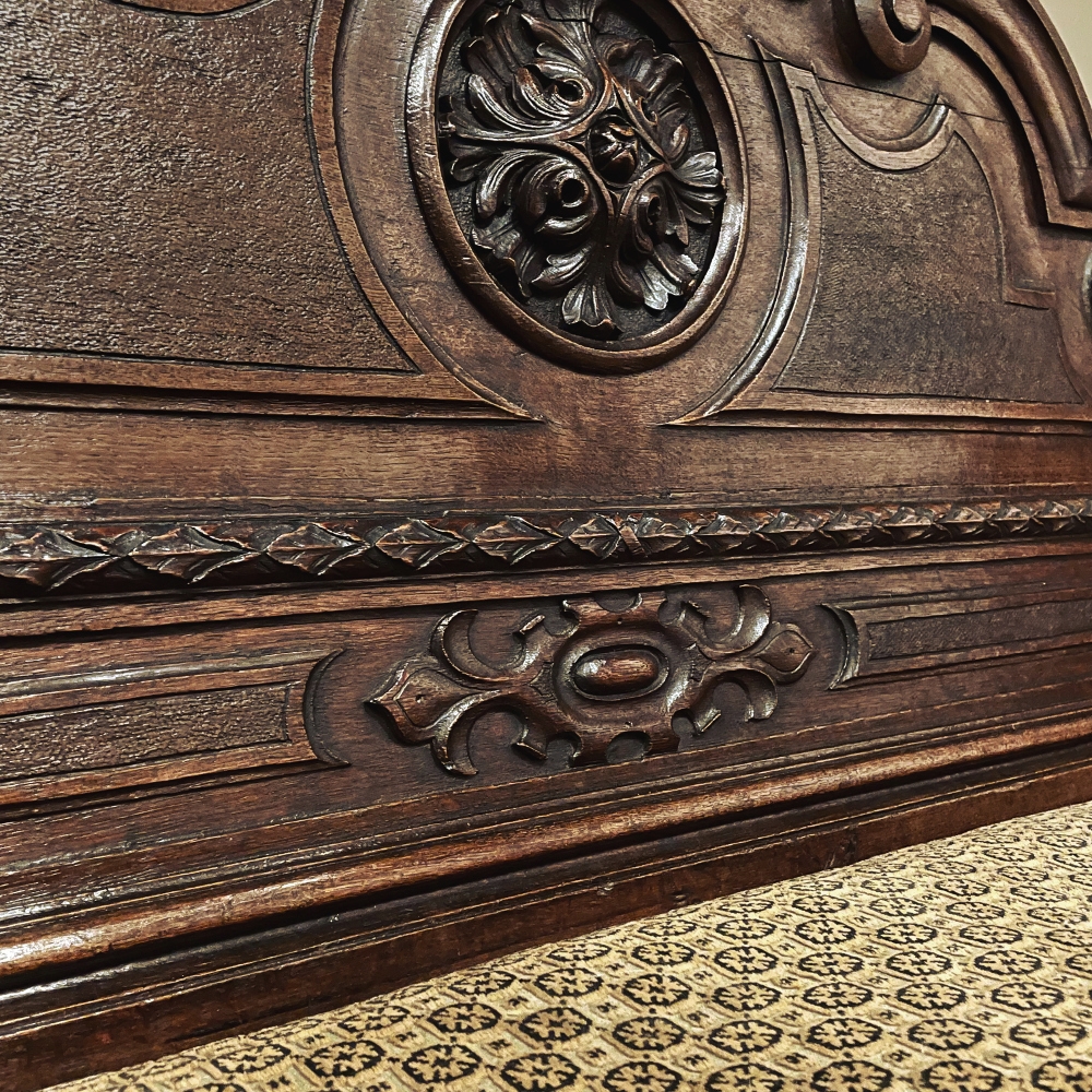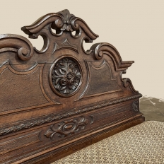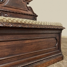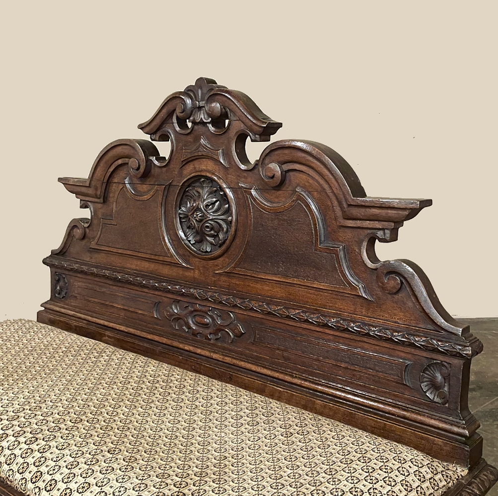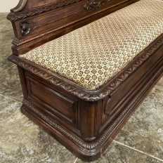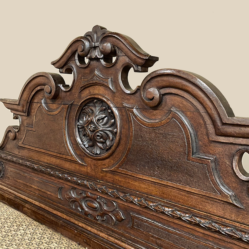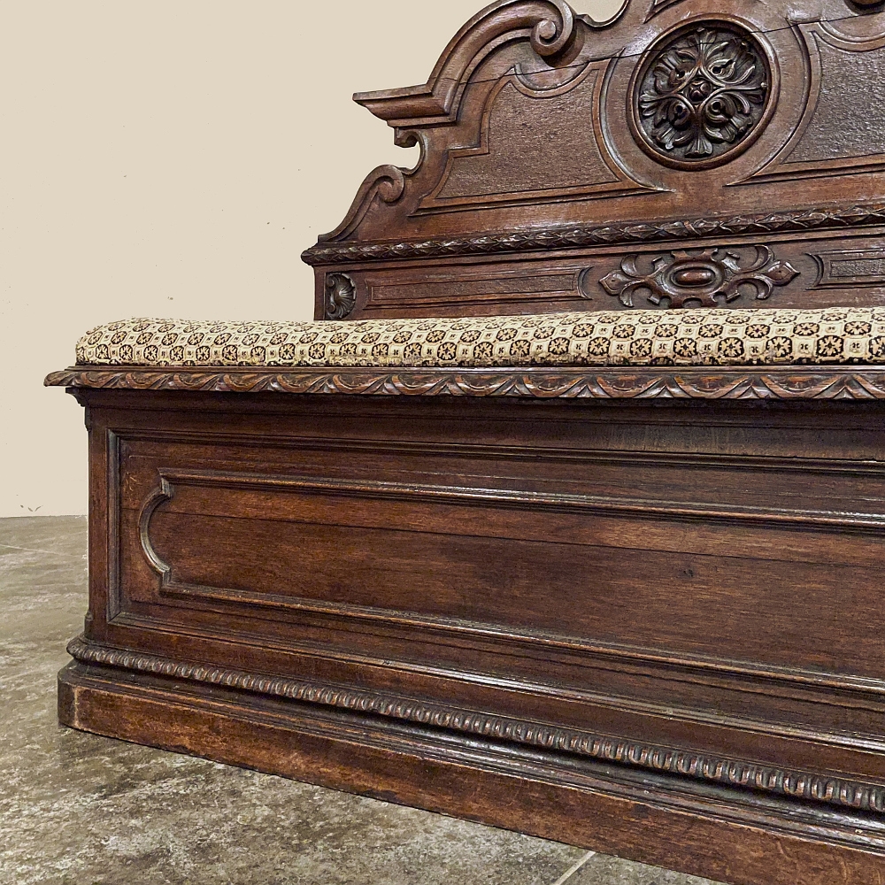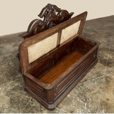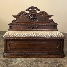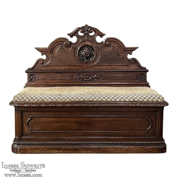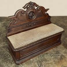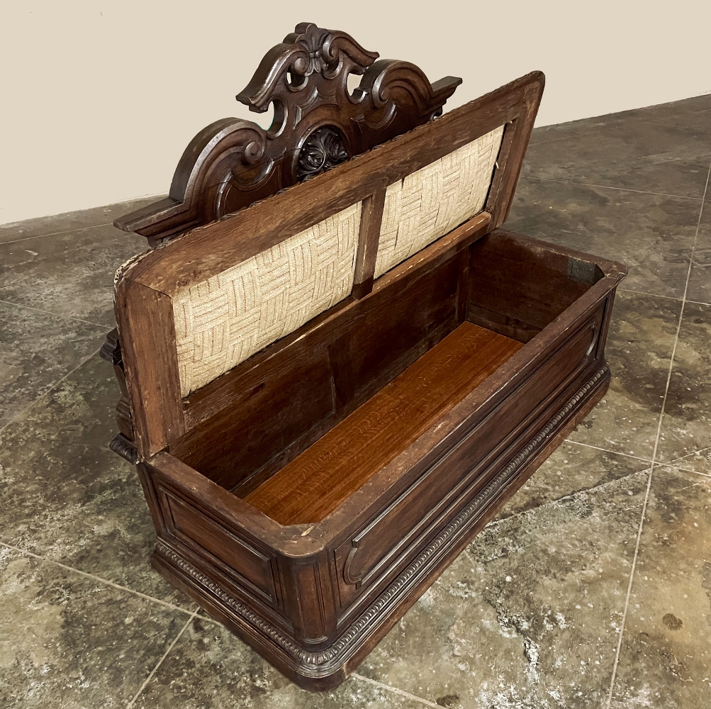 Sale19th Century French Napoleon III Period Walnut Hall Bench is the ideal choice to greet your visitors and guests in style! Designed to provide a comfy waiting area for friends and callers to wait while the host or hostess is able to come to the foyer to greet them, such benches predate the telephone and internet, so no advance notice was possible other than expensive courier. This example, rendered in the neoclassical style with definite attributions to ancient Greek and Roman architecture, features a triple arched crown with bold scrollwork centered at the top with a stylized fleur de lys. A large full relief rosette appears under the crown, providing a stunning focal point. Below the scrollwork appears a separately molded tier embellished with foliates and rosettes, leading the eye to the upholstered and comfy full width seat, which is framed by demilune gadrooning all around. The tailored lines of the trunk below allude to the classical design, with fine molding and a bold base board. The padded & upholstered seat opens up to reveal the storage within, which comes in quite handy as there's no such thing as too much storage!