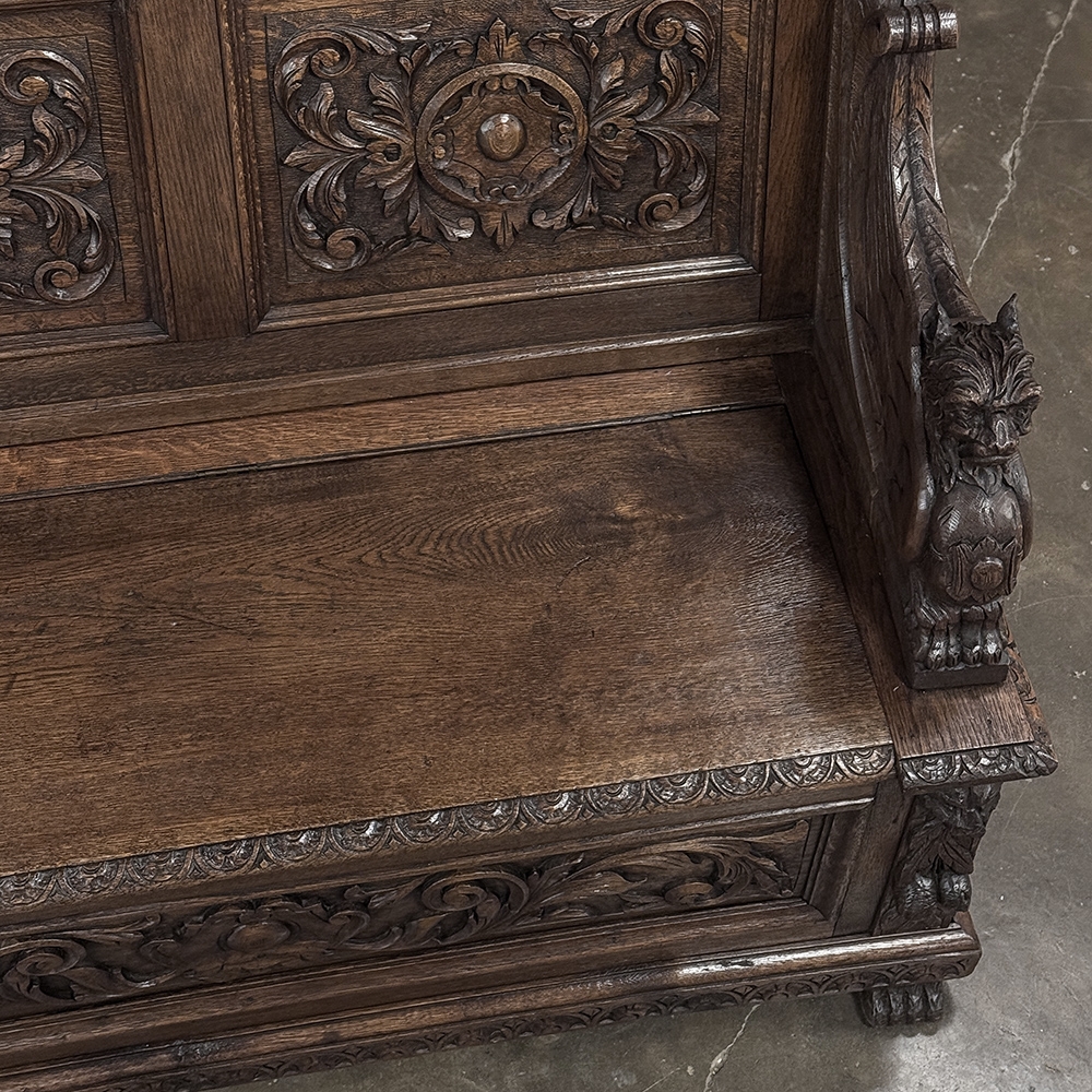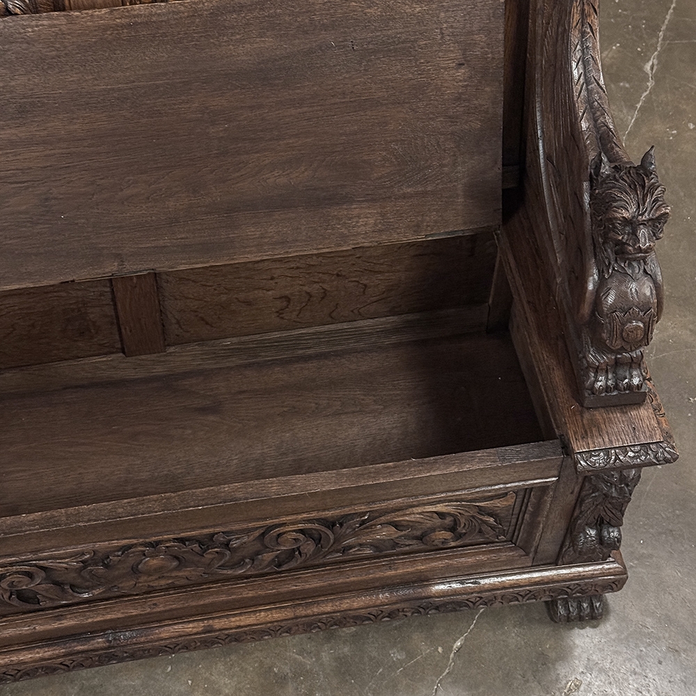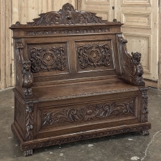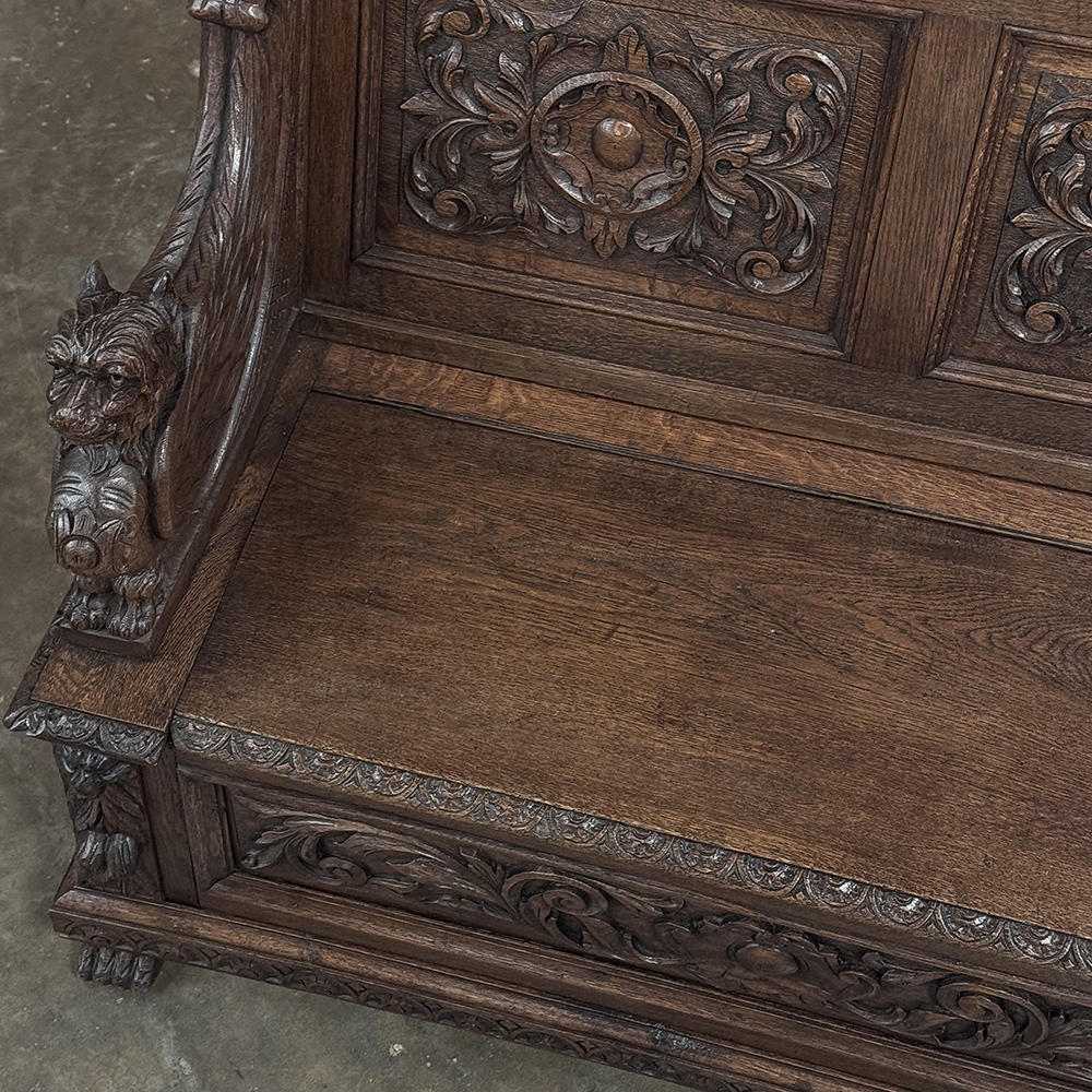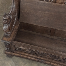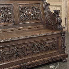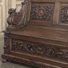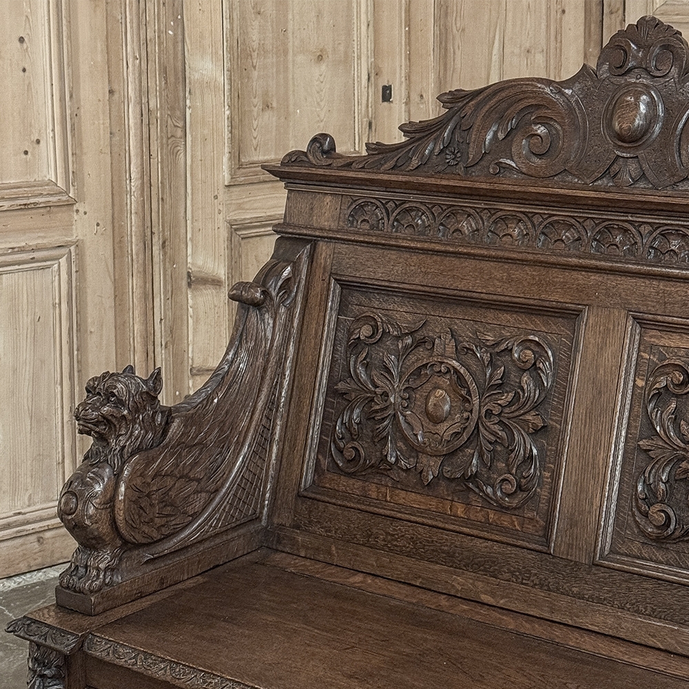 19th Century French Renaissance Hall Bench represents the peak of the Renaissance Revival during the middle of the 1800s in Europe. Artfully sculpted from solid old-growth oak, it features an unusual canted seat back providing more comfort than most. Such benches came to be as waiting places for visitors to a home. In the days before telephones, one simply stopped by and waited until the host was available to visit. Over time the genre developed into the elaborate expression you see here, designed to impress anyone who entered the home. From the elaborately carved crown with heraldic crest to the pair of seat back panels to the lower panel across the bench itself, the carving is amazing. Even the armrests which depict gryffins, are works of art. Even the lower side panels have received the attentions of the wood sculptor's art. The plank seat hinges up to provide a modicum of storage.