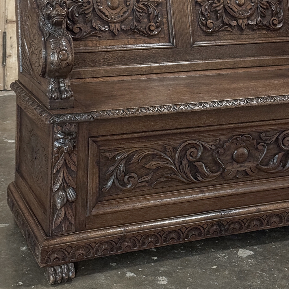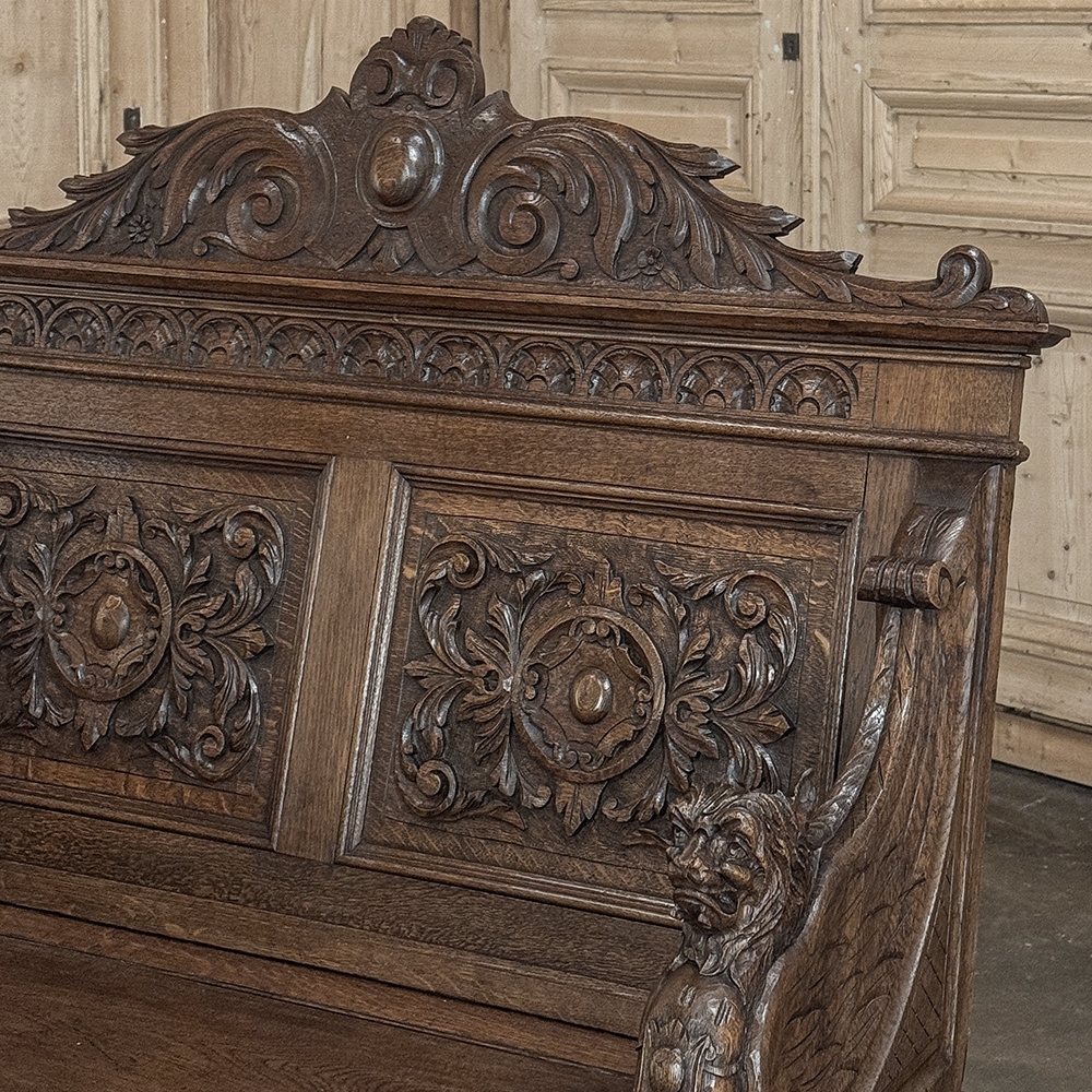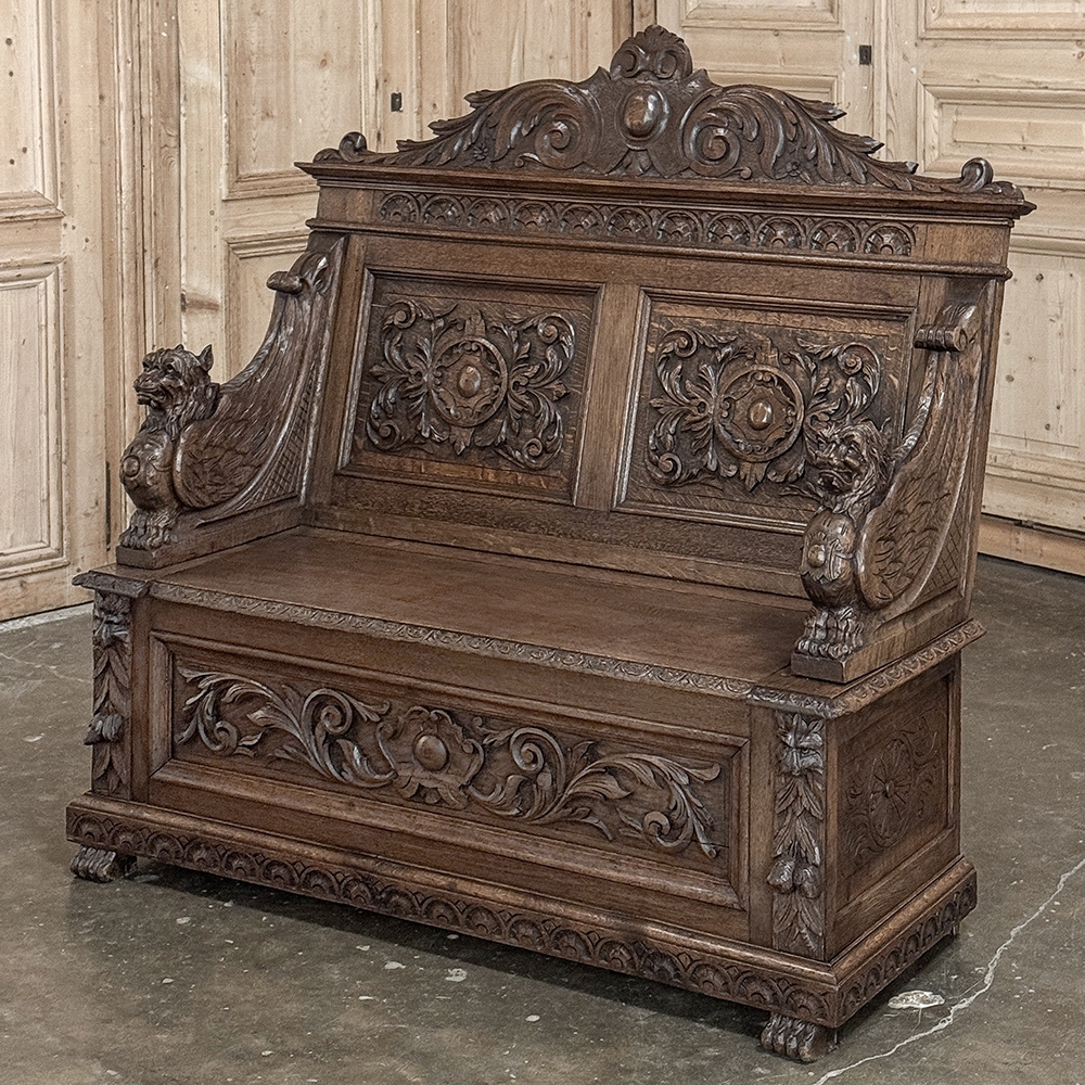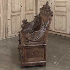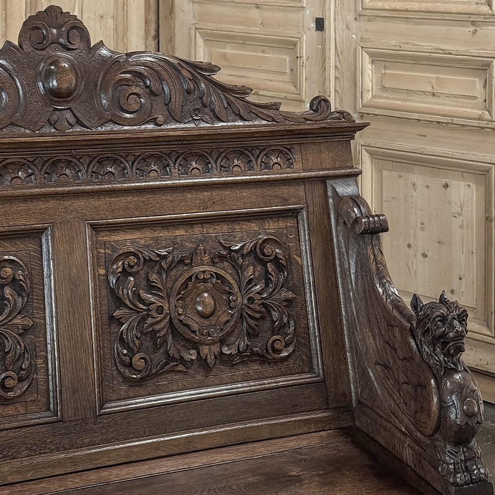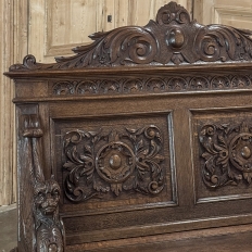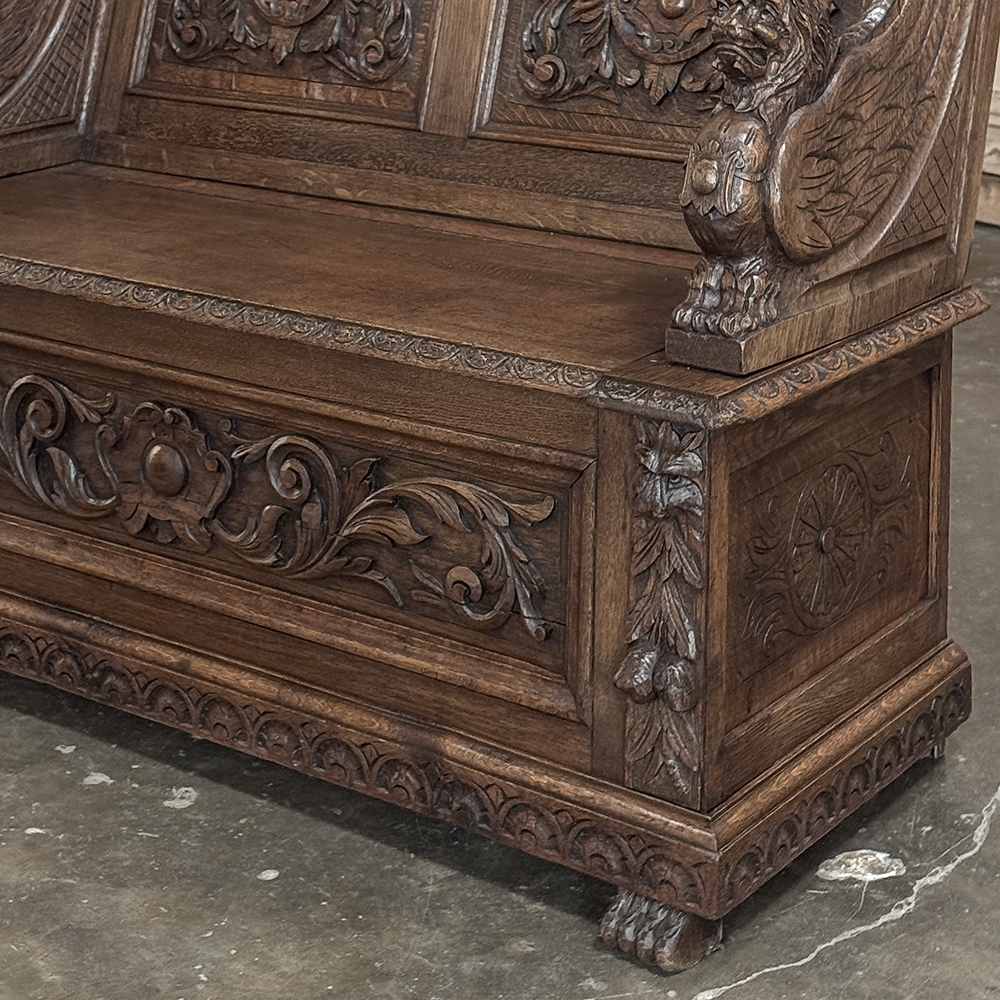 19th Century French Renaissance Hall Bench represents the peak of the Renaissance Revival during the middle of the 1800s in Europe. Artfully sculpted from solid old-growth oak, it features an unusual canted seat back providing more comfort than most. Such benches came to be as waiting places for visitors to a home. In the days before telephones, one simply stopped by and waited until the host was available to visit. Over time the genre developed into the elaborate expression you see here, designed to impress anyone who entered the home. From the elaborately carved crown with heraldic crest to the pair of seat back panels to the lower panel across the bench itself, the carving is amazing. Even the armrests which depict gryffins, are works of art. Even the lower side panels have received the attentions of the wood sculptor's art. The plank seat hinges up to provide a modicum of storage.