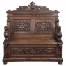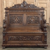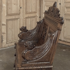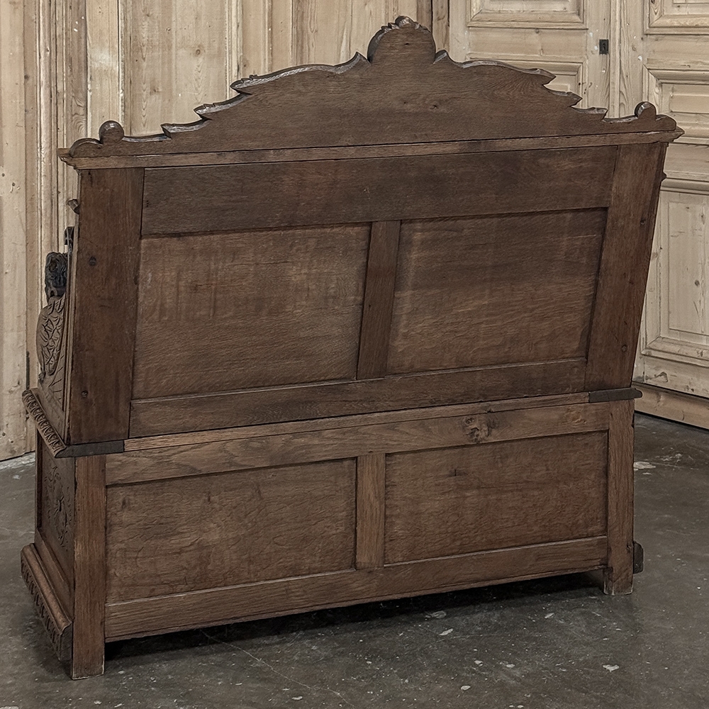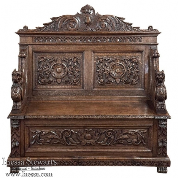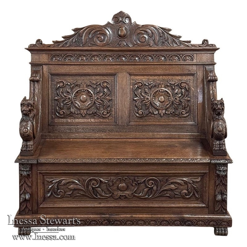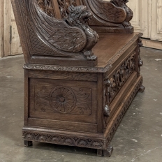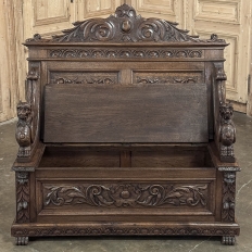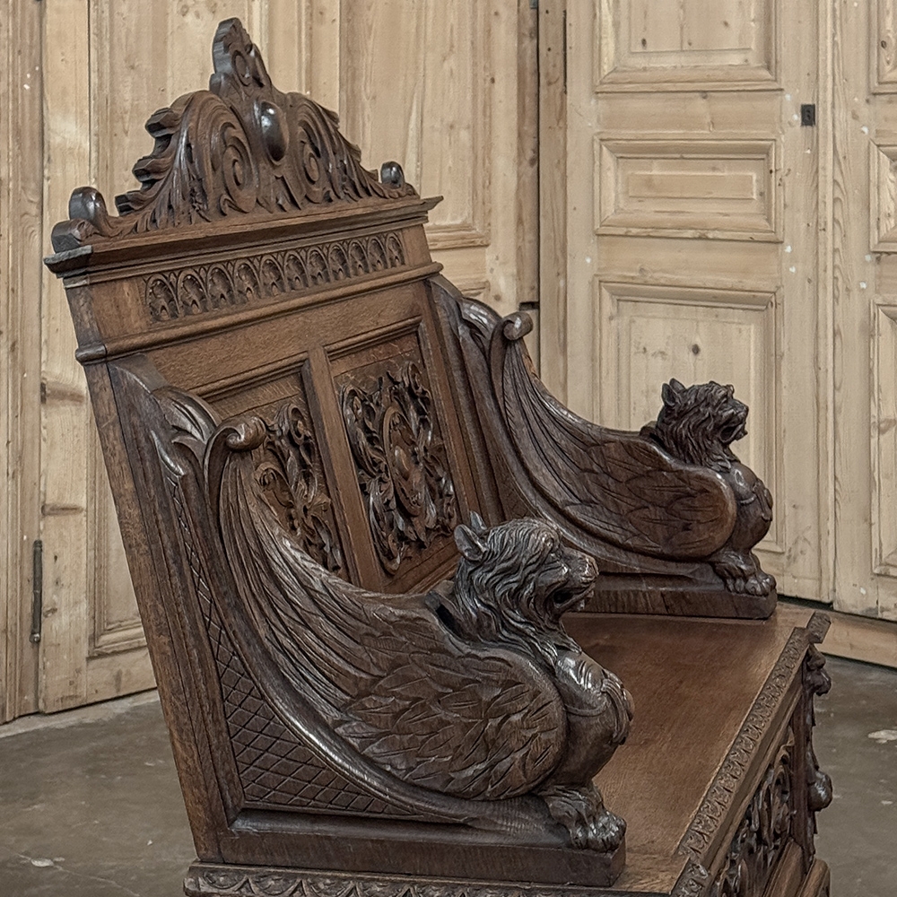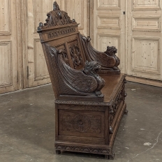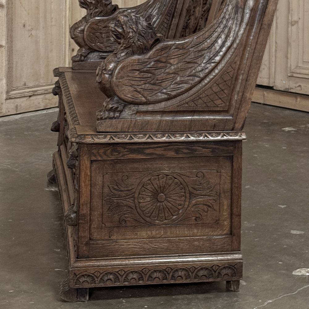 19th Century French Renaissance Hall Bench represents the peak of the Renaissance Revival during the middle of the 1800s in Europe. Artfully sculpted from solid old-growth oak, it features an unusual canted seat back providing more comfort than most. Such benches came to be as waiting places for visitors to a home. In the days before telephones, one simply stopped by and waited until the host was available to visit. Over time the genre developed into the elaborate expression you see here, designed to impress anyone who entered the home. From the elaborately carved crown with heraldic crest to the pair of seat back panels to the lower panel across the bench itself, the carving is amazing. Even the armrests which depict gryffins, are works of art. Even the lower side panels have received the attentions of the wood sculptor's art. The plank seat hinges up to provide a modicum of storage.