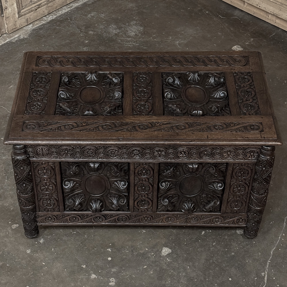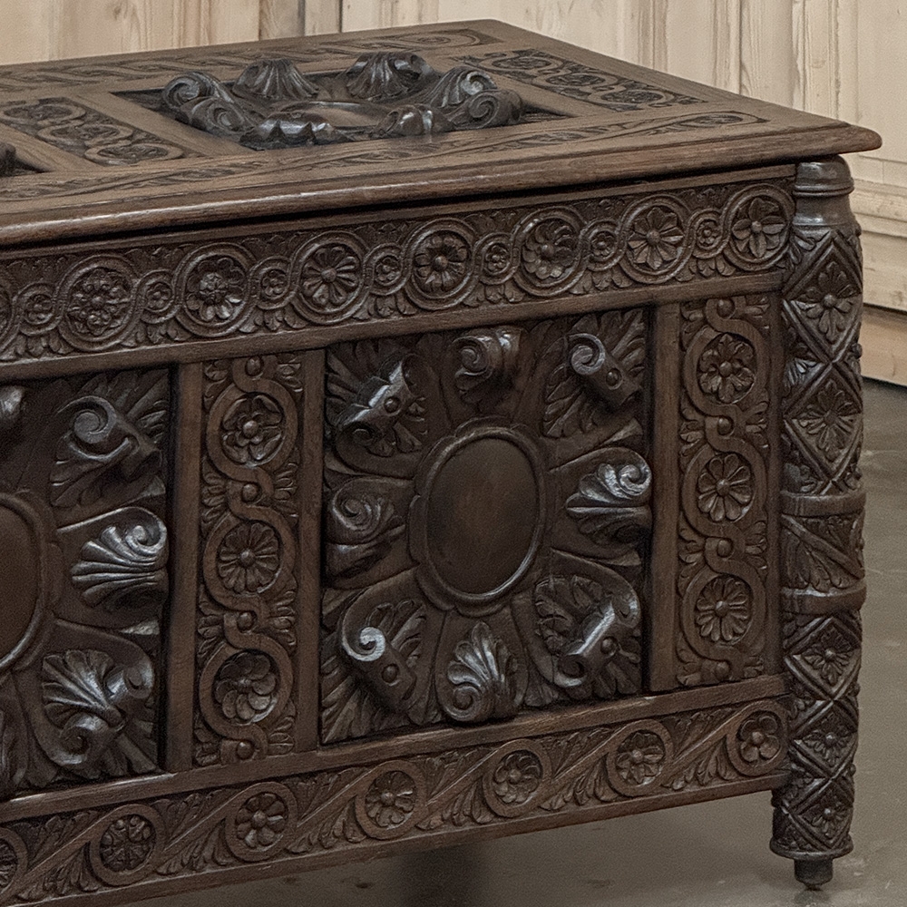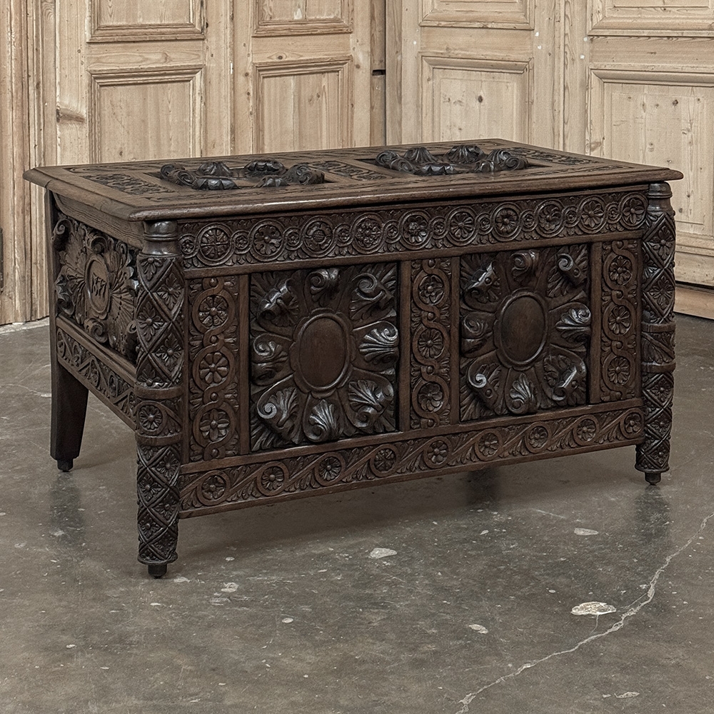 19th Century French Renaissance Trunk dated 1877 is a truly special keepsake piece your family can enjoy for generations! Commemorating the date of 1877 on one side and the initial B on the other, it was probably produced as a wedding or anniversary gift for a lucky couple. The panels appear older than that date, so it is possible the chest was created from older panels into its current form. Hand-forged steel hinges connect the top, and the carvings on the top and three facades are incredible, highlighting the obvious skills of a talented sculptor. Included with the featured foliate rosette-style panels are border moldings of Greek coin and wave accented with smaller rosettes. Even the front legs are completely enveloped in carved detail creating a truly unique and arresting presence. Top opens wide to reveal copious storage, as icing on the cake!