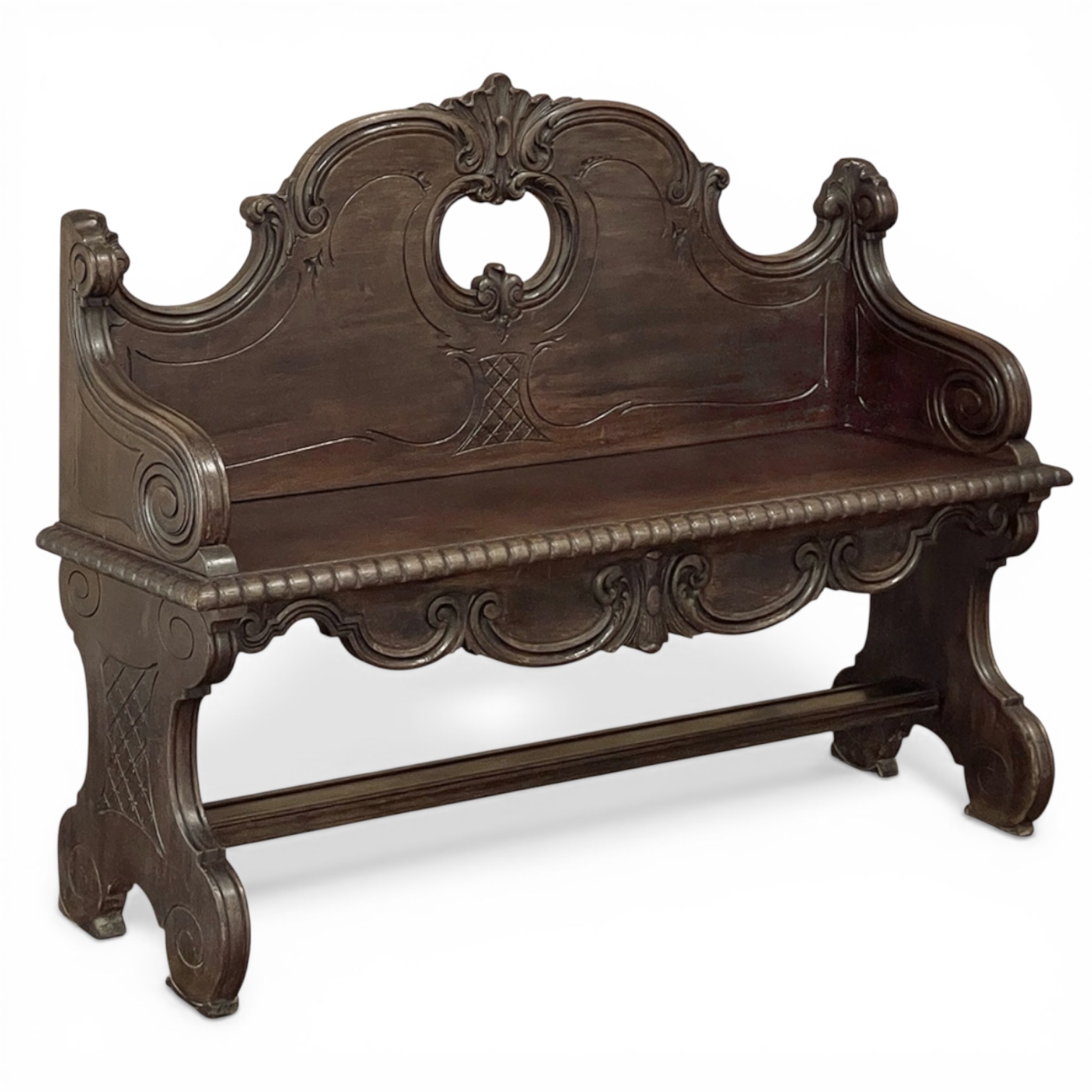 19th Century Italian Hall Bench was sculpted from fine walnut, and features an elaborately scrolled design including a boldly arched seatback embellished with foliate scrollwork and centered with a stylized shell shield motif appearing over an opening framed in matching scrollwork. The seatback flows to the scrolled armrests on each side, with matching scrolls appearing across the entire apron under the bench seat. Hourglass shaped side supports are connected with a molded stretcher. Perfect for hallways, stairwell landings, or cozy rooms!