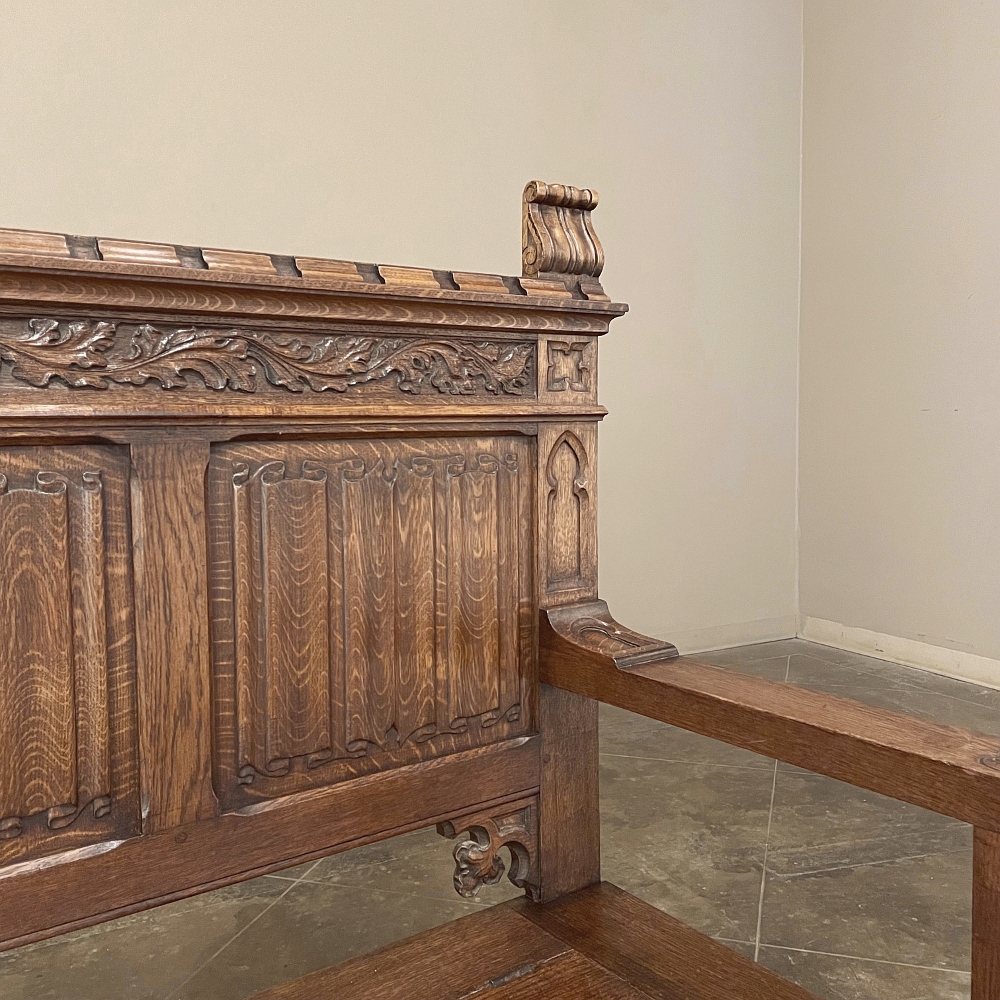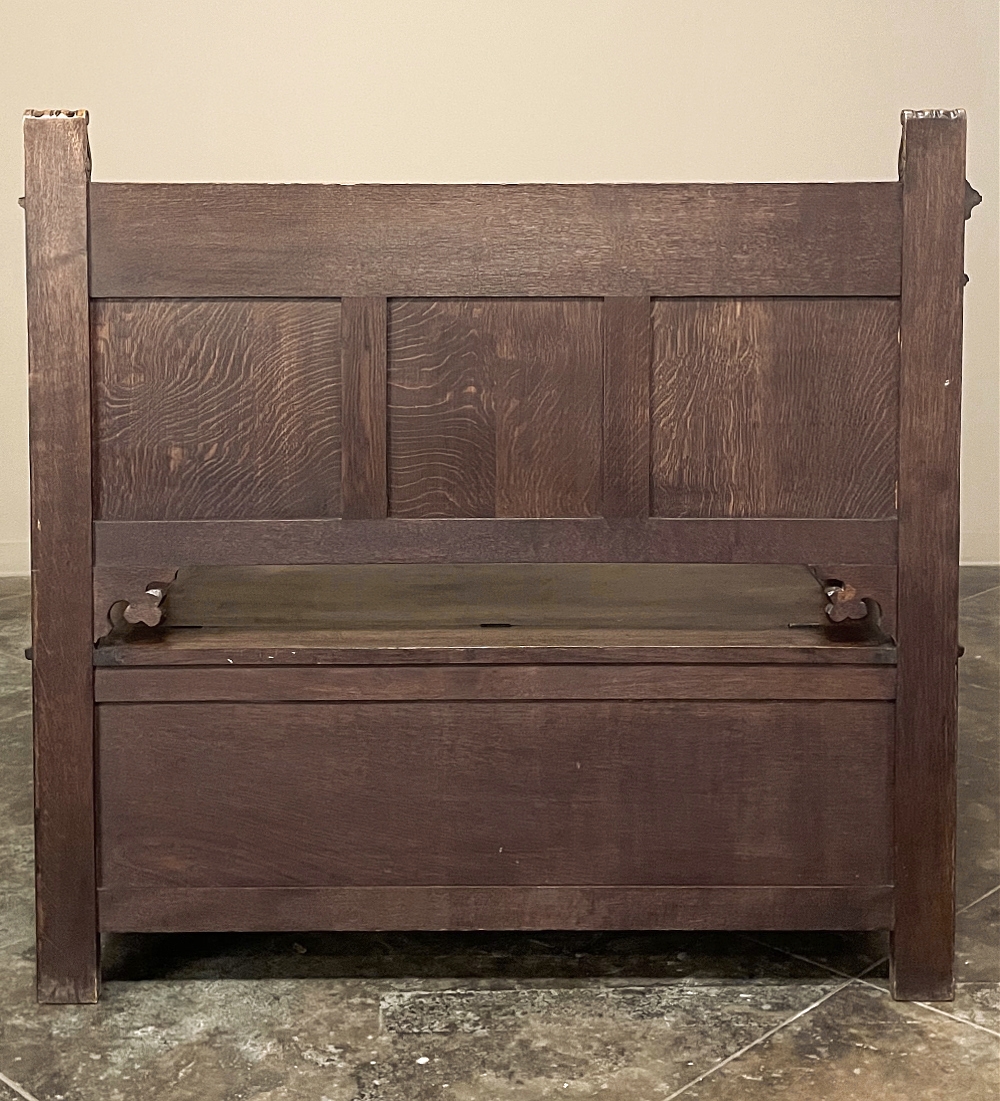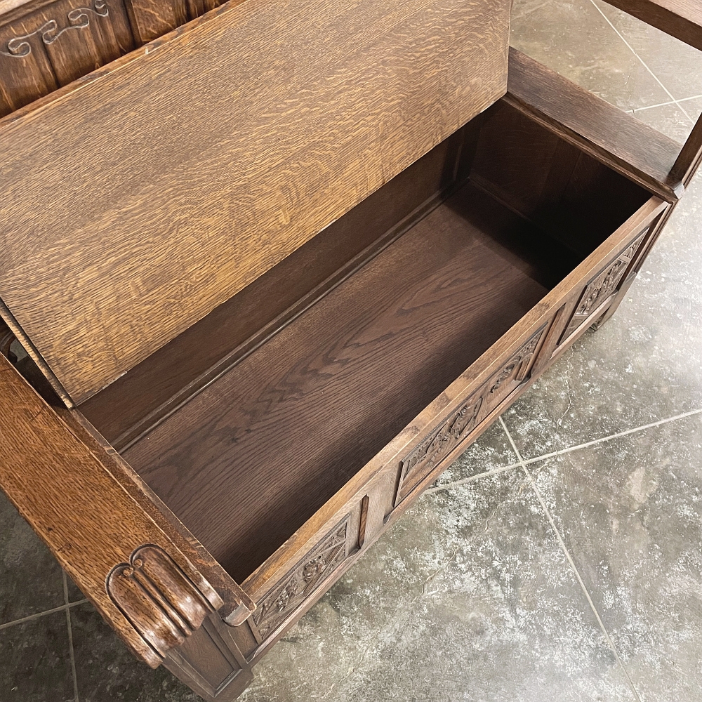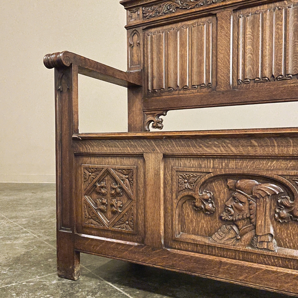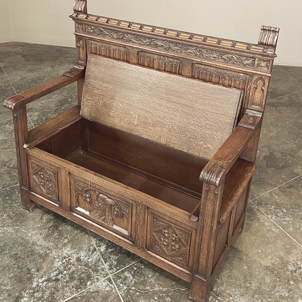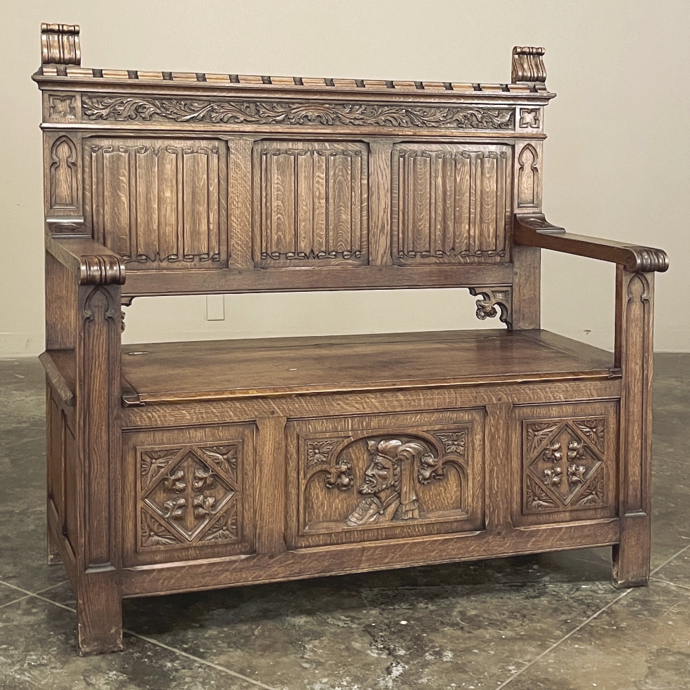 SaleAntique Gothic Revival Carved Hall Bench was rendered from solid oak, and features timeless hand-carved motifs for your visual pleasure. Foliates cross the top underneath a subtle castellation, with three boldly carved linenfold panels comprising the back, accented with foliate cornerpieces below. The seat is solid oak planks and lifts up to reveal a trunk for storage. A pair of raised panels adorn the sides, with three carved panels in front, the centermost of which depicts a nobleman in profile. Ideal for a hallway, entryway or anywhere a timeless example of the oldest known style can be on full view.