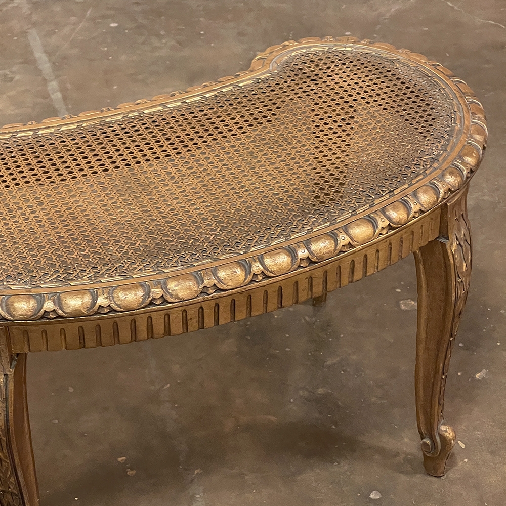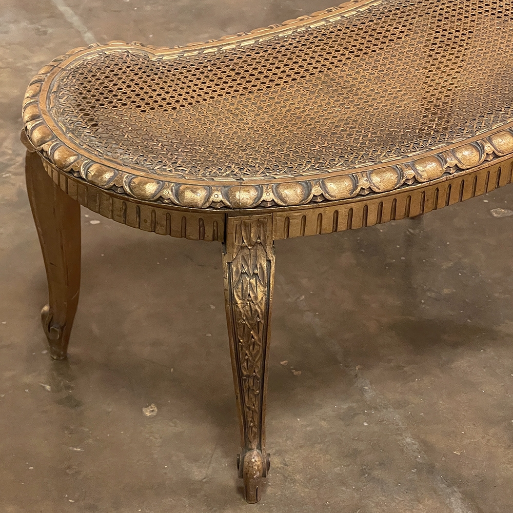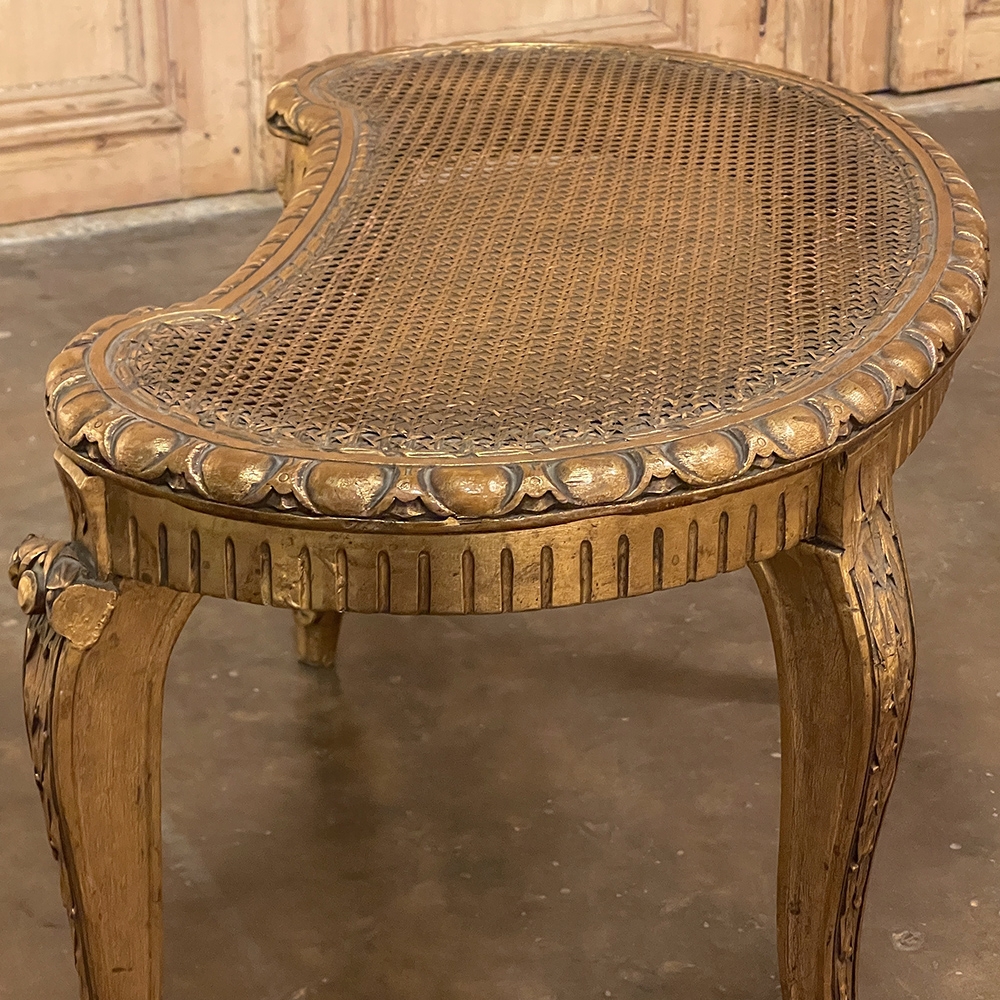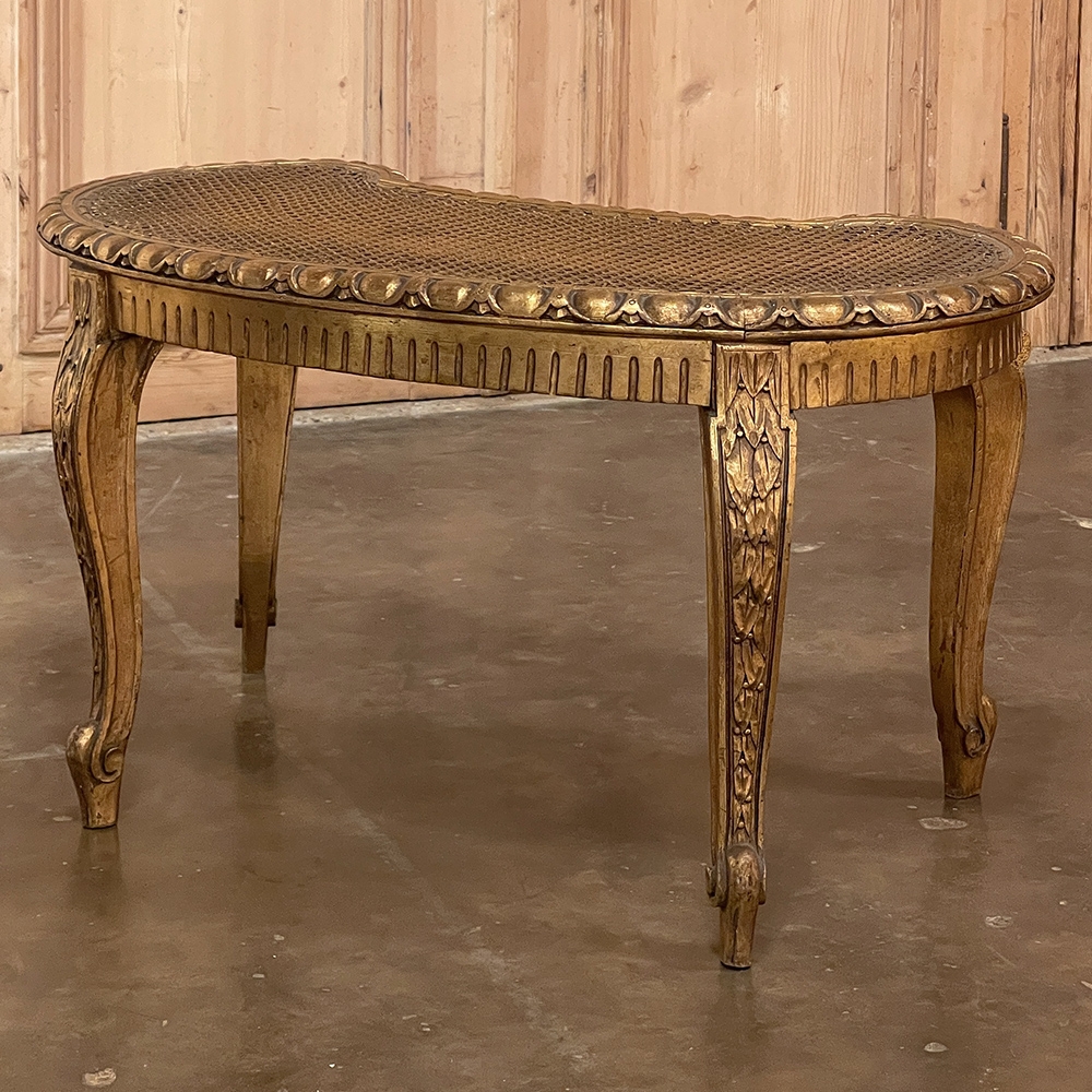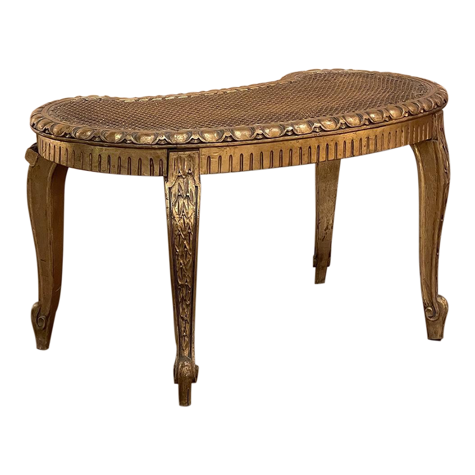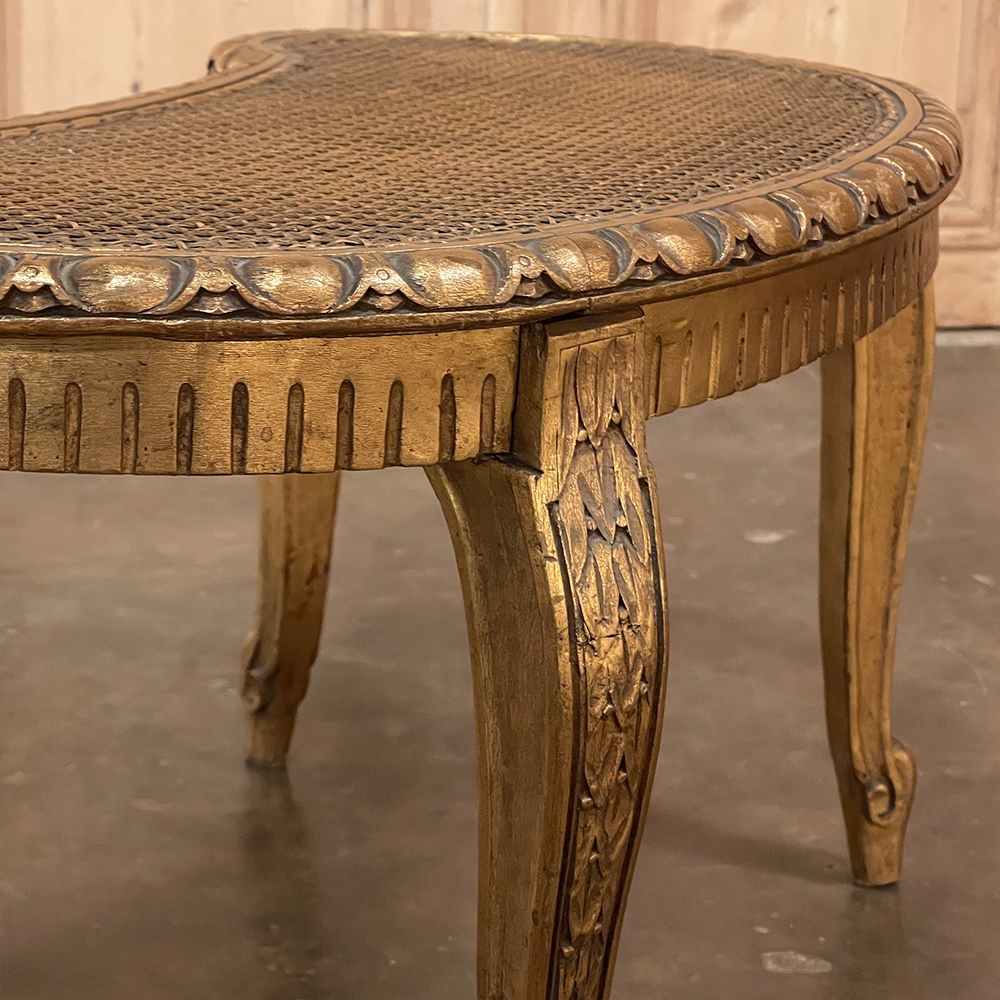 Antique Italian Neoclassical Giltwood & Caned Vanity Bench was designed to provide lightweight comfort and timeless classical style! The kidney-shaped design can be flipped for different contours of vanities or counters, with a convex side opposing the concave side. The caned top provides lightweight, breathable comfort, and is framed by large egg & dart molding around the entire perimeter. Just underneath the perimeter is the apron, fully fluted, and supported by four subtly scrolled legs adorned with carved laurel leaf and berry motifs down to the escargot feet tips. The gold finish has attained a lovely patina over the decades, creating a stunning ageless visual effect.