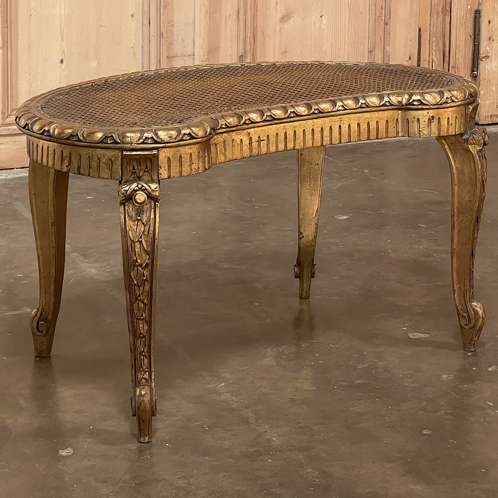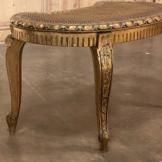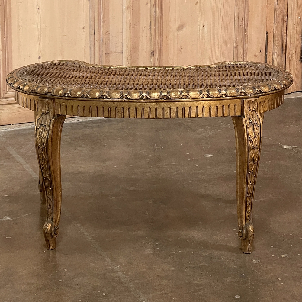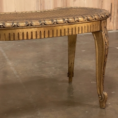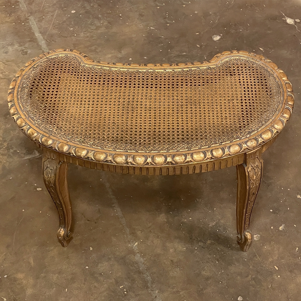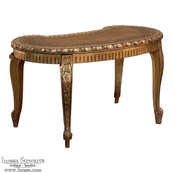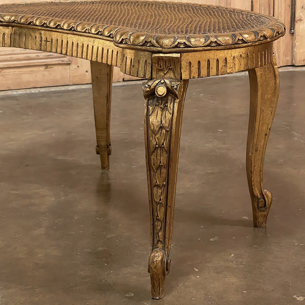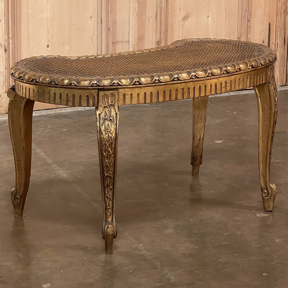 Antique Italian Neoclassical Giltwood & Caned Vanity Bench was designed to provide lightweight comfort and timeless classical style! The kidney-shaped design can be flipped for different contours of vanities or counters, with a convex side opposing the concave side. The caned top provides lightweight, breathable comfort, and is framed by large egg & dart molding around the entire perimeter. Just underneath the perimeter is the apron, fully fluted, and supported by four subtly scrolled legs adorned with carved laurel leaf and berry motifs down to the escargot feet tips. The gold finish has attained a lovely patina over the decades, creating a stunning ageless visual effect.