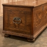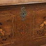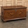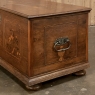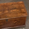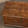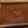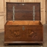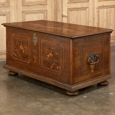 SaleEarly 19th Century Swedish Inlaid Trunk with Marquetry is a remarkable example of craftsmanship in the creation of artistically produced heirloom pieces designed to be enjoyed for centuries! The outer casework is old-growth seasoned oak, while the interior is lined with cedar to protect the contents stored within. There's even the candle box with a separate lid so that the family could keep valuable candles under lock and key, back in the days before electric lighting which we all too frequently take for granted. Hand-forged elaborate strap hinges, key guard and handles with guards on the sides indicate a like-minded blacksmith's work. Boldly molded top and base are augmented by bun feet which keep the piece off the floor. The most amazing aspect, however, is the extraordinary inlay bordering and marquetry artistry that appears in two panels on the top depicting jardinieres with wild flowers, on each side, and on the front with stylized avian and foliate scenes separated by a vase with flowers, all rendered from a variety of woods to provide different textures and colors to create artwork that will truly transcend time itself!