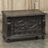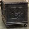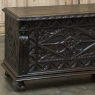 PAIR 19th Century French Gothic Revival Trunks ~ Blanket Chests is a truly unusual find! Perfect for the foot of the bed for a pair of twins, they can also be used in dormer window niches, or for adding symmetry anywhere in your decorating plan. Hand-crafted from solid old-growth oak, each features a solid plank top with beautifully hand-carved edging in a shell demilune motif. Tops open up on hinges in the back to reveal substantial storage within. The three facades are beautifully carved with Gothic inspired motifs mixed with corner corbels topped with likenesses of the Lord and the Lady of the Manoir. Literally carved from top to bottom and everywhere in between, the design creates visual appeal from all angles.