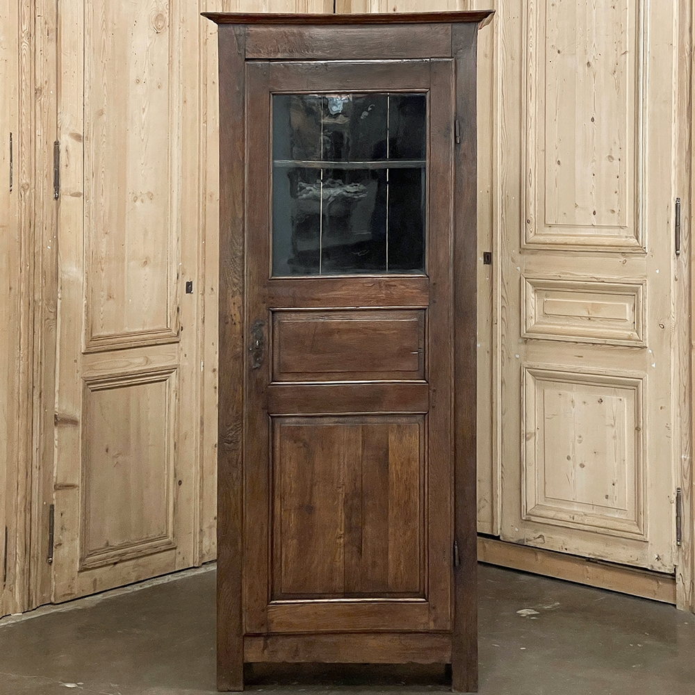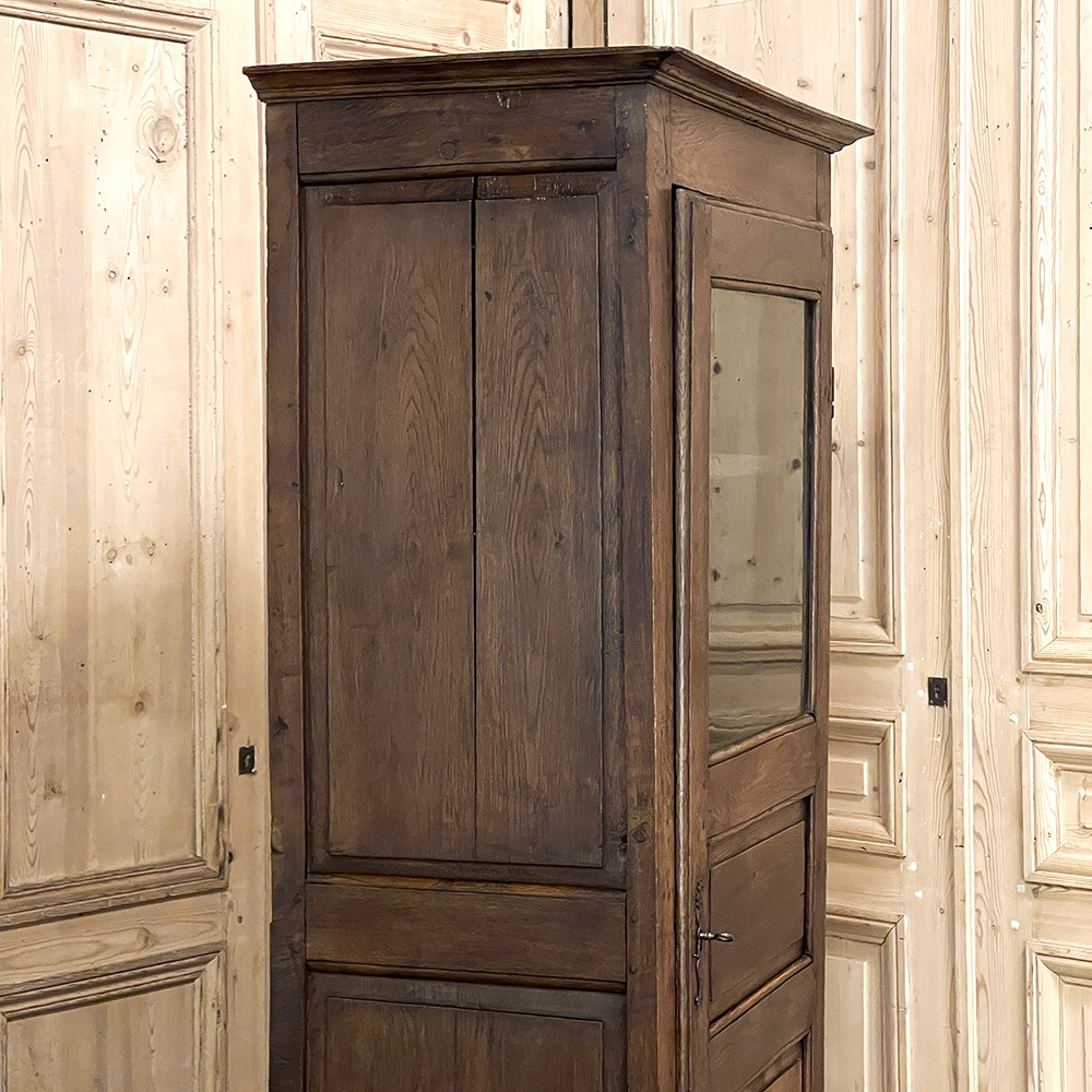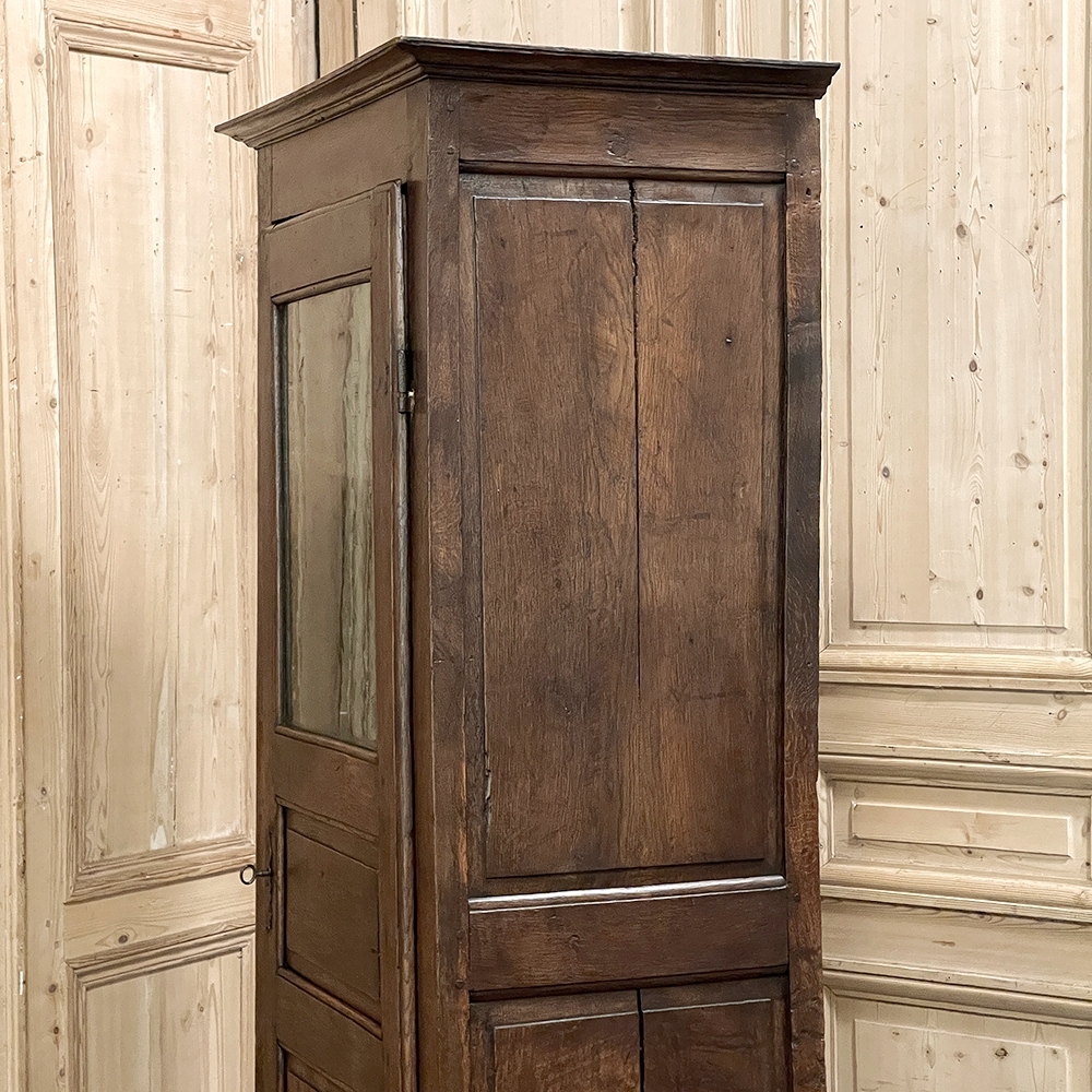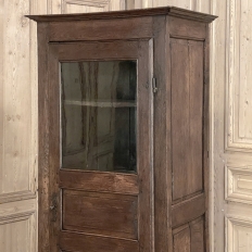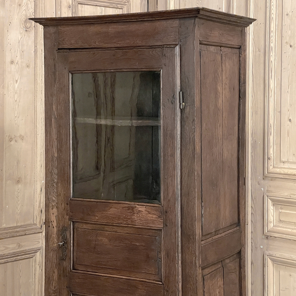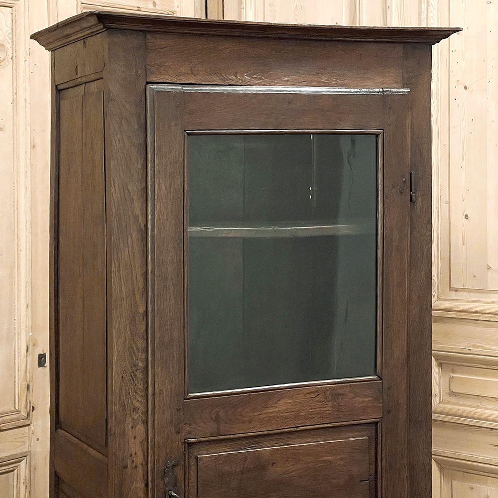 SaleFINAL SALE! ~ 18th Century Rustic Country French Vitrine ~ Bonnetier is an early example of the genre, wherein a design was needed to both display and provide storage while offering a minimal footprint on the home's floorplan. Perfect for showing off family heirlooms or special collectibles, it also offered lots of storage for just about everything else one could imagine, and was usually found in a family room in a place of honor, but could also be used anywhere in the home. This example, rendered from dense, old-growth indigenous oak, has already surpassed it's 200th birthday with many more in its future. An understated crown presides over the sturdy framework, with the full length door being the primary source of visual appeal. The door is divided into three panels, the topmost of which is hand-blown glass to allow full view of one's collection. Only 19" deep including the crown projection above, it promises to hug the wall to make a perfect piece for busy households. Crafted entirely by hand using pegged mortise & tenon joinery, its rustic but sturdy construction is most evident in the view of the back side.