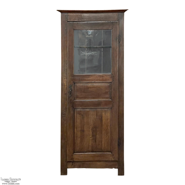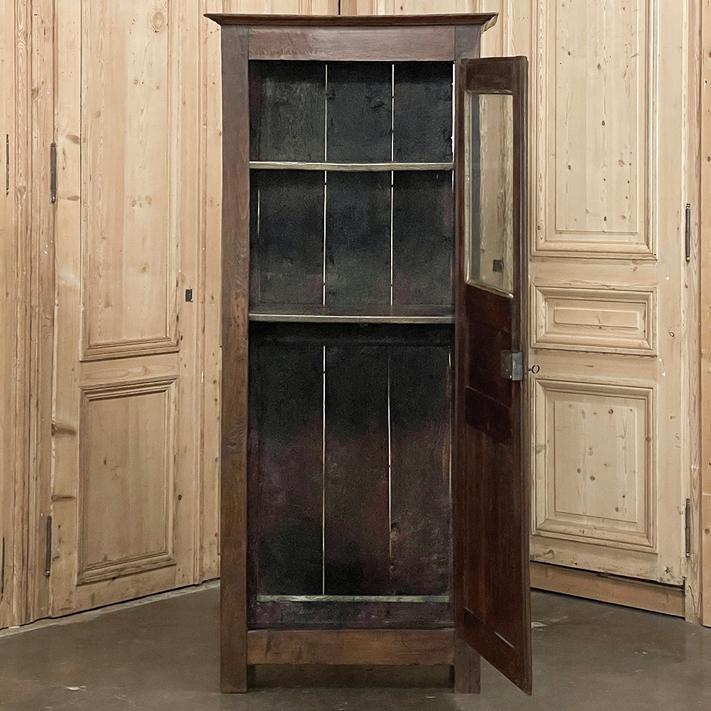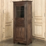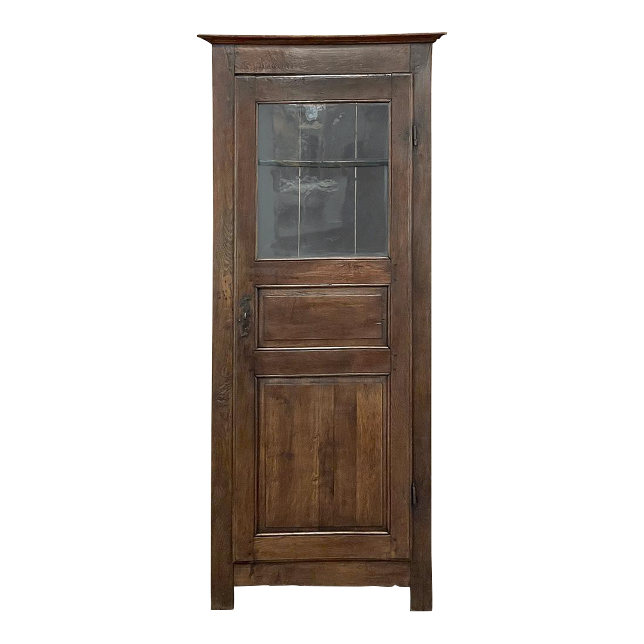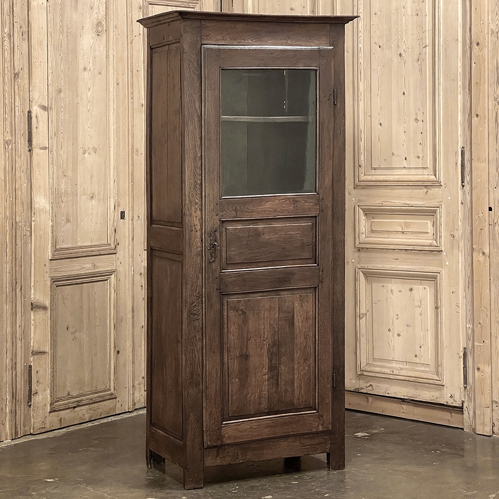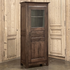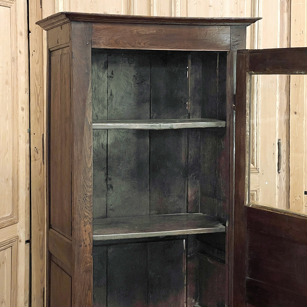 SaleFINAL SALE! ~ 18th Century Rustic Country French Vitrine ~ Bonnetier is an early example of the genre, wherein a design was needed to both display and provide storage while offering a minimal footprint on the home's floorplan. Perfect for showing off family heirlooms or special collectibles, it also offered lots of storage for just about everything else one could imagine, and was usually found in a family room in a place of honor, but could also be used anywhere in the home. This example, rendered from dense, old-growth indigenous oak, has already surpassed it's 200th birthday with many more in its future. An understated crown presides over the sturdy framework, with the full length door being the primary source of visual appeal. The door is divided into three panels, the topmost of which is hand-blown glass to allow full view of one's collection. Only 19" deep including the crown projection above, it promises to hug the wall to make a perfect piece for busy households. Crafted entirely by hand using pegged mortise & tenon joinery, its rustic but sturdy construction is most evident in the view of the back side.