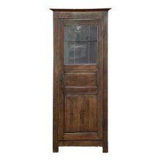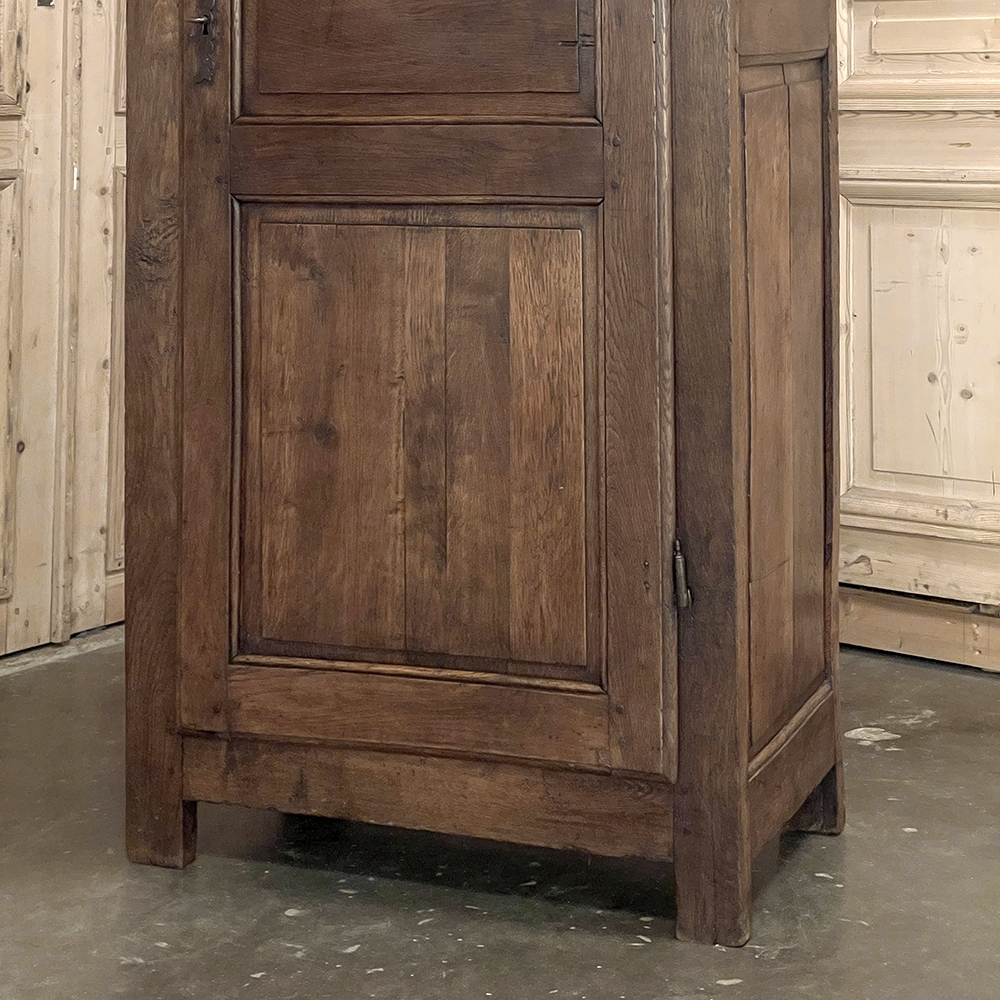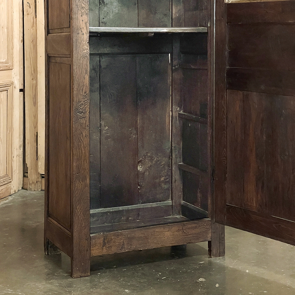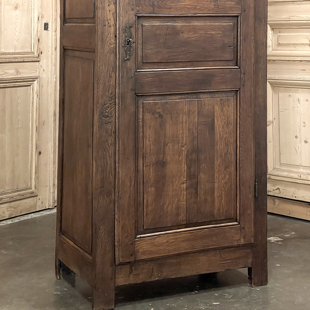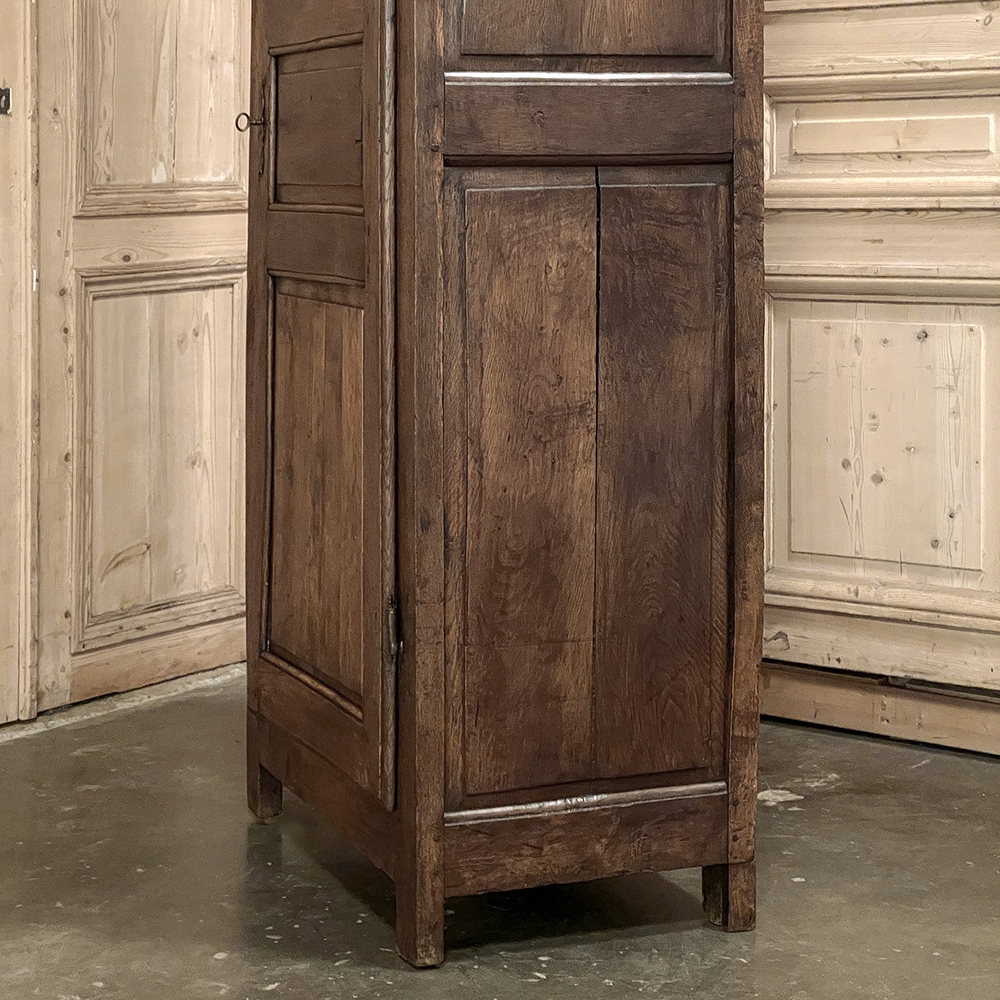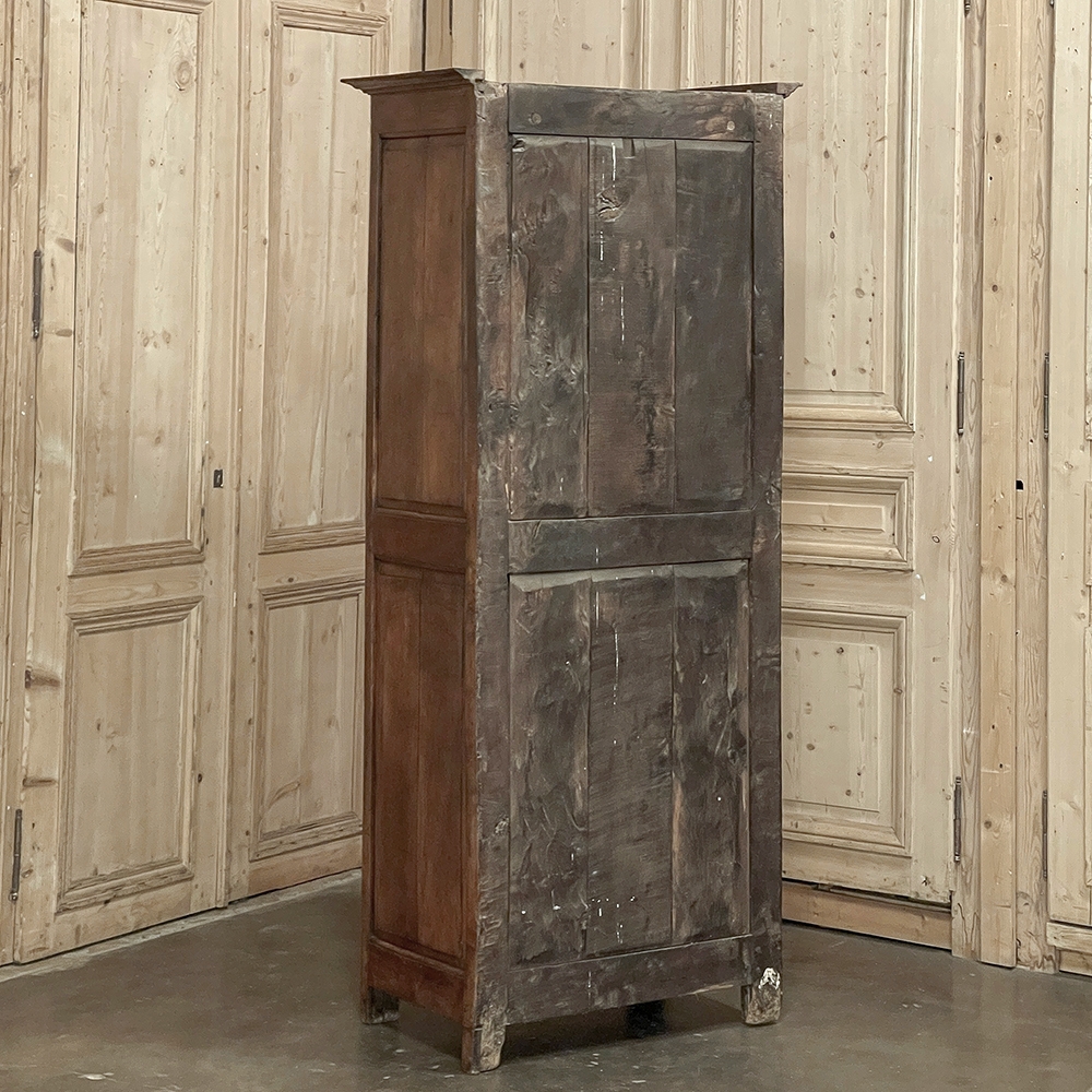 SaleFINAL SALE! ~ 18th Century Rustic Country French Vitrine ~ Bonnetier is an early example of the genre, wherein a design was needed to both display and provide storage while offering a minimal footprint on the home's floorplan. Perfect for showing off family heirlooms or special collectibles, it also offered lots of storage for just about everything else one could imagine, and was usually found in a family room in a place of honor, but could also be used anywhere in the home. This example, rendered from dense, old-growth indigenous oak, has already surpassed it's 200th birthday with many more in its future. An understated crown presides over the sturdy framework, with the full length door being the primary source of visual appeal. The door is divided into three panels, the topmost of which is hand-blown glass to allow full view of one's collection. Only 19" deep including the crown projection above, it promises to hug the wall to make a perfect piece for busy households. Crafted entirely by hand using pegged mortise & tenon joinery, its rustic but sturdy construction is most evident in the view of the back side.