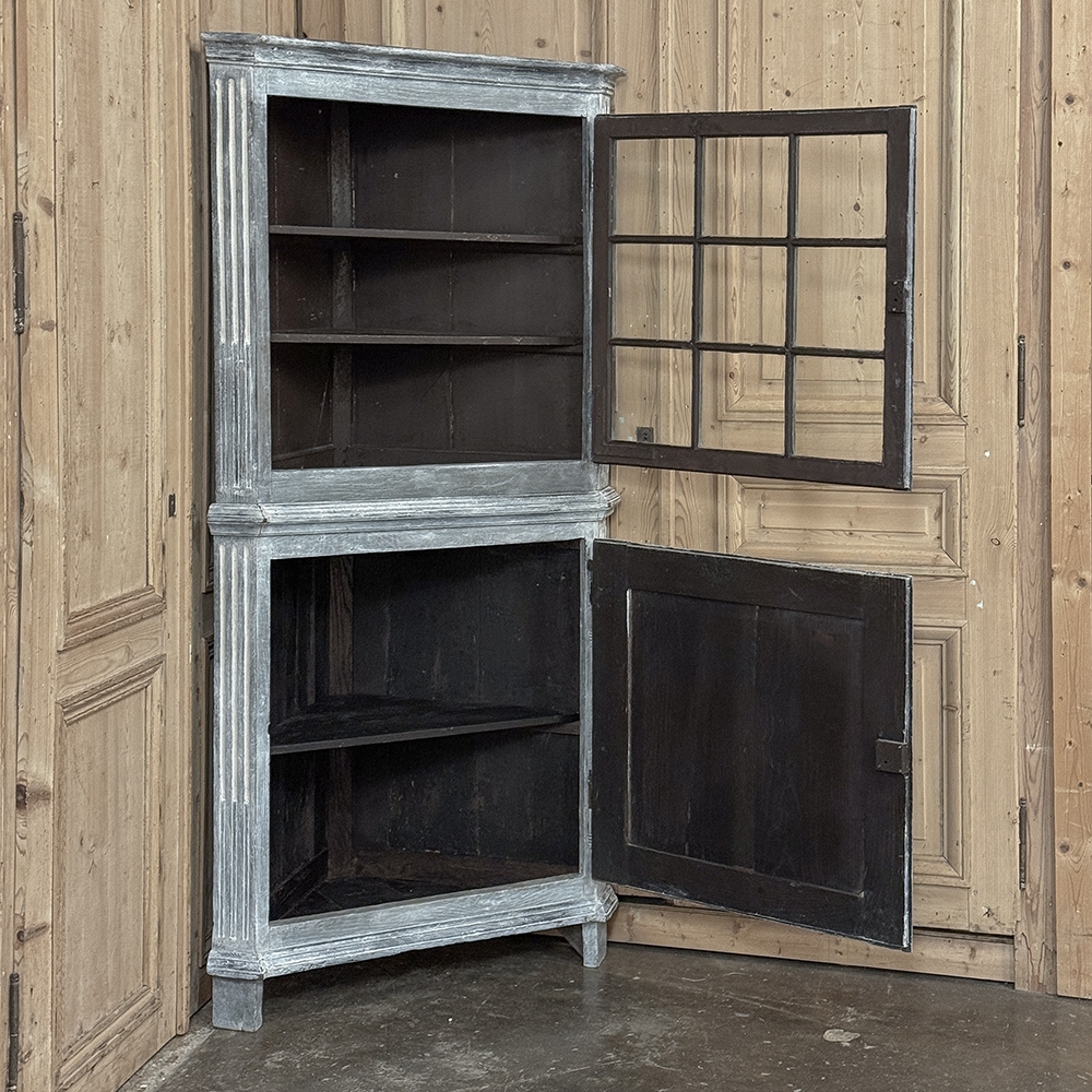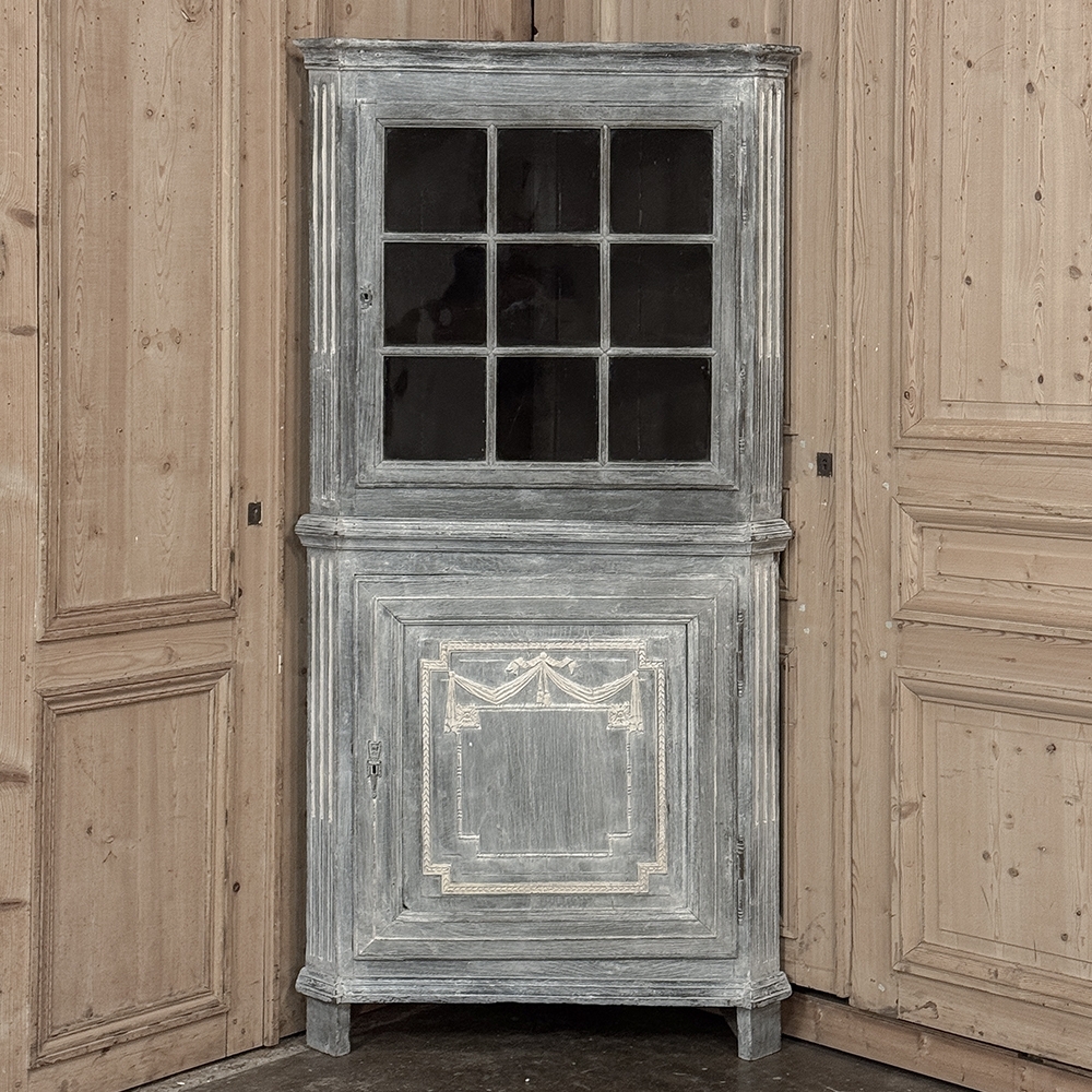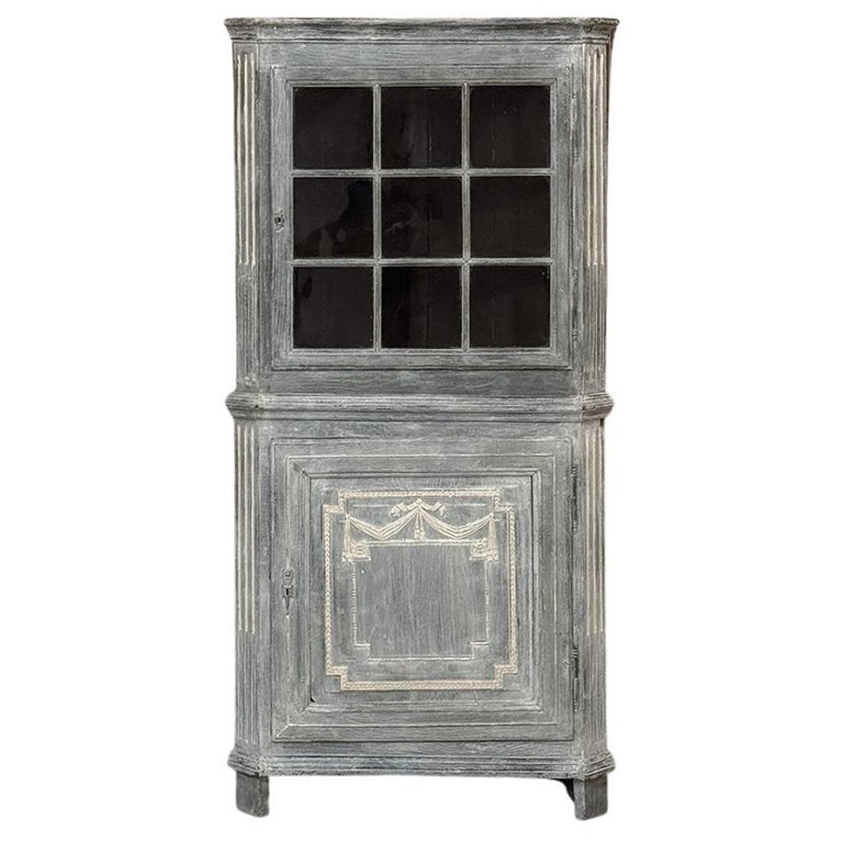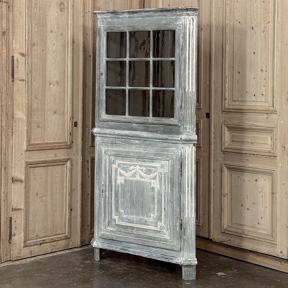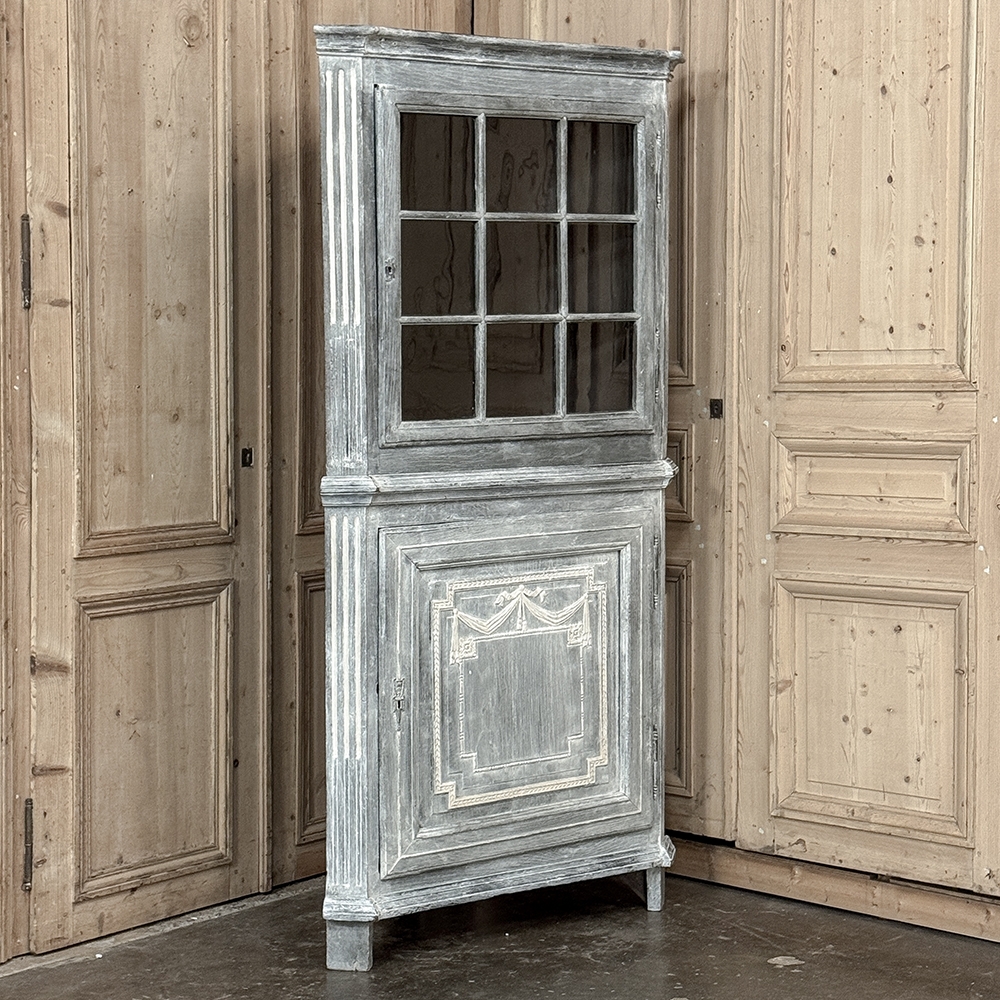 18th Century Swedish Neoclassical Painted Corner Vitrine ~ Curio Cabinet is the perfect choice to decorate and utilize what is usually dead space in a room ~ the corner! Hand-crafted, then sculpted and painted to highlight the carvings, it features patina and character galore. The tailored classical design is two tiered, and includes fluted corner posts framing the nine glazed panes for display above, and the wonderfully embellished single cabinet door below. The cabinet door panel provides the most visual intrigue, with egg & dart molding, fabric swags with ribbon and rosettes. The carving and the flutes on the cornerposts are painted in an antique white to provide subtle contrast with the pale blue-gray of the overall piece itself. The top tier sports three surfaces, with two surfaces for the storage below. Truly a timeless work of the cabinetmaker's art!
