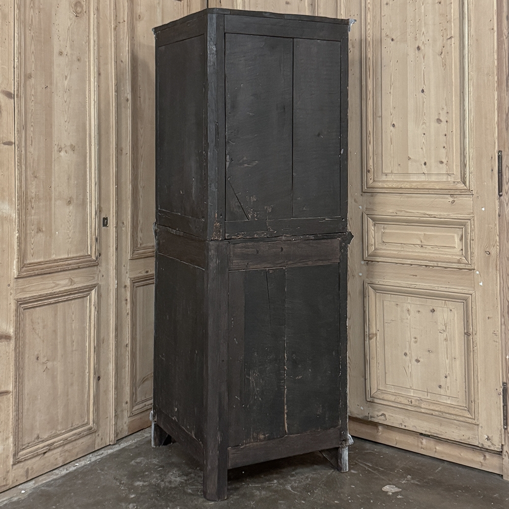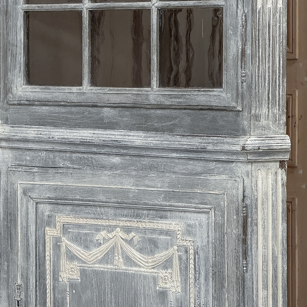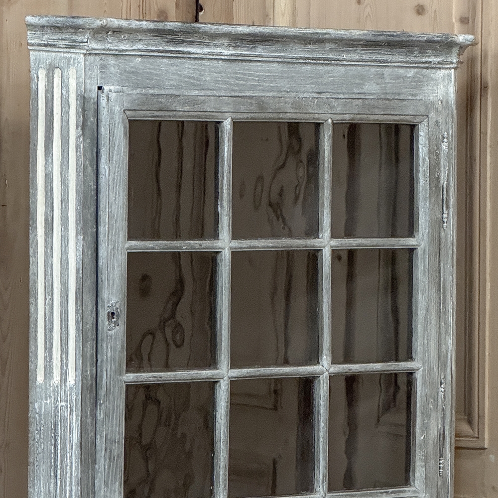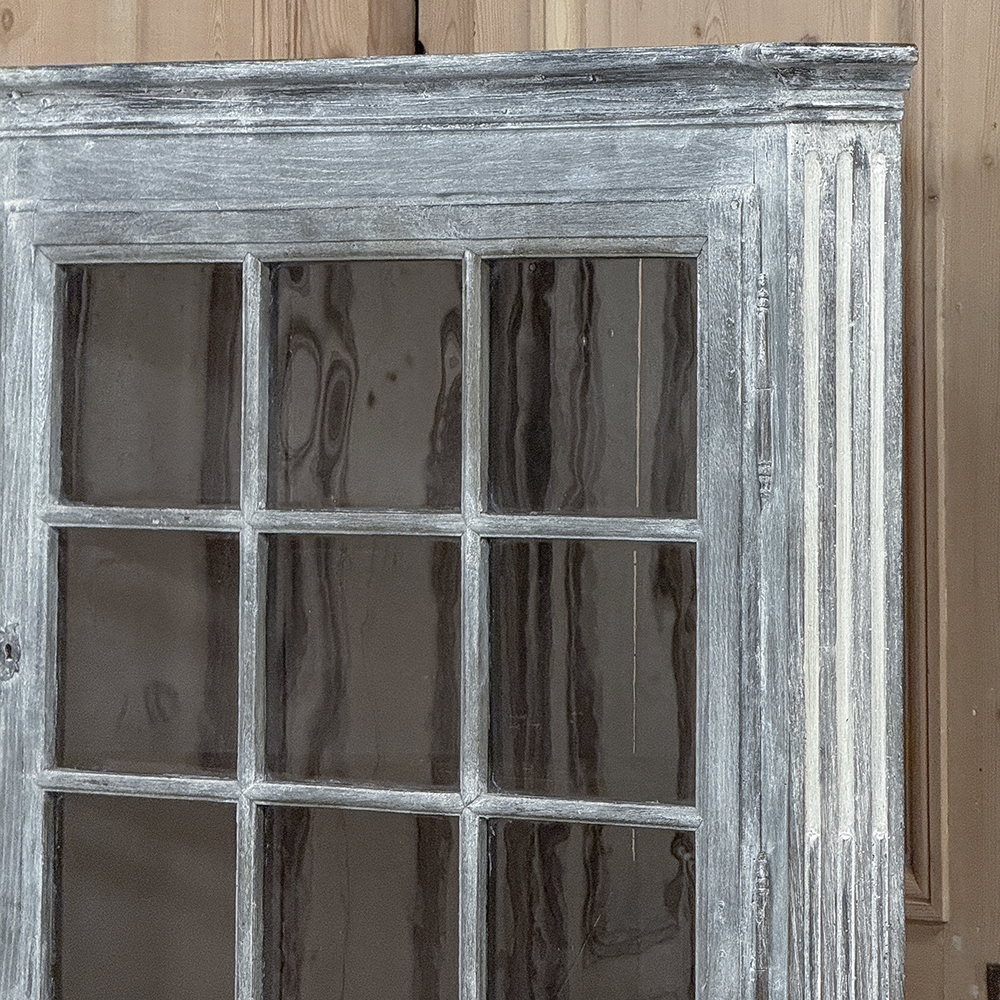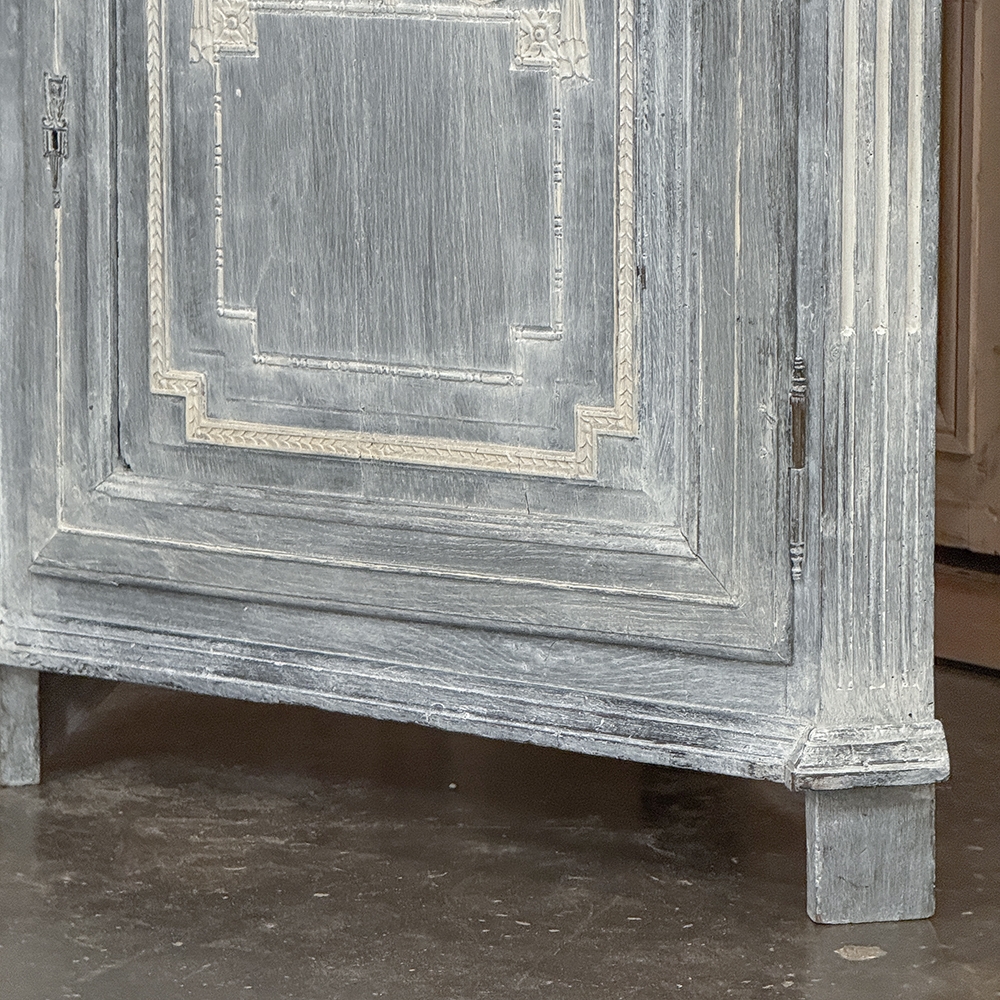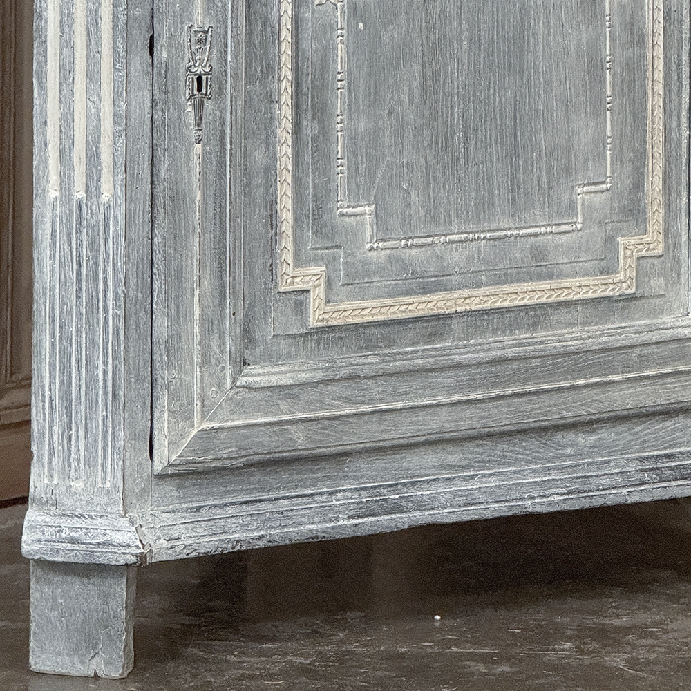 18th Century Swedish Neoclassical Painted Corner Vitrine ~ Curio Cabinet is the perfect choice to decorate and utilize what is usually dead space in a room ~ the corner! Hand-crafted, then sculpted and painted to highlight the carvings, it features patina and character galore. The tailored classical design is two tiered, and includes fluted corner posts framing the nine glazed panes for display above, and the wonderfully embellished single cabinet door below. The cabinet door panel provides the most visual intrigue, with egg & dart molding, fabric swags with ribbon and rosettes. The carving and the flutes on the cornerposts are painted in an antique white to provide subtle contrast with the pale blue-gray of the overall piece itself. The top tier sports three surfaces, with two surfaces for the storage below. Truly a timeless work of the cabinetmaker's art!