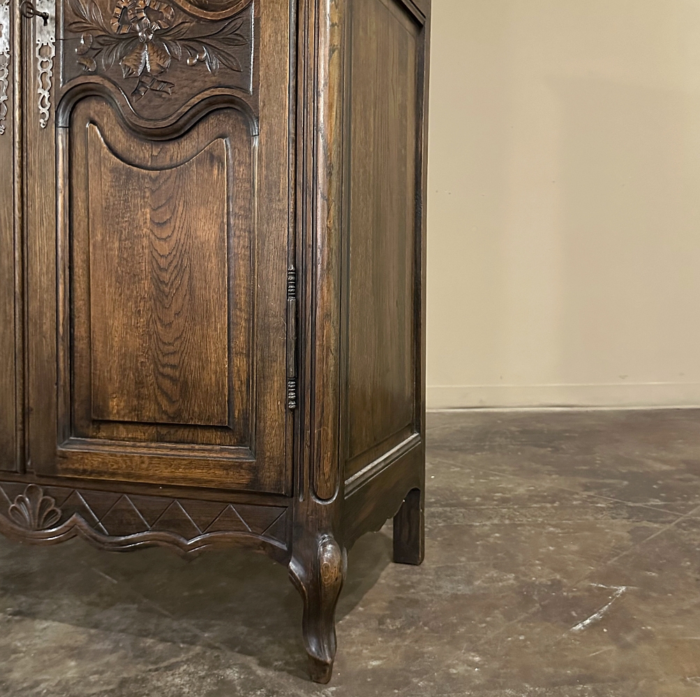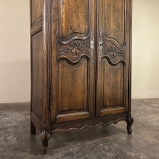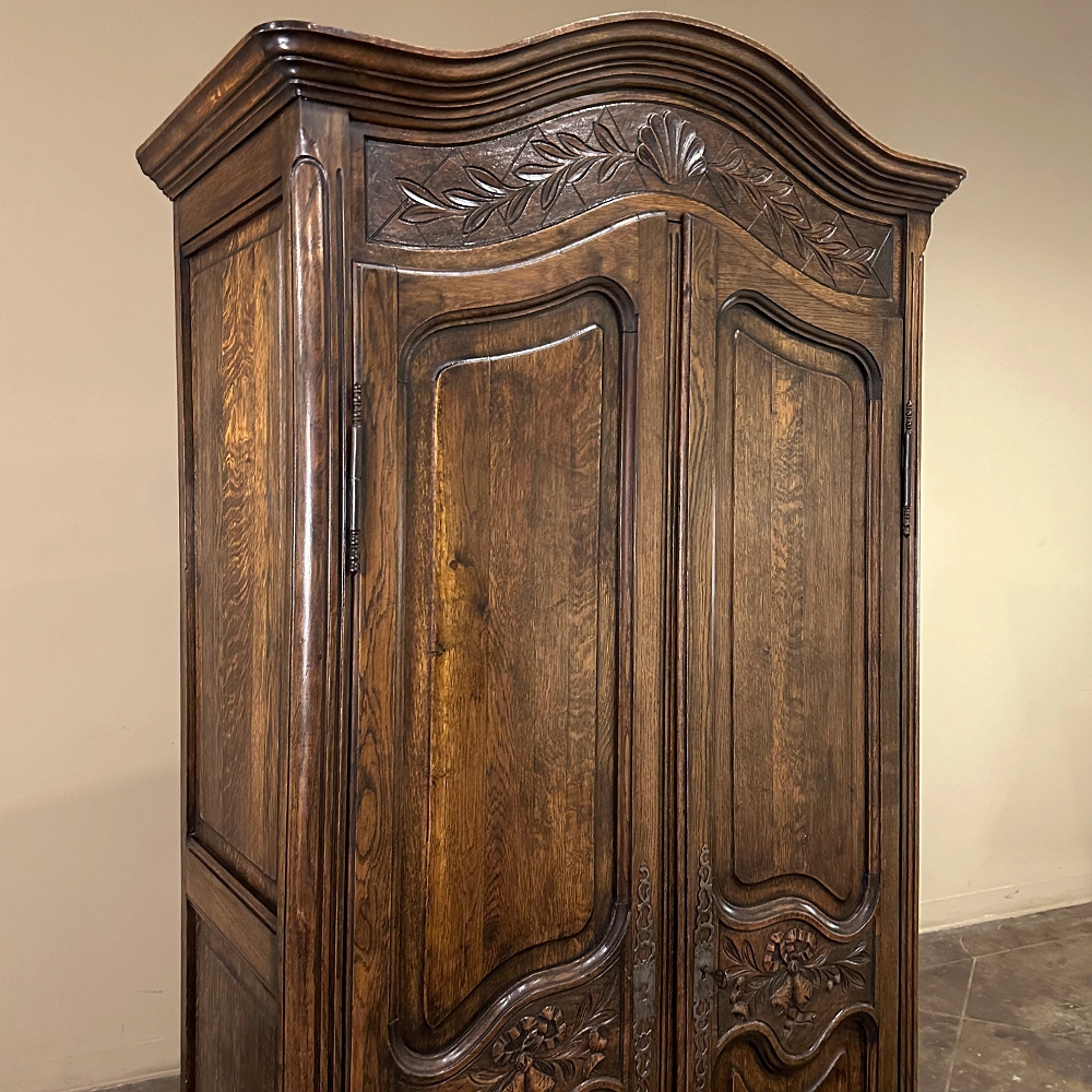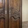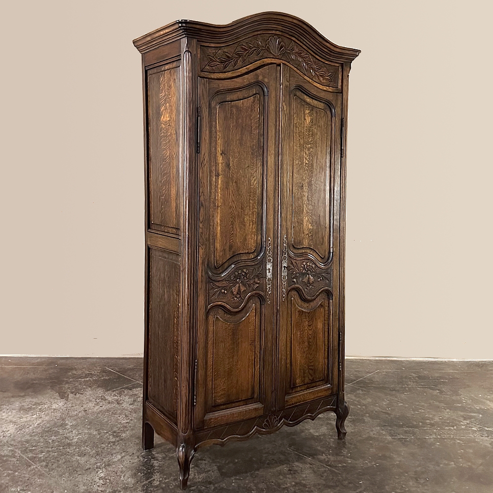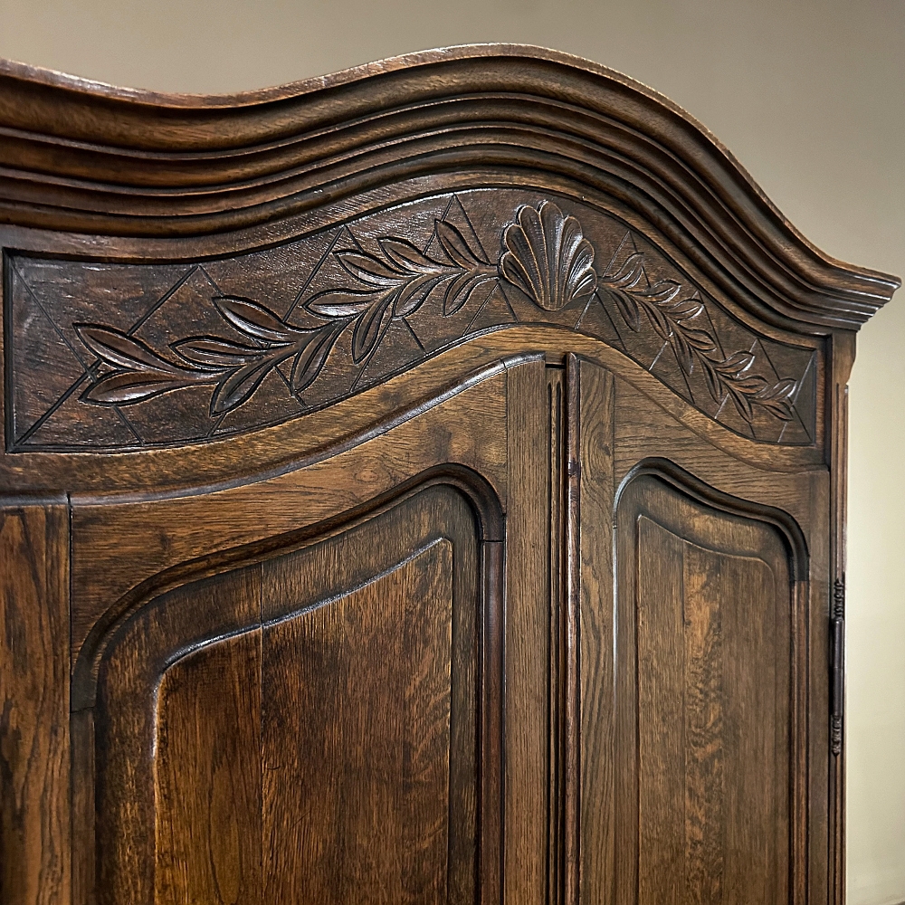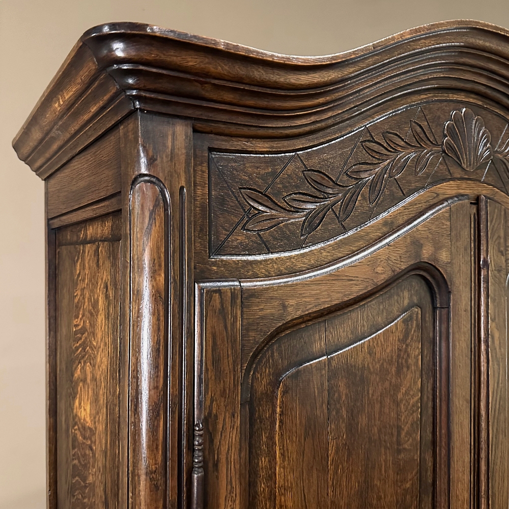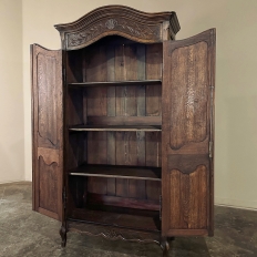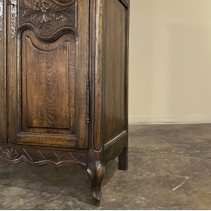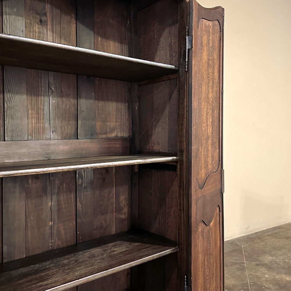 19th Century Country French Bonnetiere ~ Petite Armoire is a delightful expression of the provincial style for which the rural areas of France are so famous. Hand-crafted from indigenous old-growth oak, it features sturdy pegged mortise & tenon joinery, chamfered panels, and a timeless architecture that starts with the chapeau de gendarme crown on top, so named because of its resemblance to the hats worn by the police centuries ago. The gracefully arched crown overlooks the bonnet which is carved all across with olive branches emanating from a central stylized shell motif. The two full length doors below that feature two unadorned panels each, with a magnificently sculpted center divider lavished with olive branches, fruit and ribbon on beautifully contoured framed panels. Centered are a brace of pierced steel key guards, called ferrures, with outboard-mounted steel barrel hinges mounting the doors which allow them to swing wide open to facilitate easy access to the four surfaces within. A scrolled apron below centered with a stylized shell, leading the eyes out to the scrolled legs. The shallow design makes it an efficient piece for a cozy floor plan, yet provides ample storage for anything you desire. Note the rough-sawn chamfered oak panels on the back side.