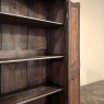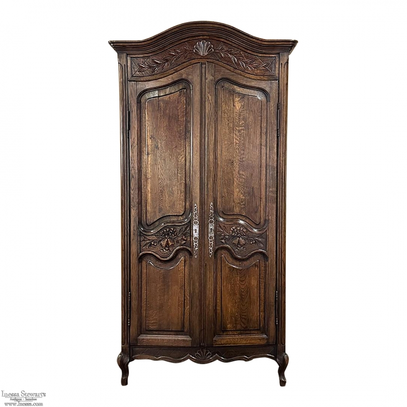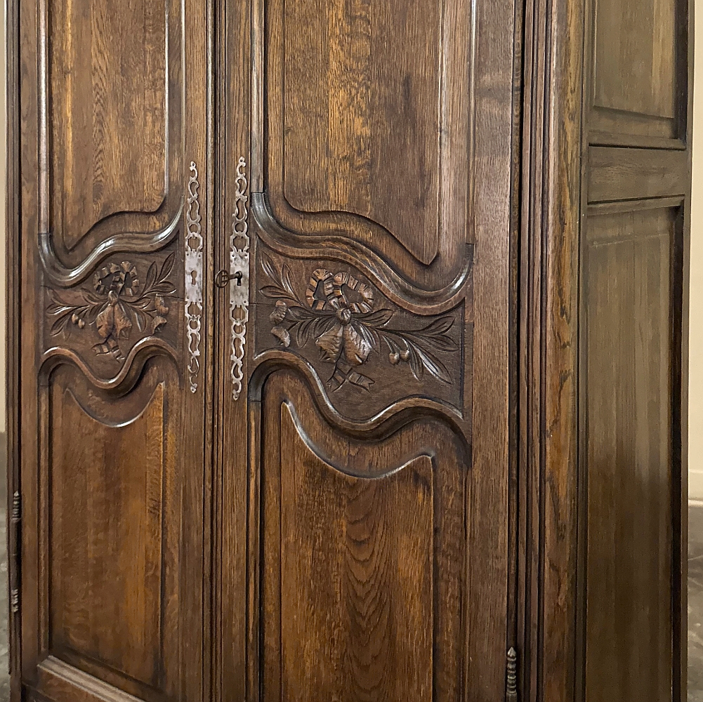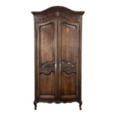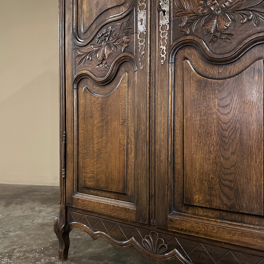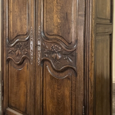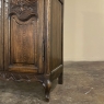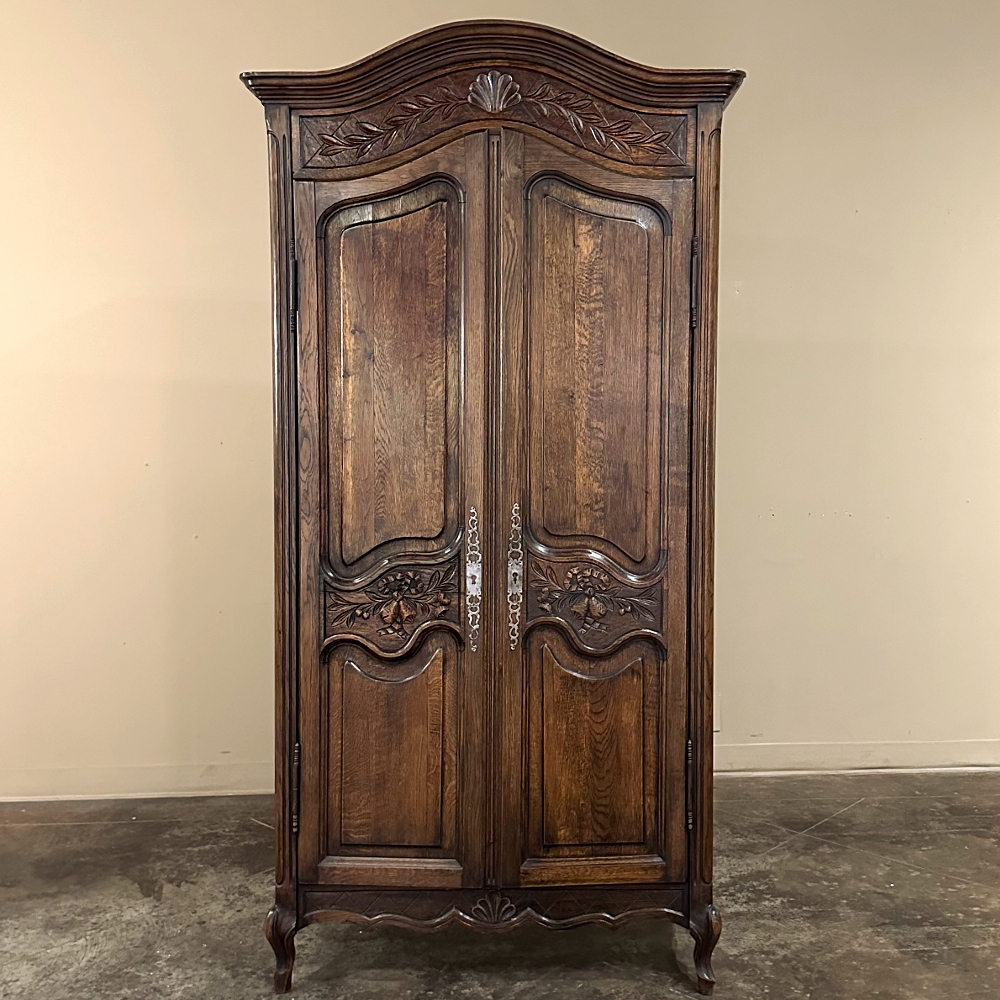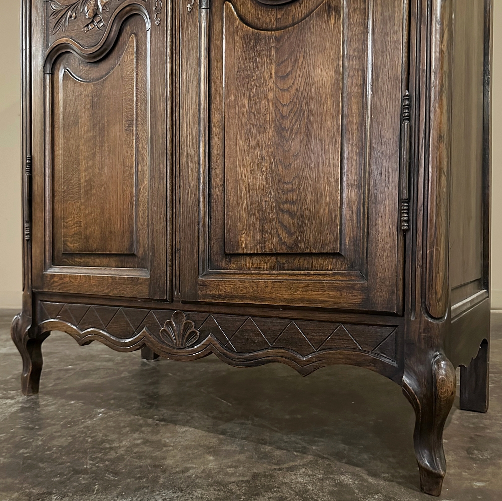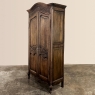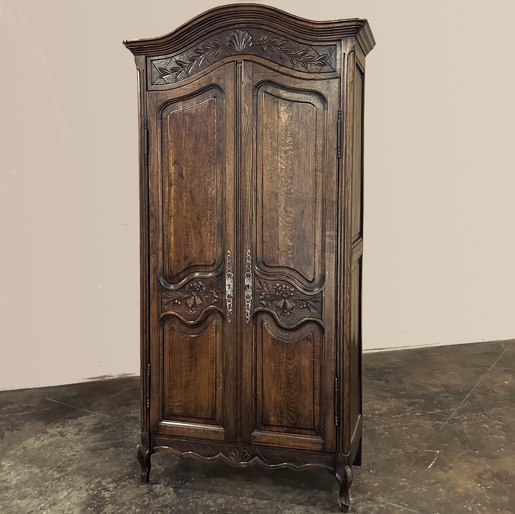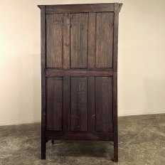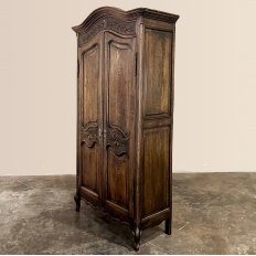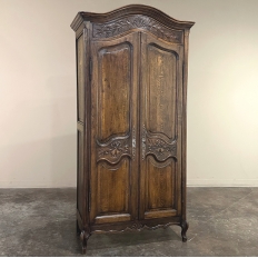 19th Century Country French Bonnetiere ~ Petite Armoire is a delightful expression of the provincial style for which the rural areas of France are so famous. Hand-crafted from indigenous old-growth oak, it features sturdy pegged mortise & tenon joinery, chamfered panels, and a timeless architecture that starts with the chapeau de gendarme crown on top, so named because of its resemblance to the hats worn by the police centuries ago. The gracefully arched crown overlooks the bonnet which is carved all across with olive branches emanating from a central stylized shell motif. The two full length doors below that feature two unadorned panels each, with a magnificently sculpted center divider lavished with olive branches, fruit and ribbon on beautifully contoured framed panels. Centered are a brace of pierced steel key guards, called ferrures, with outboard-mounted steel barrel hinges mounting the doors which allow them to swing wide open to facilitate easy access to the four surfaces within. A scrolled apron below centered with a stylized shell, leading the eyes out to the scrolled legs. The shallow design makes it an efficient piece for a cozy floor plan, yet provides ample storage for anything you desire. Note the rough-sawn chamfered oak panels on the back side.