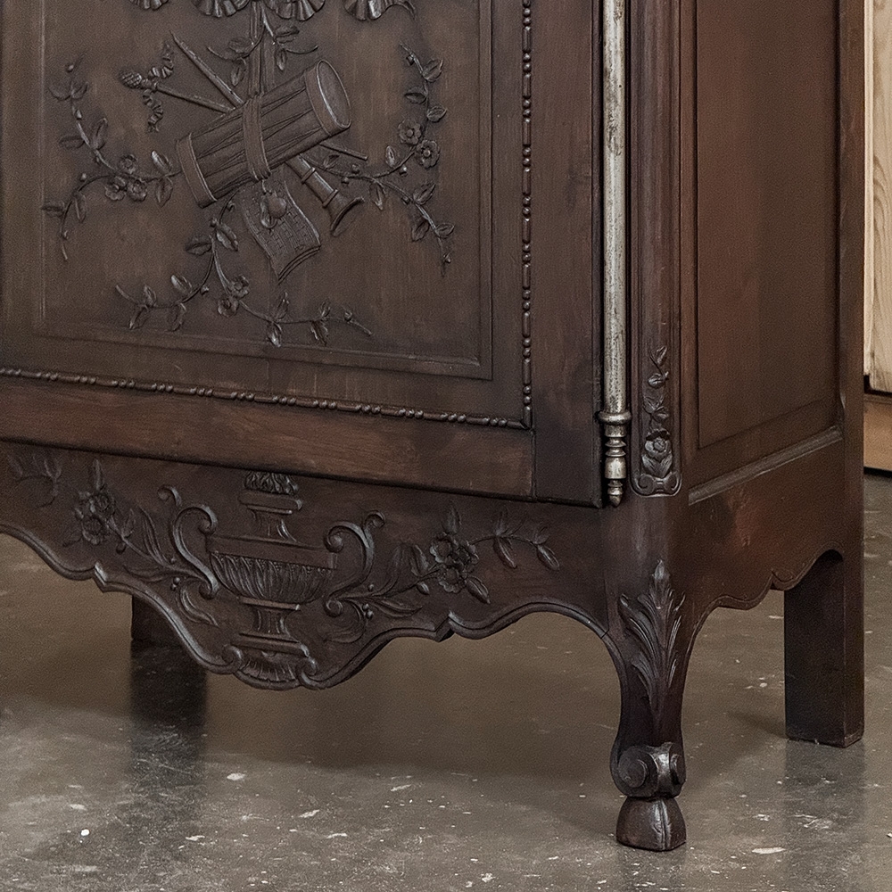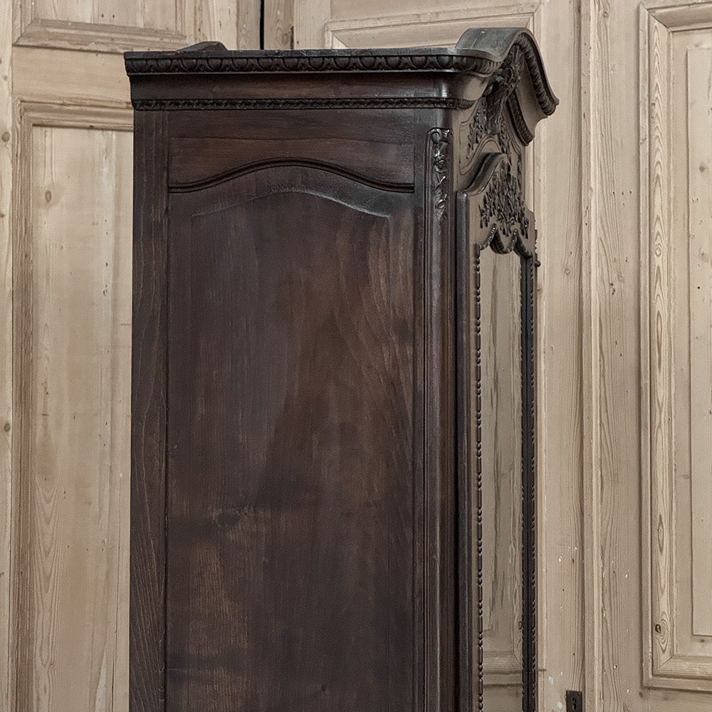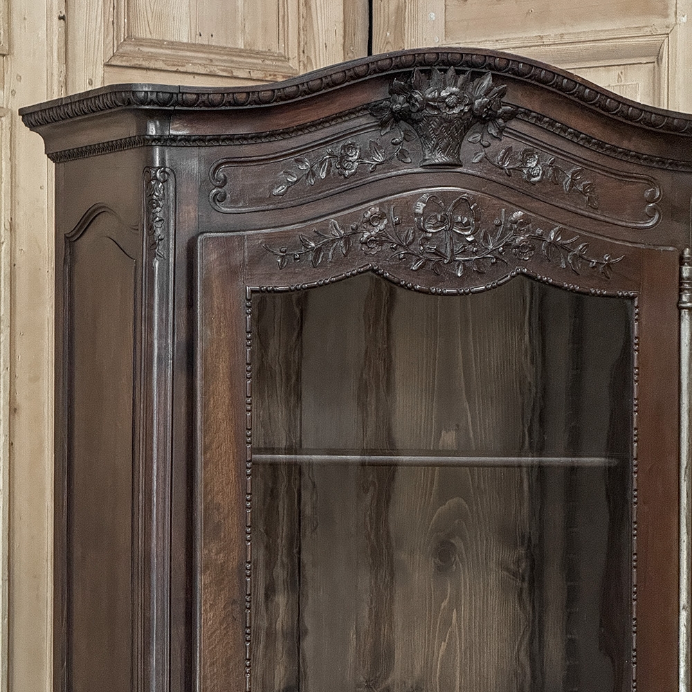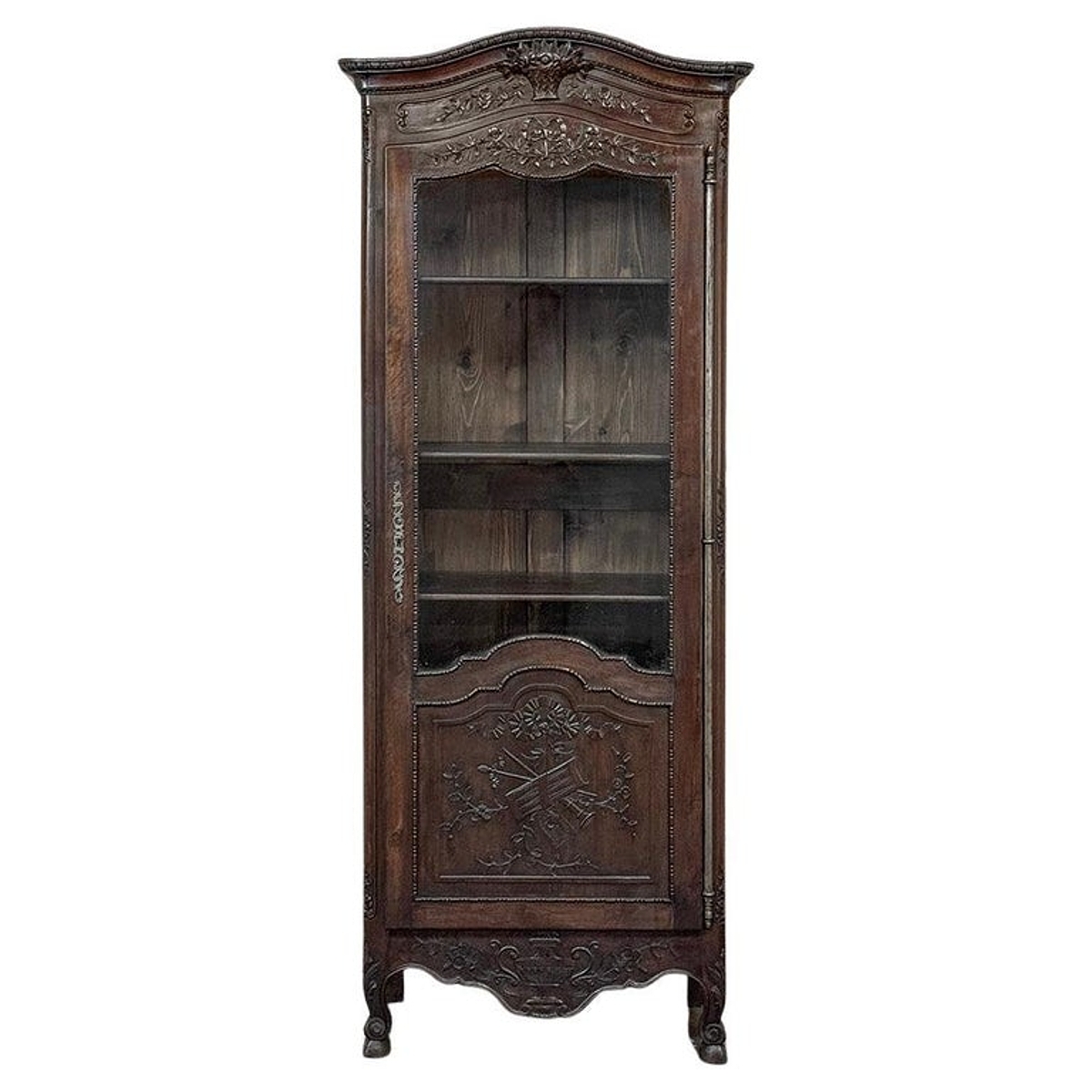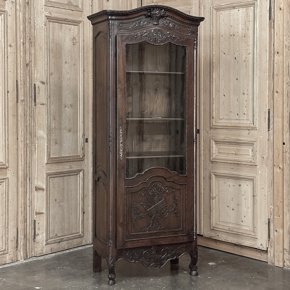 19th Century Country French Normandie Vitrine ~ Bonnetiere was crafted from solid fruitwood in the traditional techniques handed down for generations! The subtle arched crown was nicknamed le chapeau de gendarme after its resemblance to the hats of police officials of a bygone era. A basket of flowers stands proud at the peak of the crown, a classic motif used by the artisans of the area for centuries. Additional floral and foliate motifs in bas relief adorn the remainder of the crown as well as the corresponding top of the single door, which is hung by a full length steel barrel hinge, accented by the fancy steel key guard on the opposite side. The lower door panel has been lavished with a musical theme superposed over wildflowers held together with ribbon, while a classic urn adorns the boldly scrolled apron. The original hand-rolled glass allows one to enjoy items displayed on the upper shelves, with discreet storage behind the aforementioned door panel. C'est Tres Francaise!