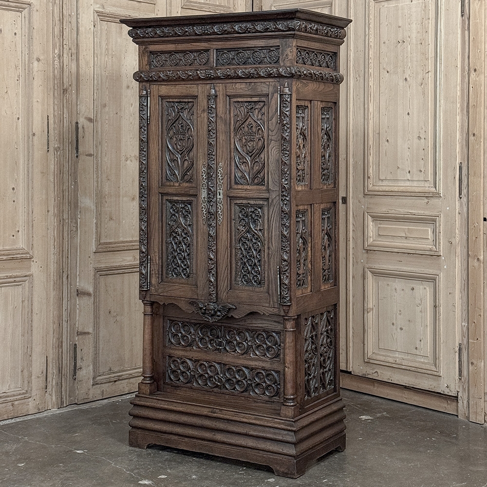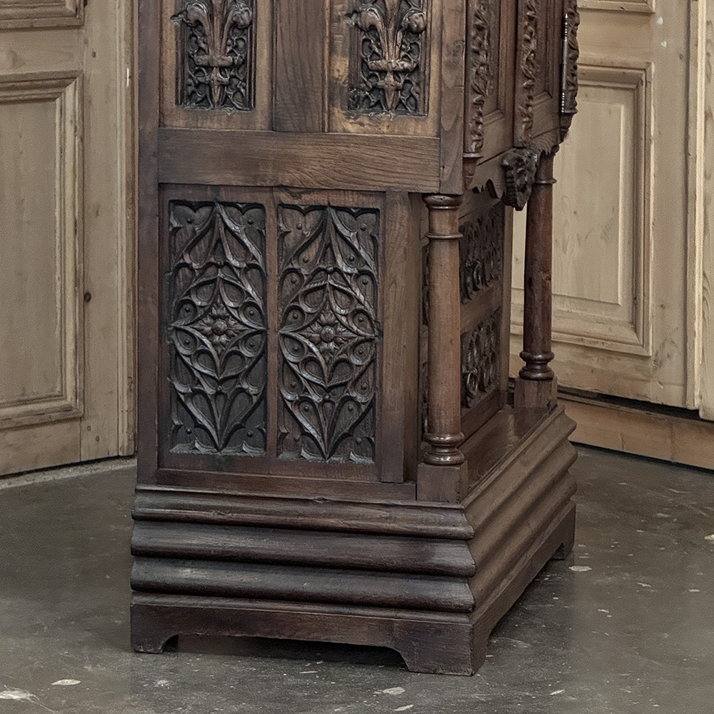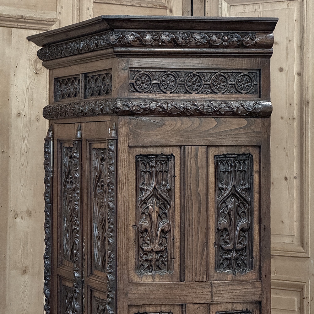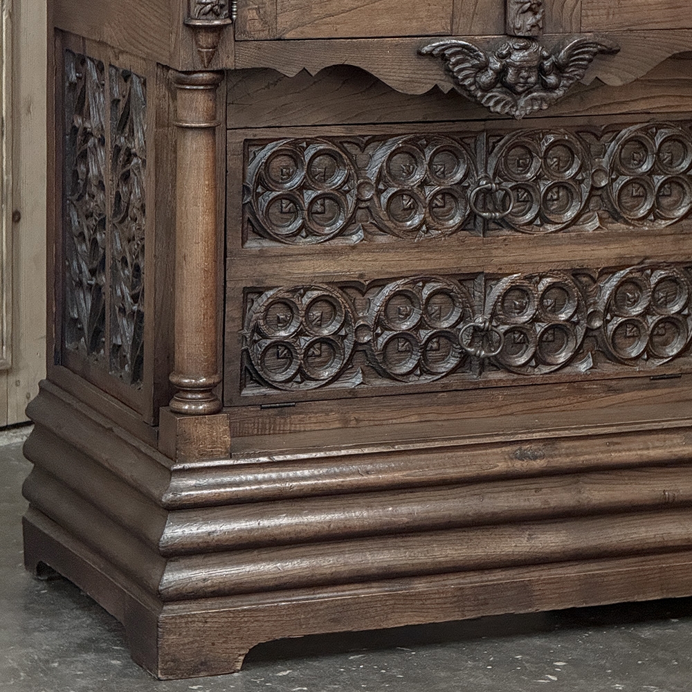 19th Century French Gothic Bonnetiere ~ Wardrobe ~ Cabinet will make a stunning addition to any room! Hand-crafted and sculpted to a level of mastery rarely seen, it features Gothic inspired motifs on all three sides. No less than five tiers of bordering appear on the crown alone, with two of them in bold full relief. The panels below, however, are captivating, with four on the pair of doors, five on each side and a double tier of quatrefoils on the bin cabinet at the bottom, making it appear to be two stacked drawers when in fact it's a drop-front bin, overlooked by a carved angel. Three carved half-round columns frame the upper cabinets, with one covering the gap between the doors accented by fancy steel key guards. Doors open to reveal shelf storage. A boldly molded base provides support.