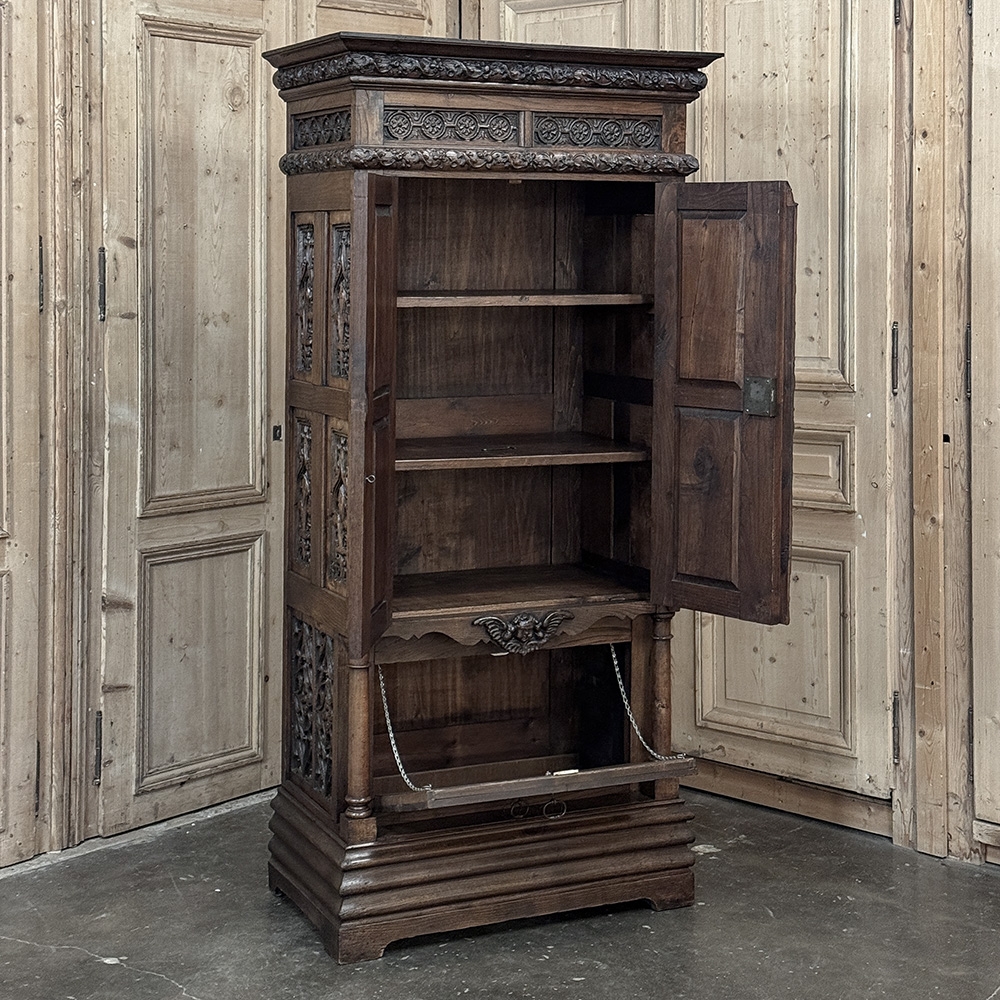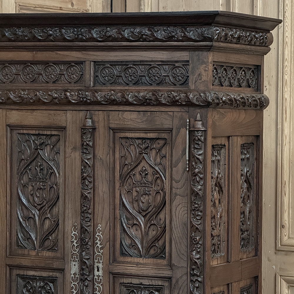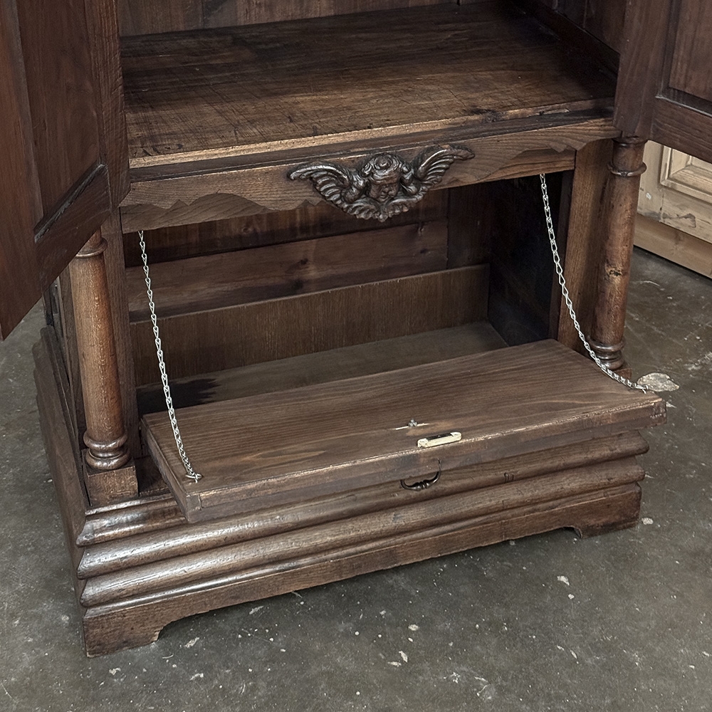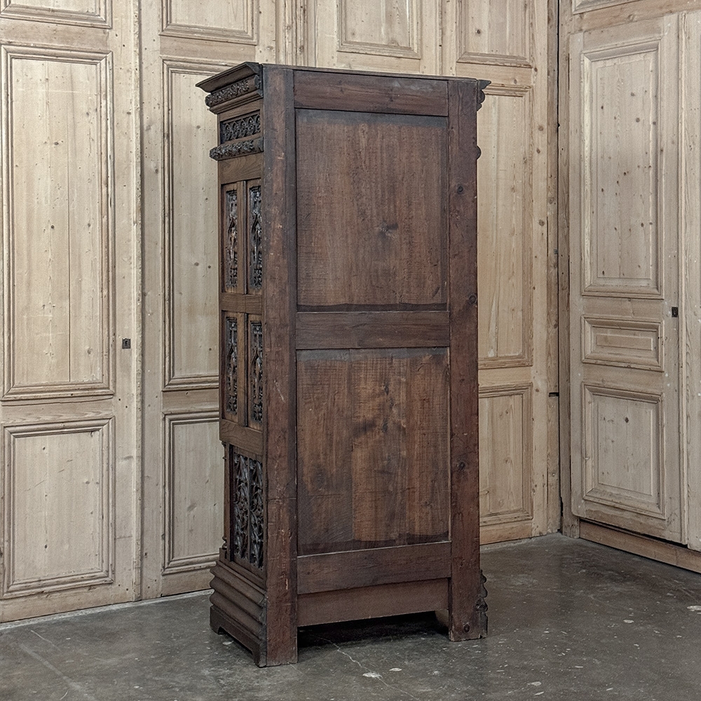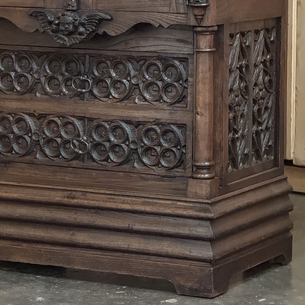 19th Century French Gothic Bonnetiere ~ Wardrobe ~ Cabinet will make a stunning addition to any room! Hand-crafted and sculpted to a level of mastery rarely seen, it features Gothic inspired motifs on all three sides. No less than five tiers of bordering appear on the crown alone, with two of them in bold full relief. The panels below, however, are captivating, with four on the pair of doors, five on each side and a double tier of quatrefoils on the bin cabinet at the bottom, making it appear to be two stacked drawers when in fact it's a drop-front bin, overlooked by a carved angel. Three carved half-round columns frame the upper cabinets, with one covering the gap between the doors accented by fancy steel key guards. Doors open to reveal shelf storage. A boldly molded base provides support.