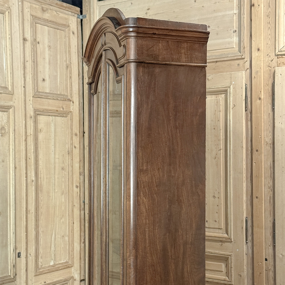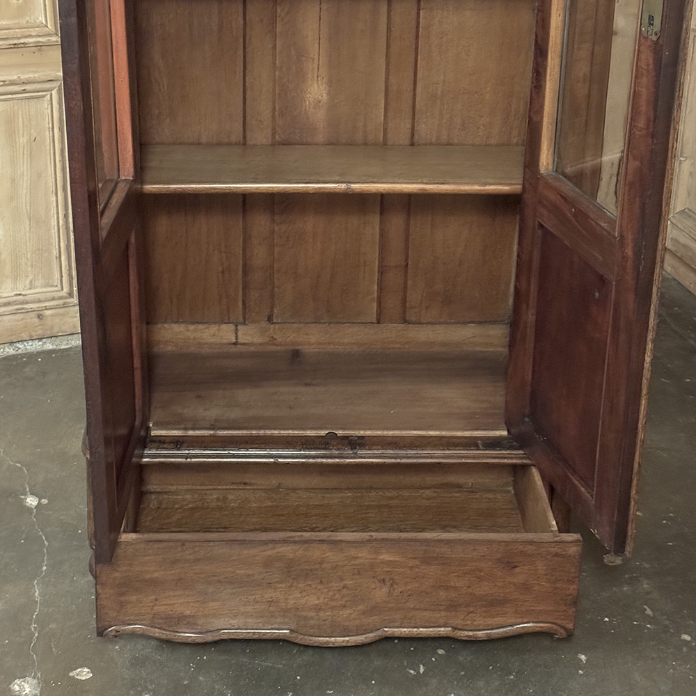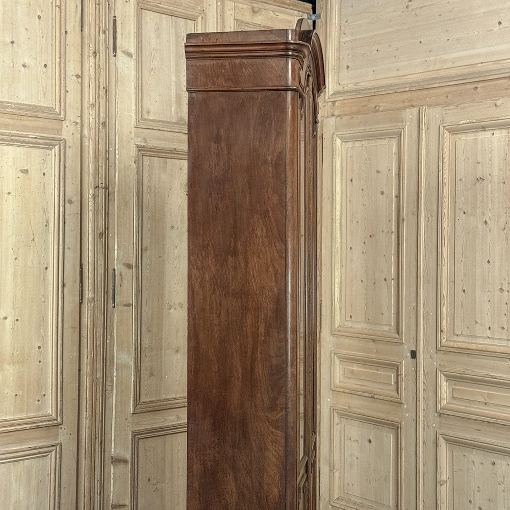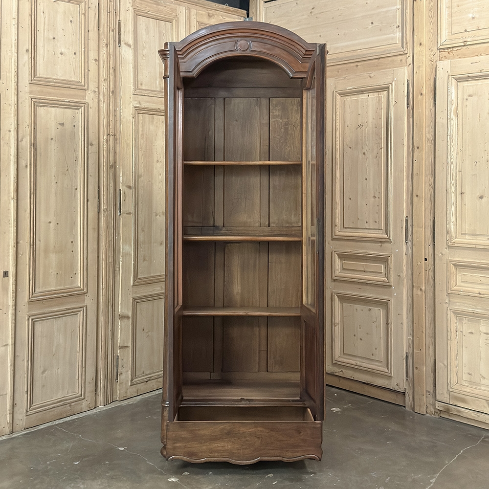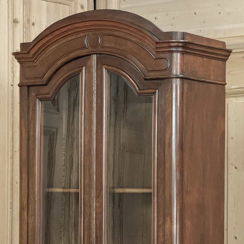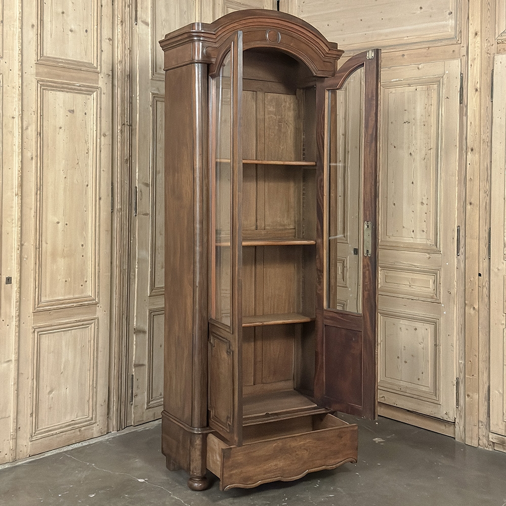 19th Century French Louis Philippe Period Walnut Vitrine ~ Bookcase is the definition of understated elegance! Crafted during an architecturally austere era, it consists of a broad arched crown and subtly scrolled apron fitted with bun feet as its primary design features. Remarkably fine molded detail appears in abundance from the crown which includes a circular form at the pinnacle of the arch on the bonnet. The 3/4 glazed doors below are arched to follow the crown's contours, and consist of single long panes of the original hand-rolled glass for incredible character. One-quarter molded panels below allow one to discreetly store items at the bottom of the interior, which still boasts its original adjustable shelves! The fine walnut exudes luxury especially on the aforementioned lower door panels and especially each side. Extra shallow design is perfect for cozy rooms or high-traffic areas.