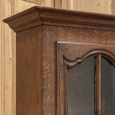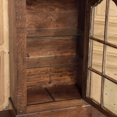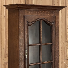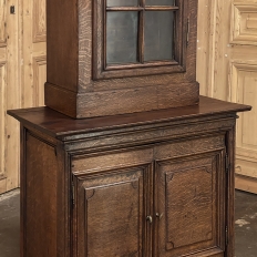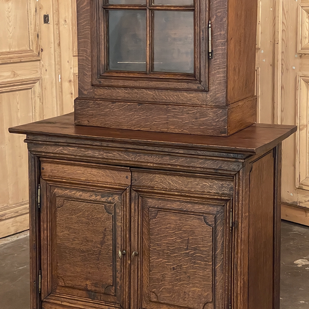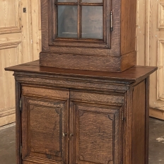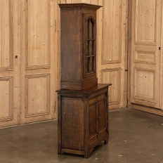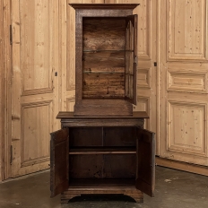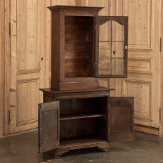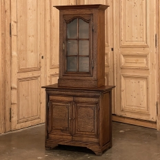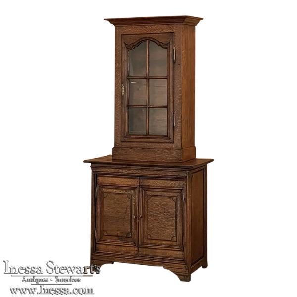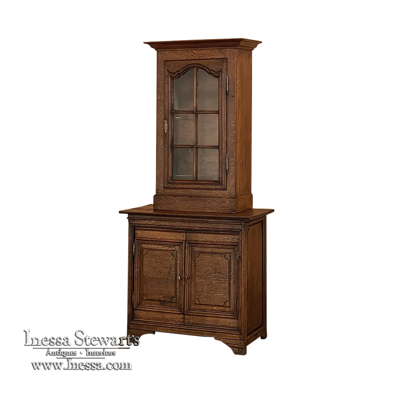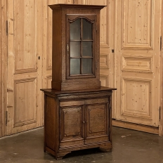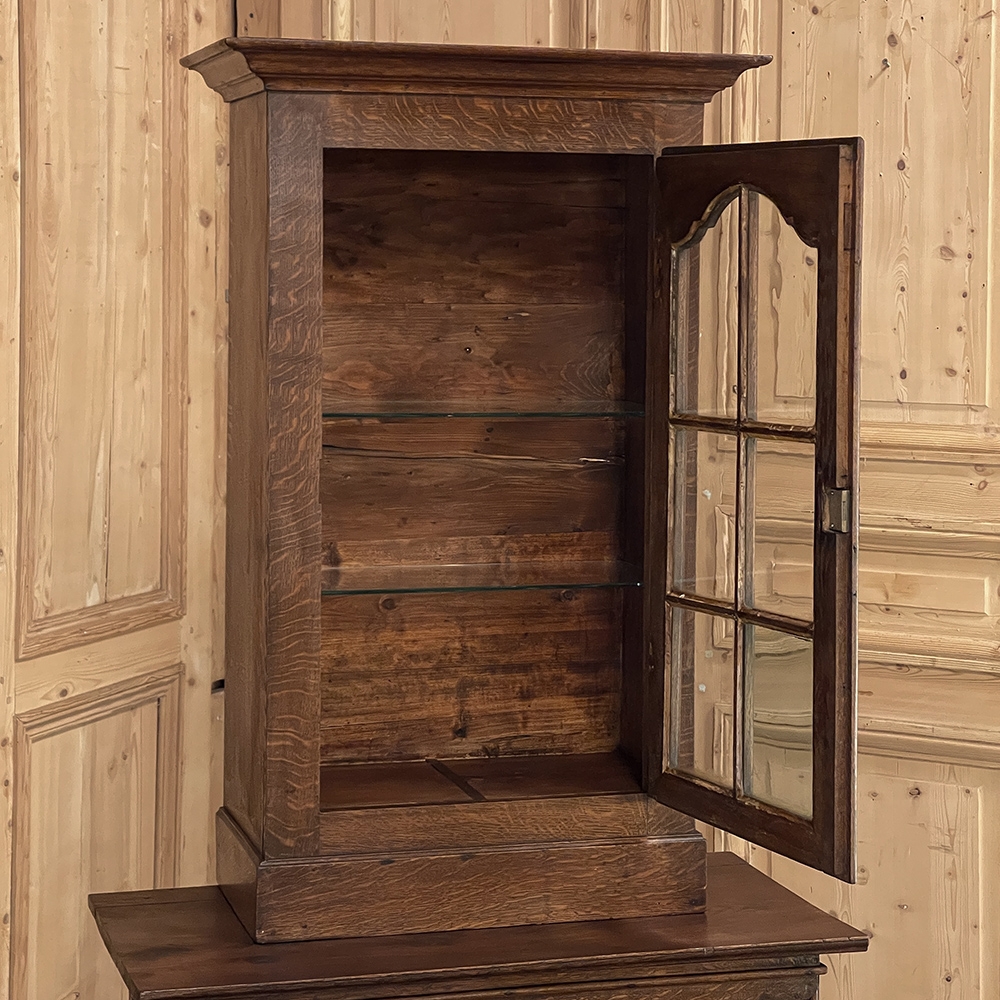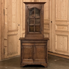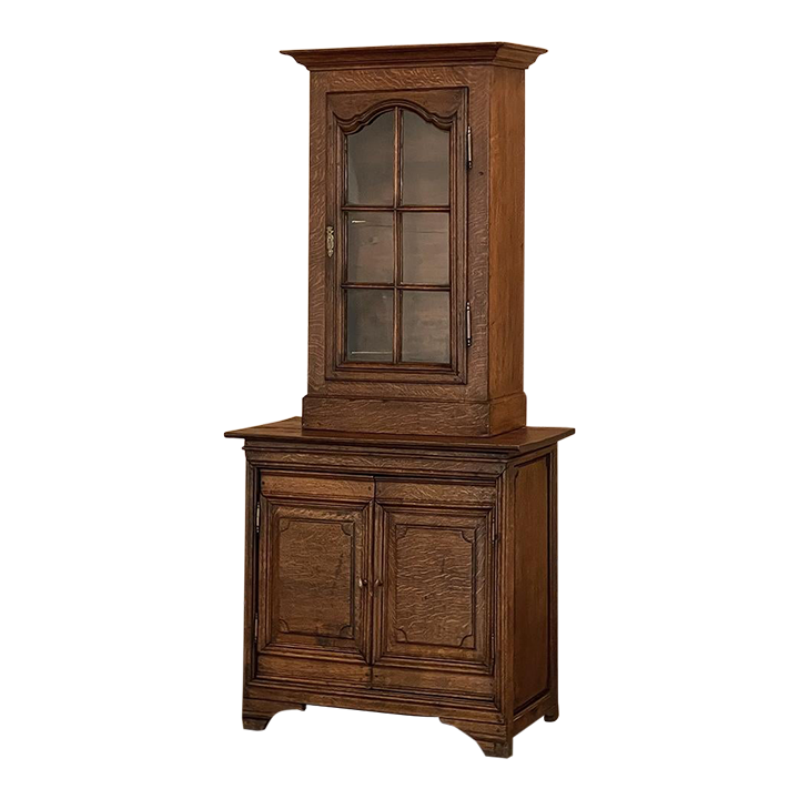 Sale19th Century Rustic Country French Vitrine ~ Confiturier is a great choice for a small bookcase in a cozy office, a display for a treasured collection, or just an interesting piece that provides storage and a modicum of display for any casual decor! Tailored molding appears on the top, with a gentle arch to the glazed upper door just underneath that affords one the ability to view the contents above, while the slightly larger two door cabinet below, sized like a confiturier (small buffet), provides more discreet storage with more tailored panels and subtle molded detail. Corbel-style legs add a nice, sturdy touch. Doors open wide thanks to the exterior-mounted brass hinges, and brass knobs below with a brass key guard above complete the look.
