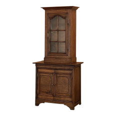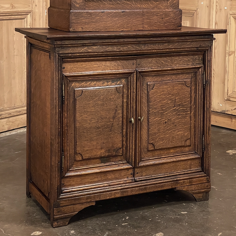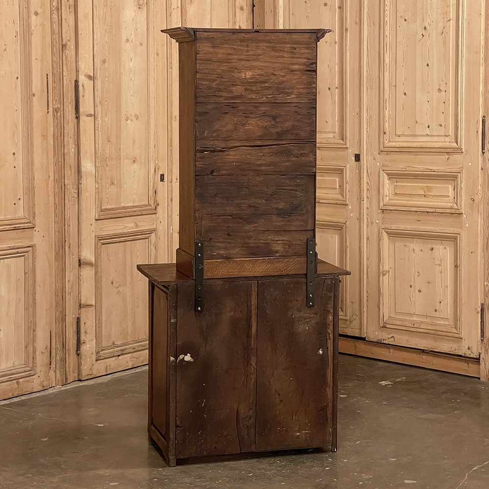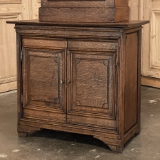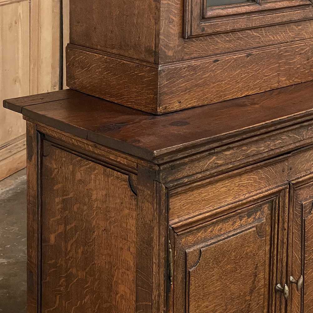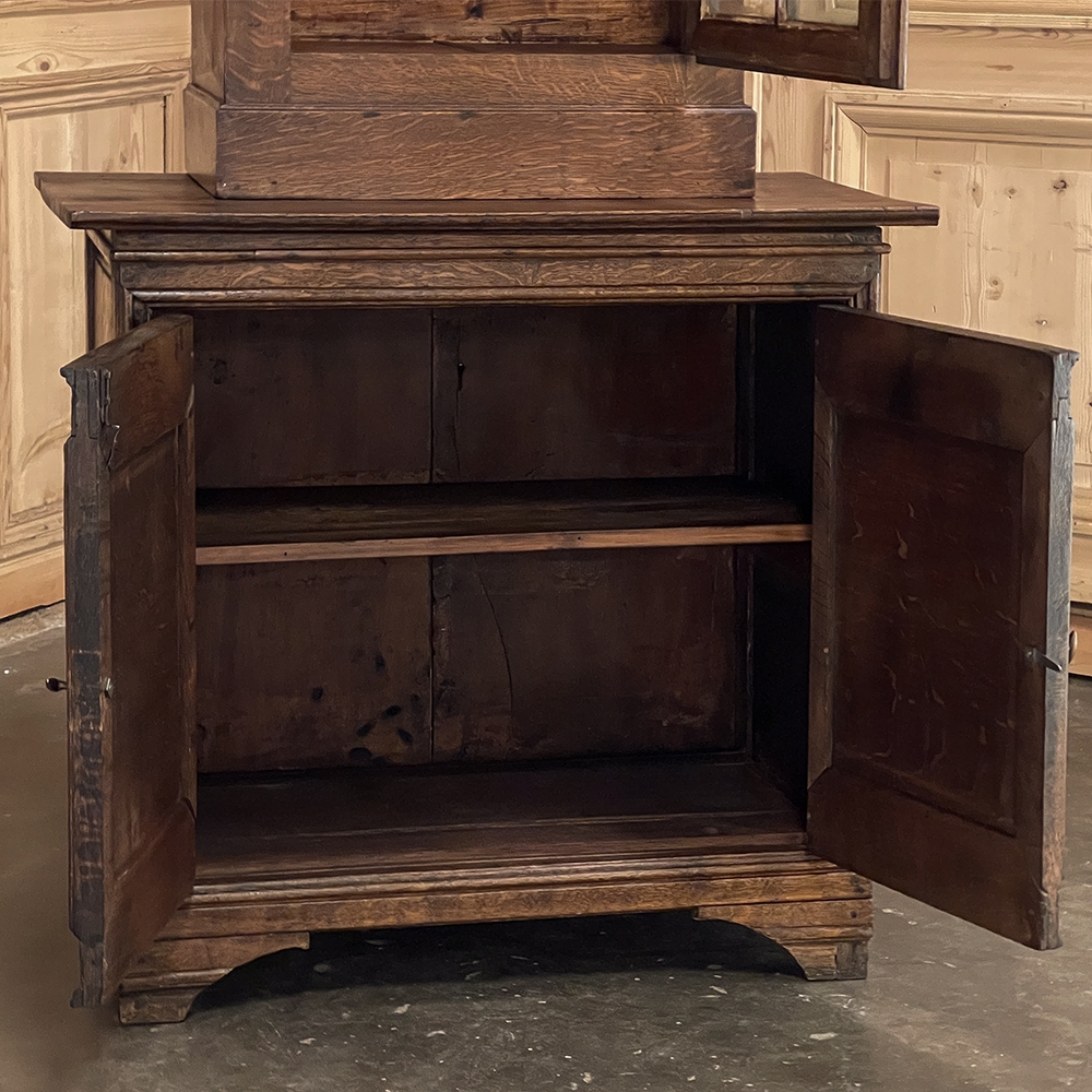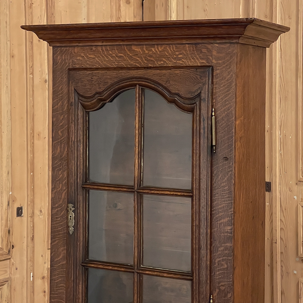 Sale19th Century Rustic Country French Vitrine ~ Confiturier is a great choice for a small bookcase in a cozy office, a display for a treasured collection, or just an interesting piece that provides storage and a modicum of display for any casual decor! Tailored molding appears on the top, with a gentle arch to the glazed upper door just underneath that affords one the ability to view the contents above, while the slightly larger two door cabinet below, sized like a confiturier (small buffet), provides more discreet storage with more tailored panels and subtle molded detail. Corbel-style legs add a nice, sturdy touch. Doors open wide thanks to the exterior-mounted brass hinges, and brass knobs below with a brass key guard above complete the look.