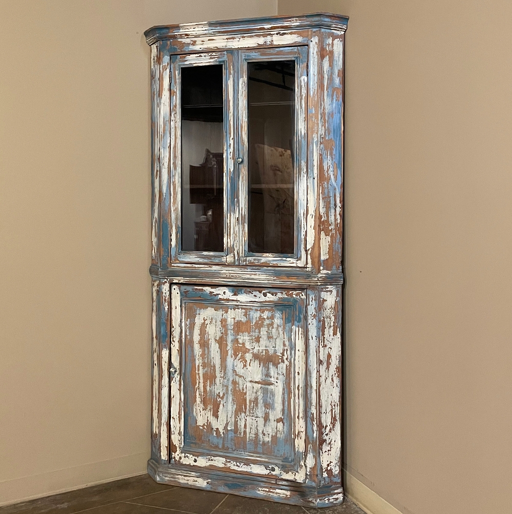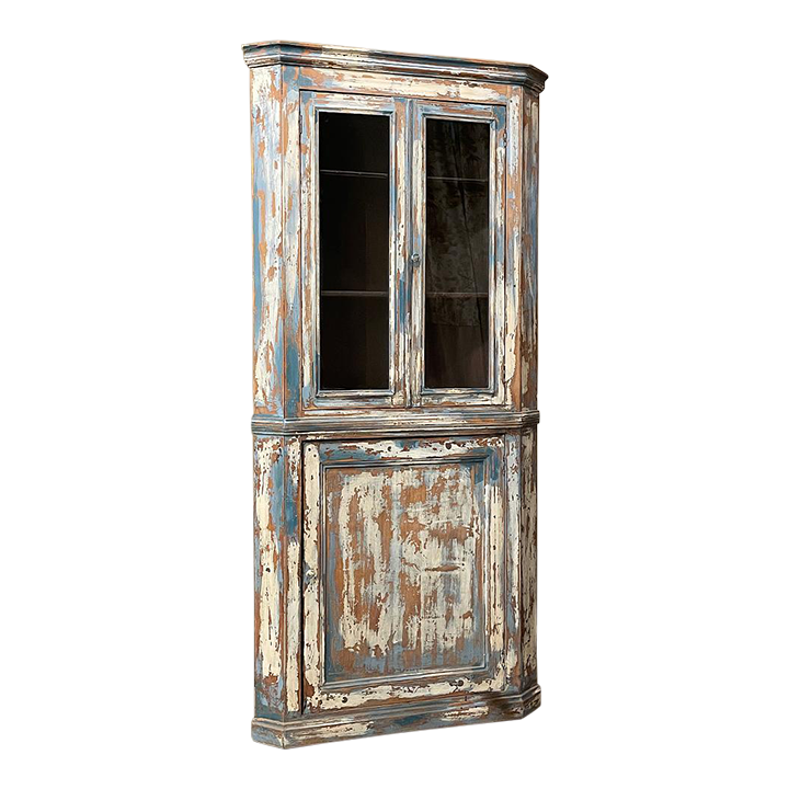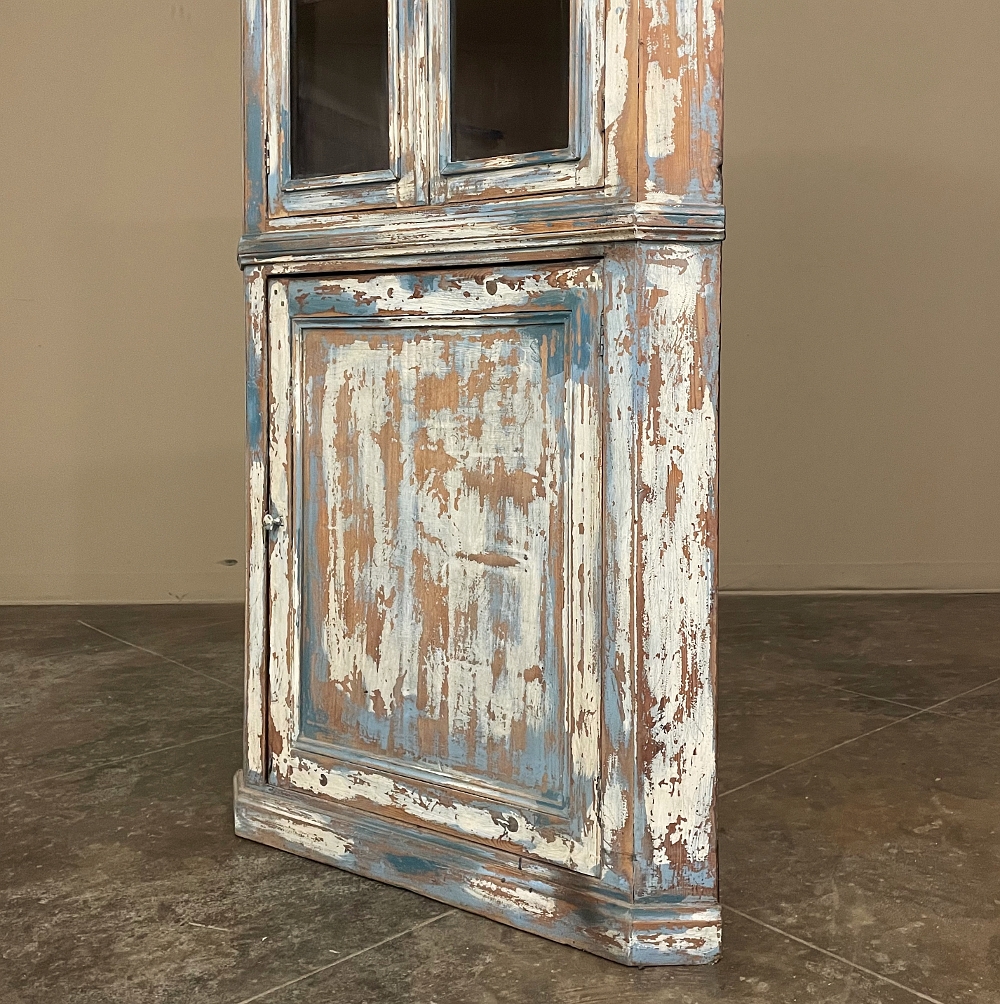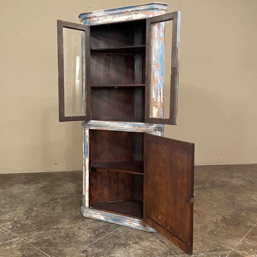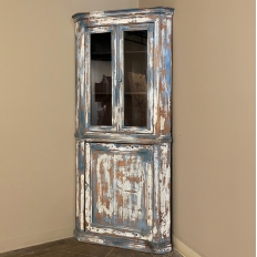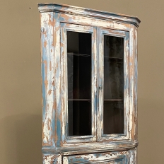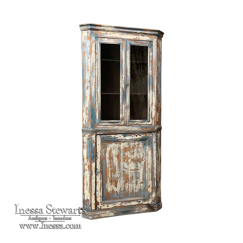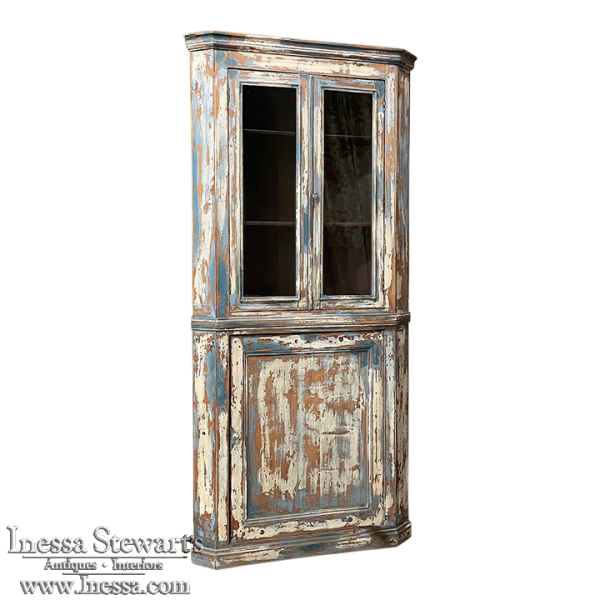 19th Century Rustic Swedish Painted Corner Cabinet features a wonderful distressed painted finish that reveals the natural color of the wood underneath an off white layer of paint which lies beneath the outermost layer of bluish-gray paint for a charming casual look! Subtle molded detail appears at the crown, separating the top tier from the bottom cabinet, and at the base. The top is fitted with two glazed doors so one can display family keepsakes or collectibles above, while the single door below opens wide to accommodate stored items. Pegged mortise & tenon joinery and solid, traditional craftsmanship ensure this will remain a family heirloom for generations to come!