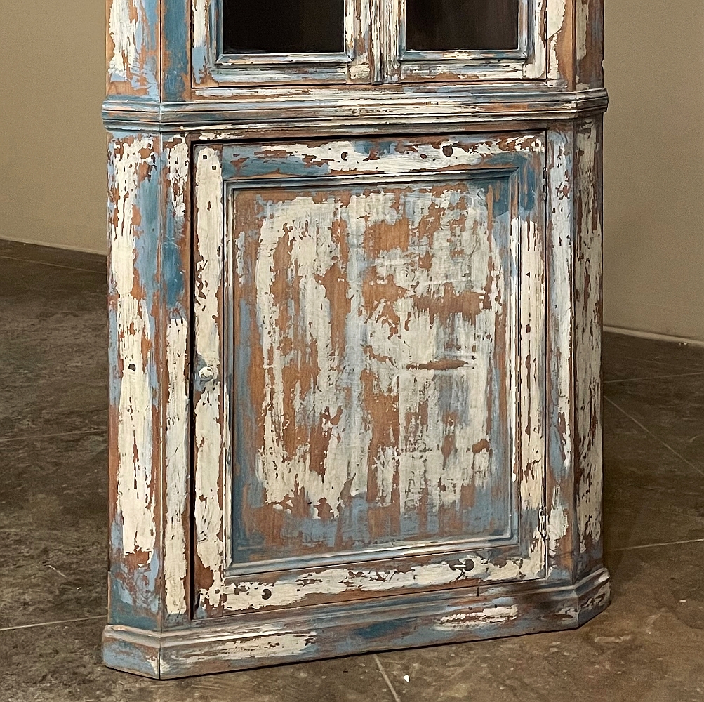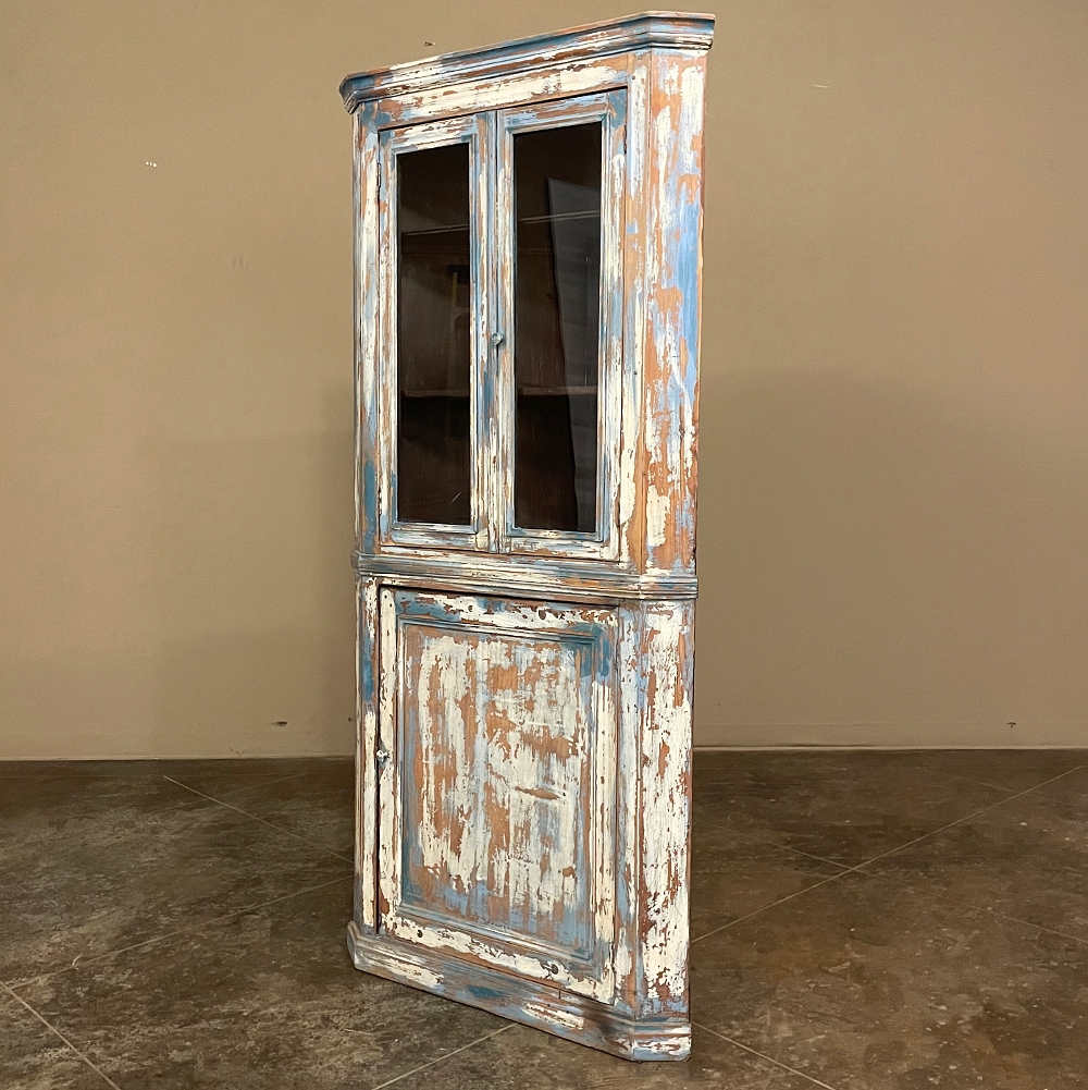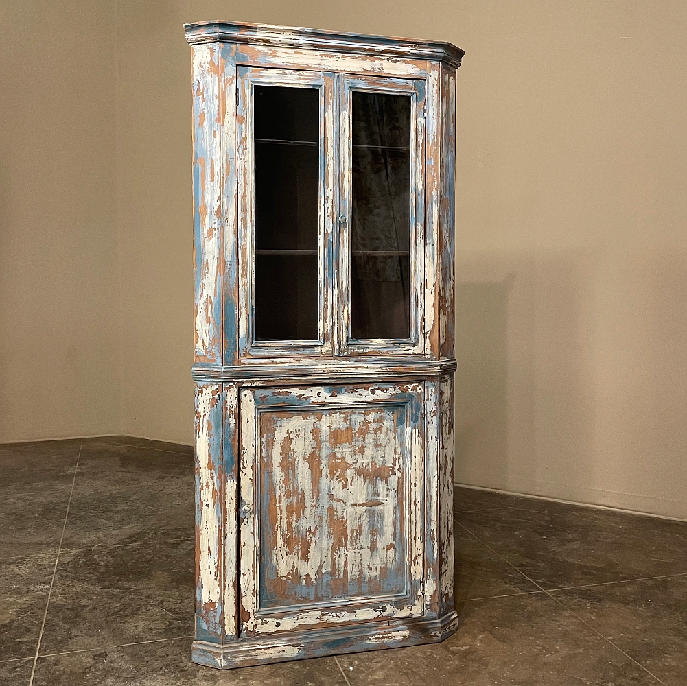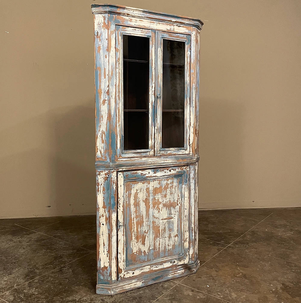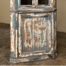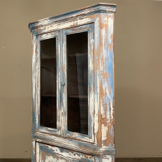 19th Century Rustic Swedish Painted Corner Cabinet features a wonderful distressed painted finish that reveals the natural color of the wood underneath an off white layer of paint which lies beneath the outermost layer of bluish-gray paint for a charming casual look! Subtle molded detail appears at the crown, separating the top tier from the bottom cabinet, and at the base. The top is fitted with two glazed doors so one can display family keepsakes or collectibles above, while the single door below opens wide to accommodate stored items. Pegged mortise & tenon joinery and solid, traditional craftsmanship ensure this will remain a family heirloom for generations to come!