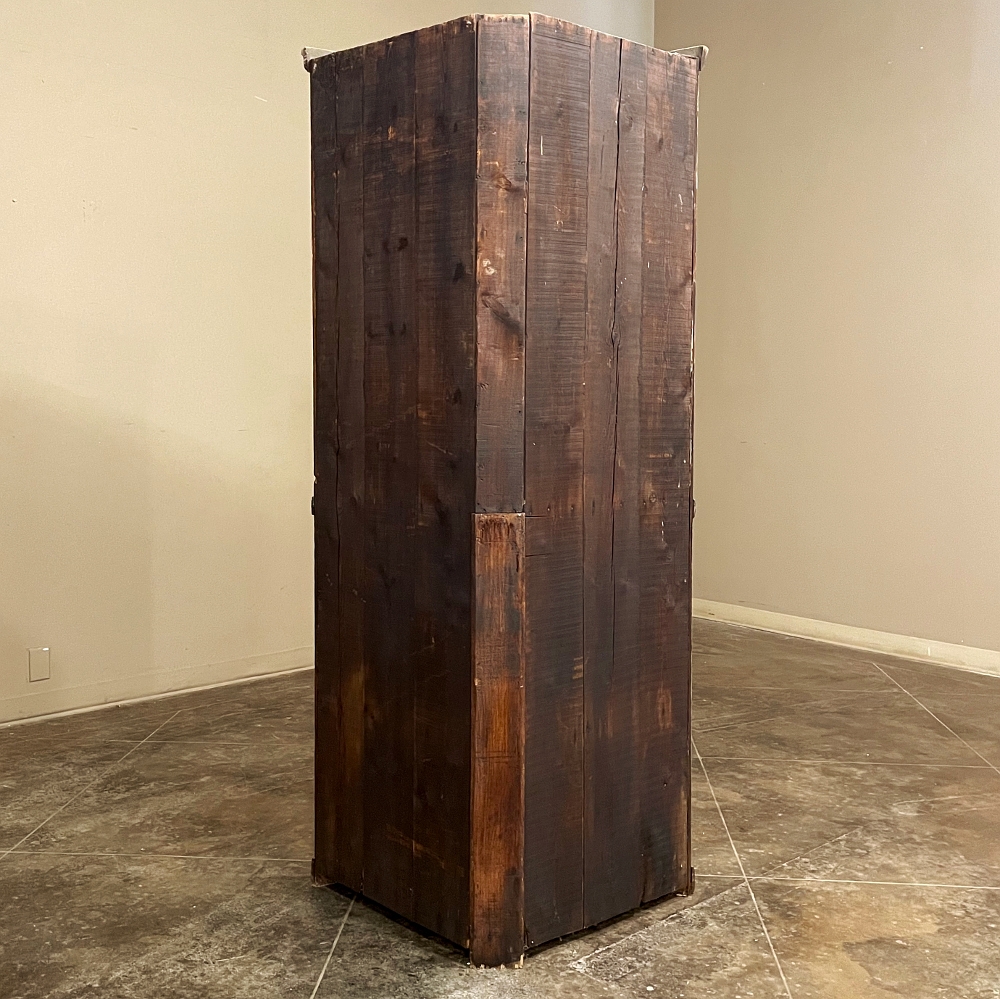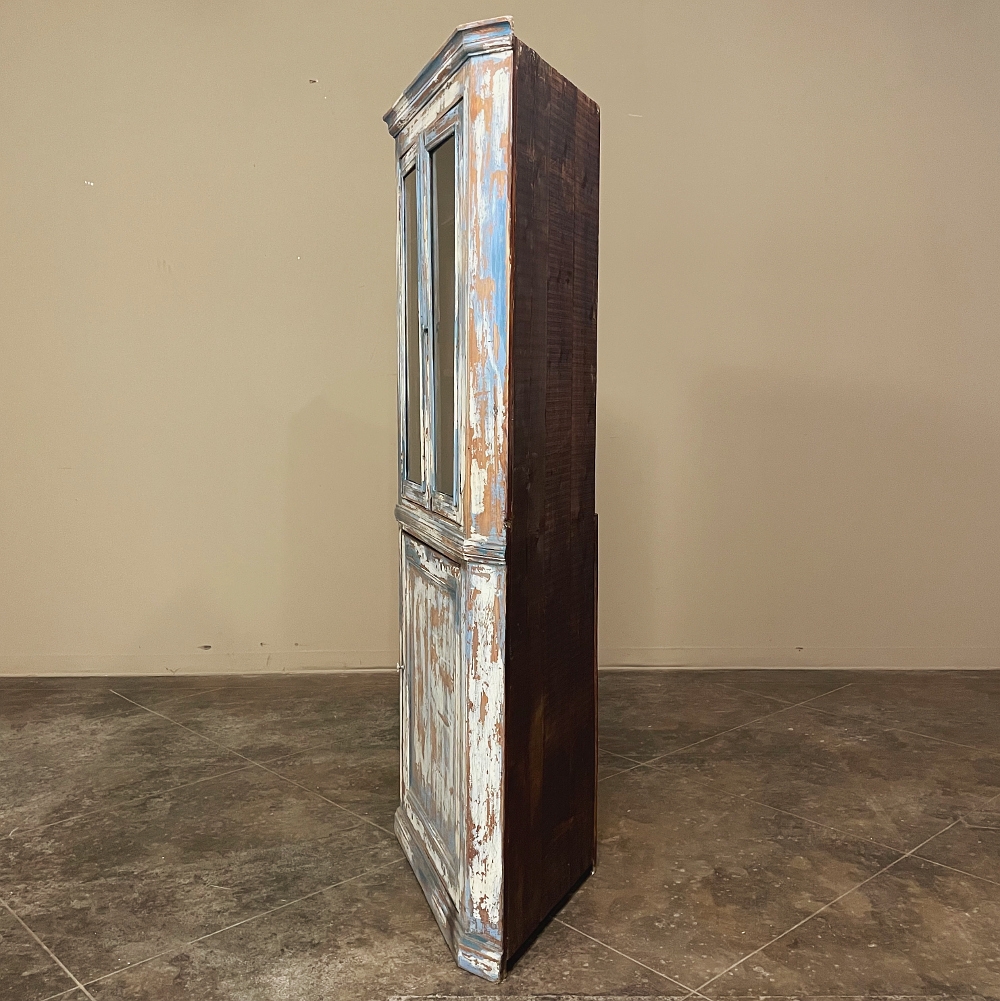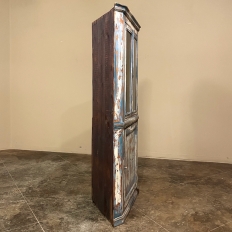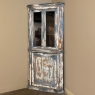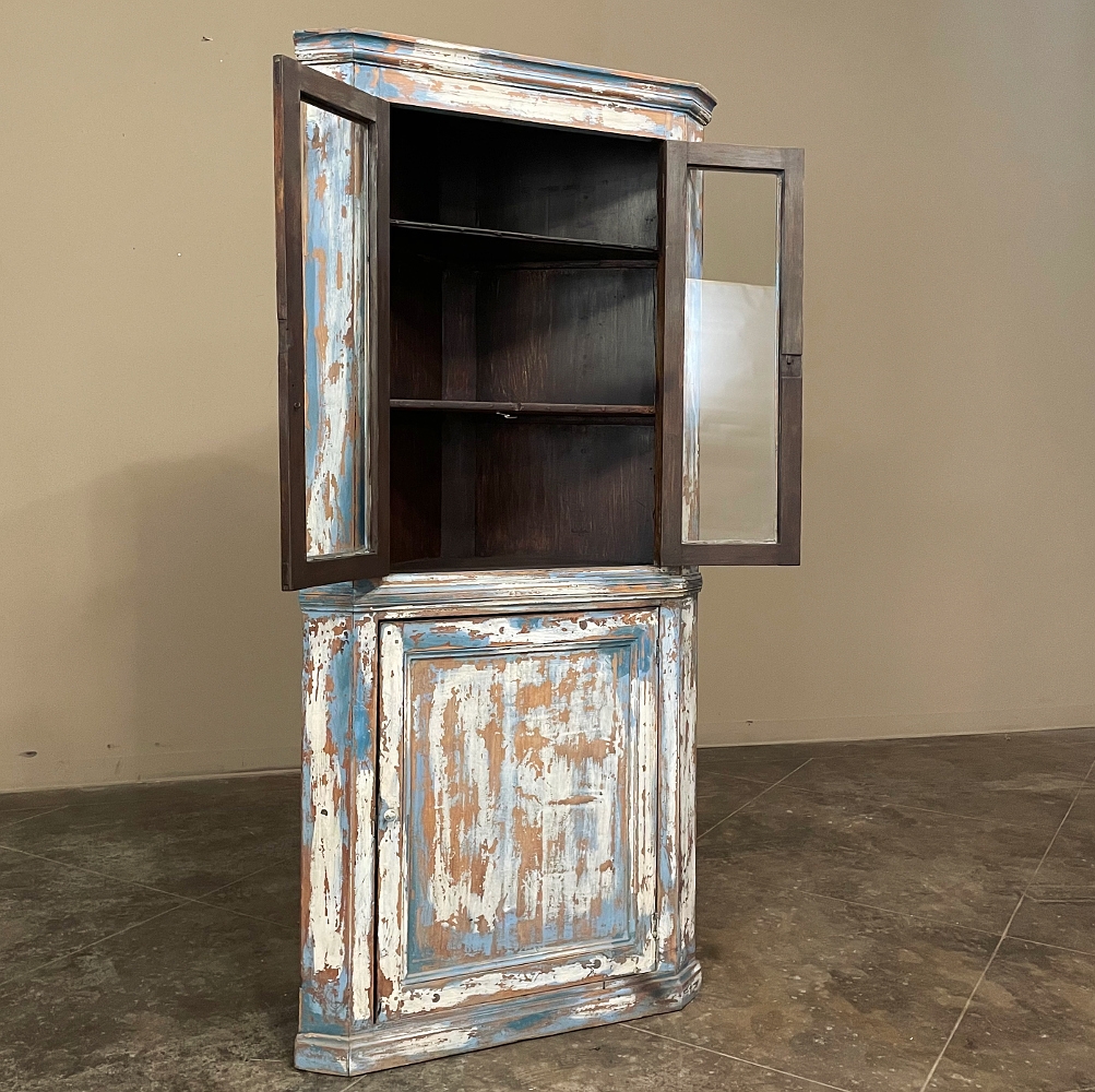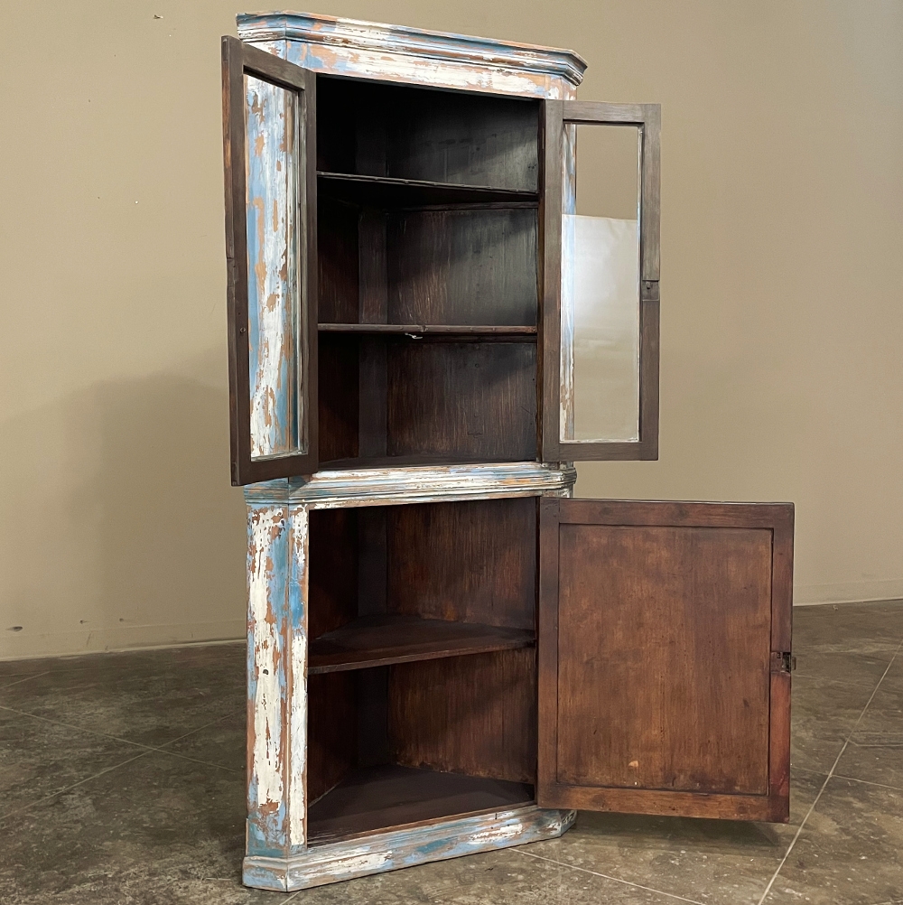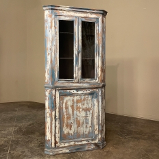 19th Century Rustic Swedish Painted Corner Cabinet features a wonderful distressed painted finish that reveals the natural color of the wood underneath an off white layer of paint which lies beneath the outermost layer of bluish-gray paint for a charming casual look! Subtle molded detail appears at the crown, separating the top tier from the bottom cabinet, and at the base. The top is fitted with two glazed doors so one can display family keepsakes or collectibles above, while the single door below opens wide to accommodate stored items. Pegged mortise & tenon joinery and solid, traditional craftsmanship ensure this will remain a family heirloom for generations to come!