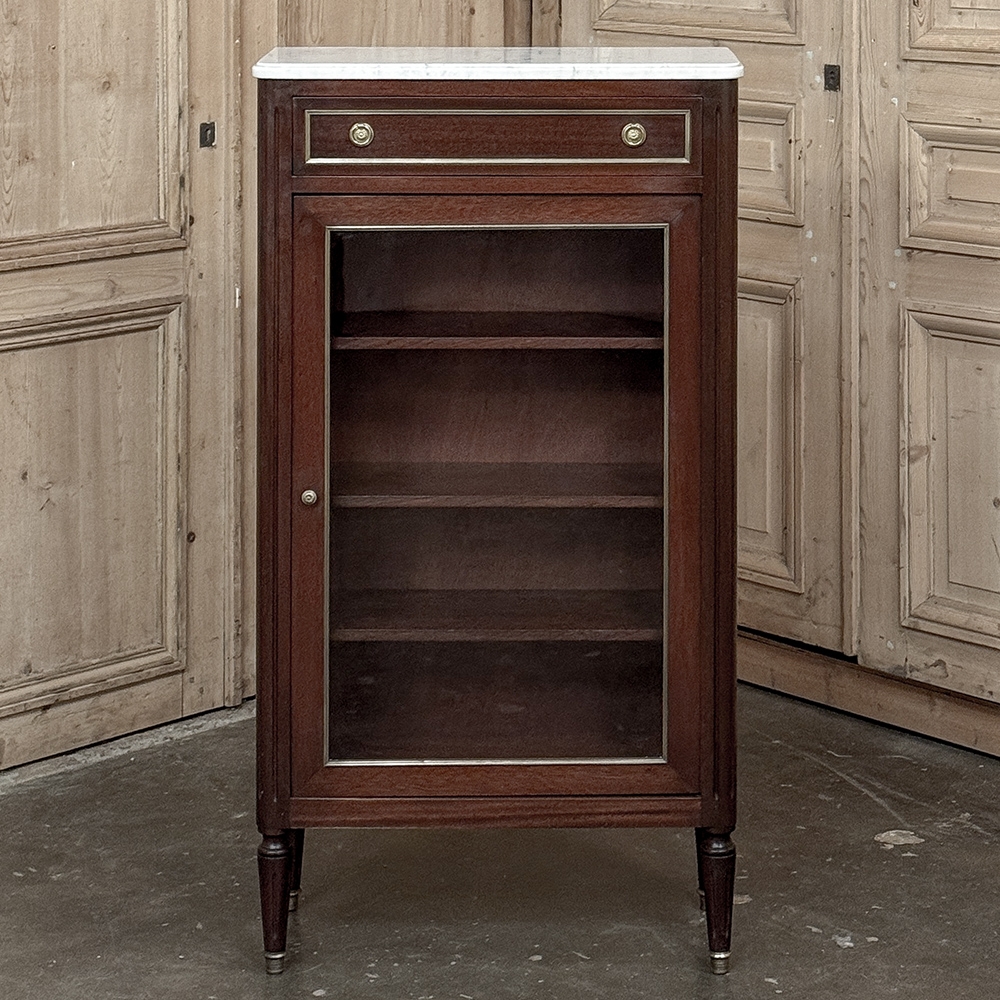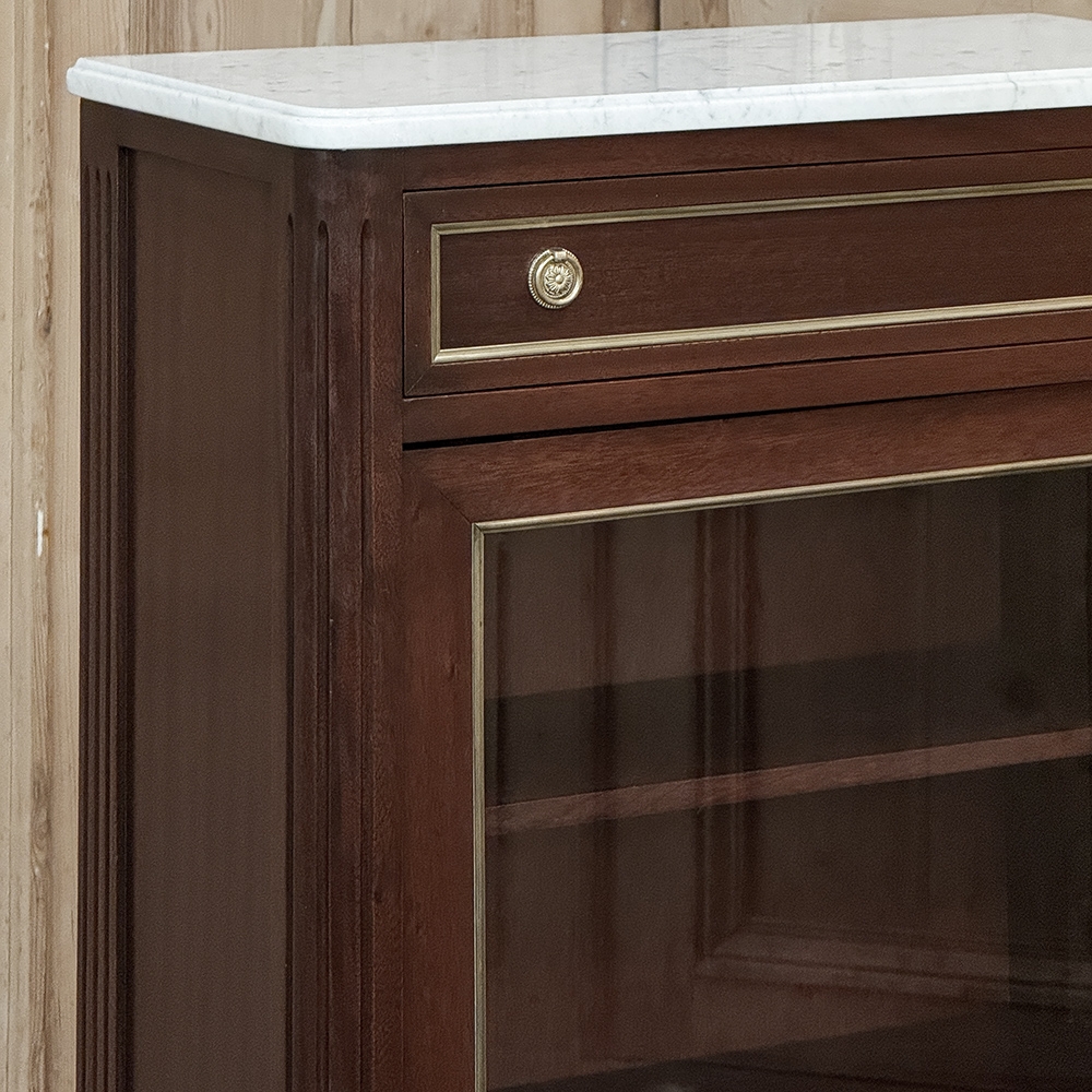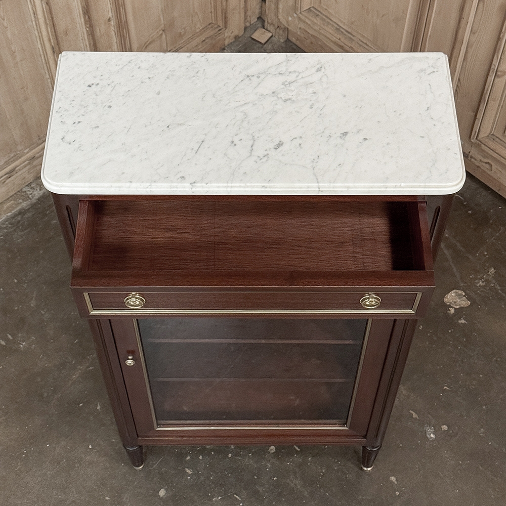 Antique Directoire Style Mahogany Petite Vitrine with Carrara Marble was hand-crafted in the mid-1900s out of exotic imported mahogany, then trimmed in brass and fitted with brass drawer and cabinet knobs, then finally topped with elegant Carrara marble for a clean, tailored look that blends so well with a huge variety of decor styles! The design is also exceptionally shallow, making it a good choice for high-traffic areas, entryways, hallways, even stairwell landings. The door is fitted with generously sized glazing allowing you to display its contents on no less that three adjustable shelves, with the floor serving as the fourth surface. The drawer provides a convenience feature normally not found on a piece of this size. Finally, four turned and tapered legs fitted with brass feet provide support.