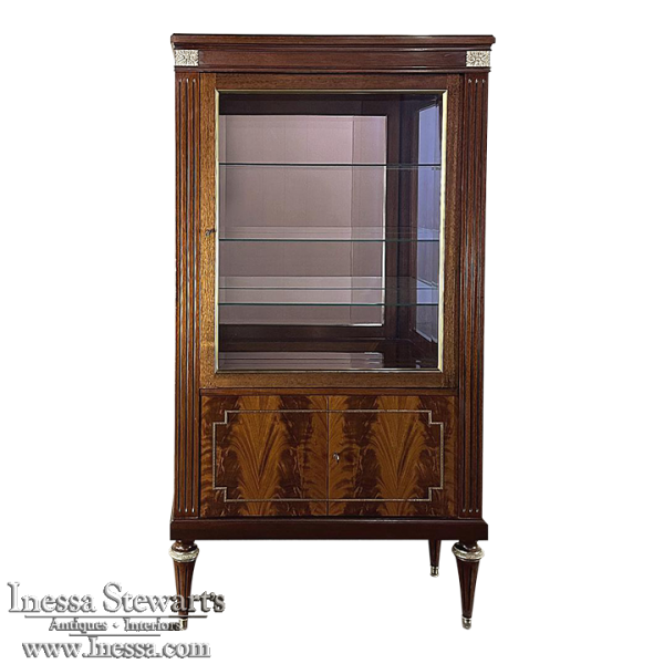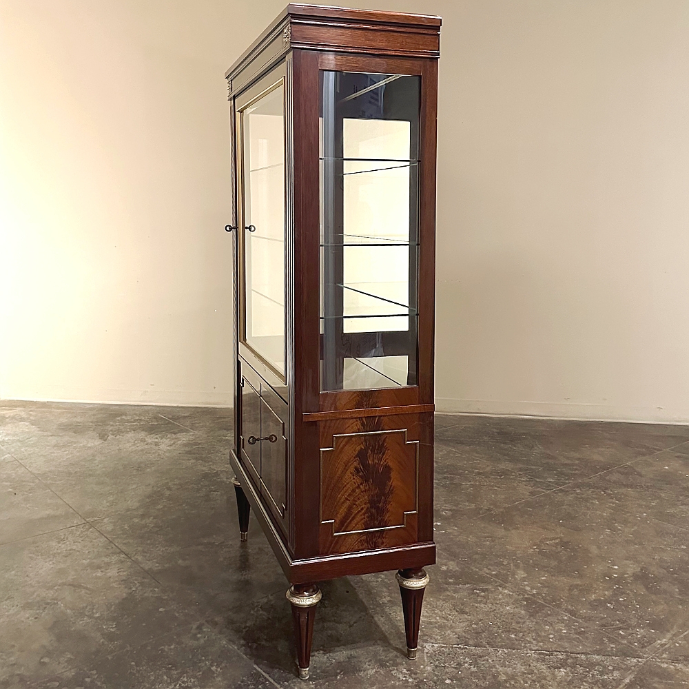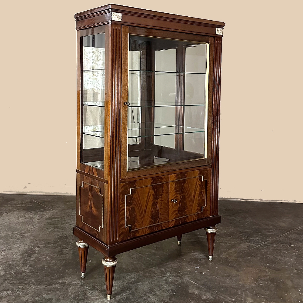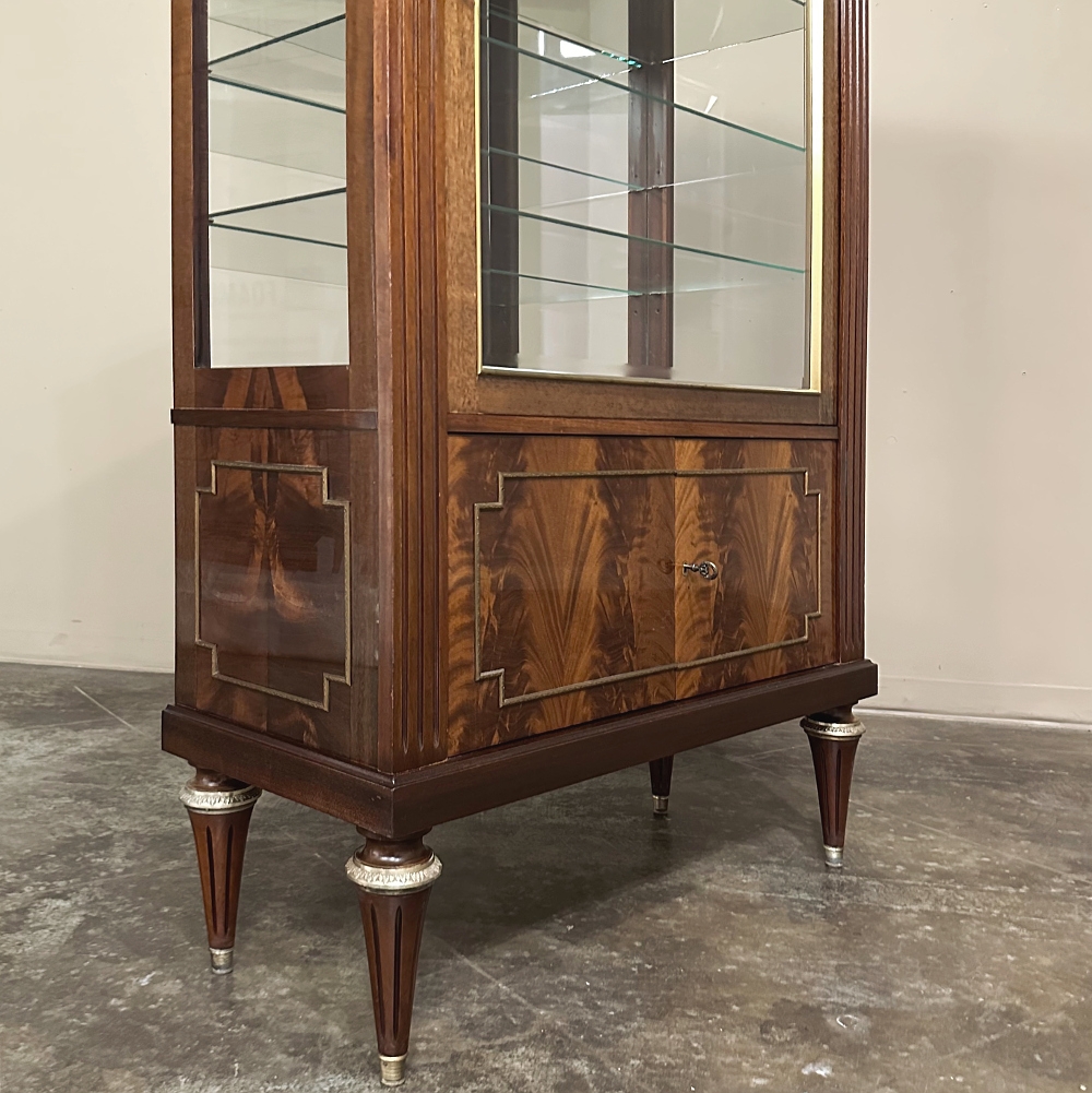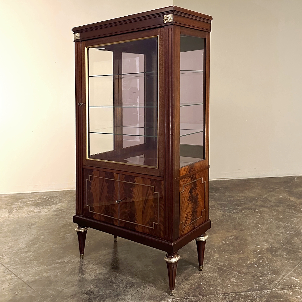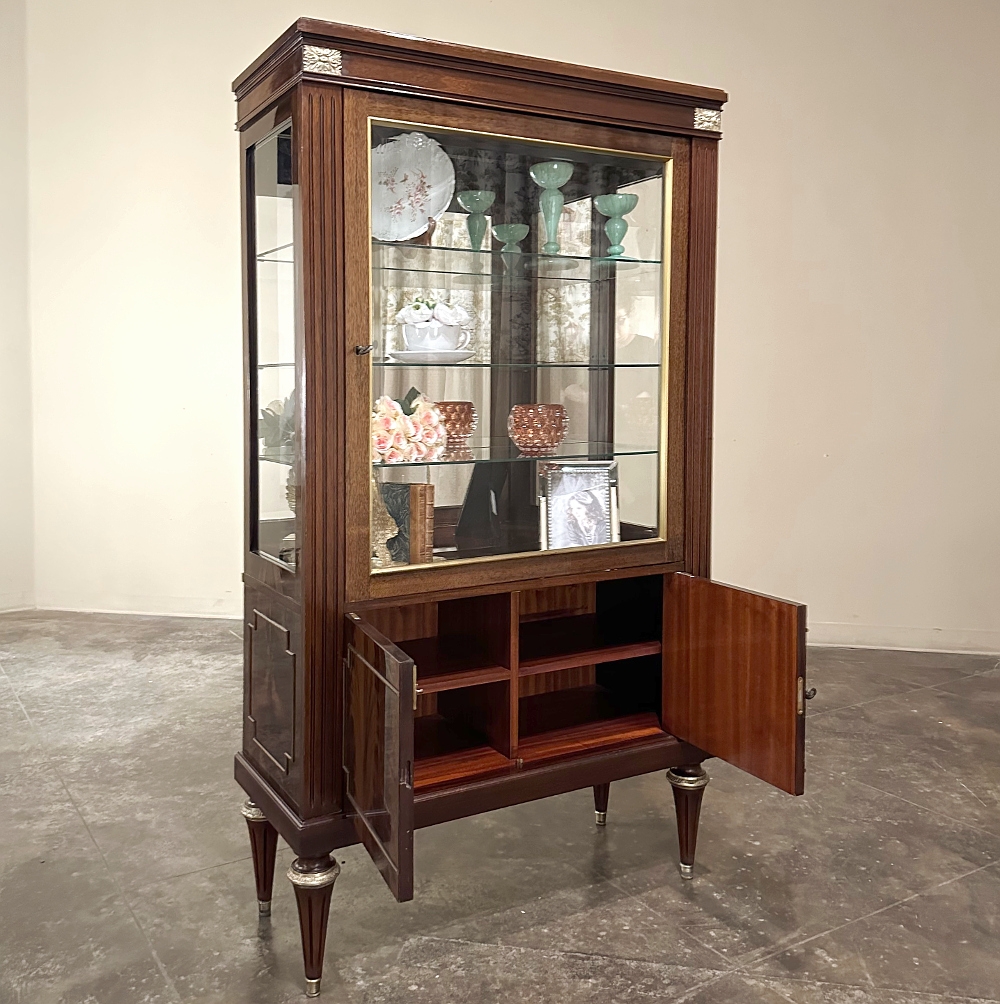 Antique French Louis XVI Flame Mahogany Vitrine is the perfect choice to display your family heirlooms, special collection, or just a seasonal display! Hand-crafted from imported mahogany, it features flame pattern veneers on the front and sides. Tailored molding provides the trim and a panel effect on the lower portion, which opens up to reveal a nice storage area. The fronts of the corner posts are fluted, and frame the glass on all three sides, allowing ample ambient light in which negates the necessity of artificial lighting, especially with the three original glass shelves and mirrored back. Cast brass rosettes on top and ring collars on the tops of the tapered and fluted legs, as well as leg tips below, all combine to add a little elegance to the otherwise understated style.