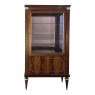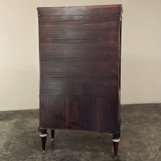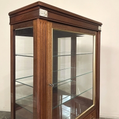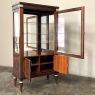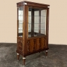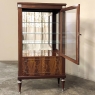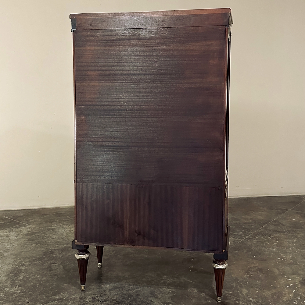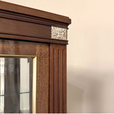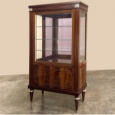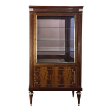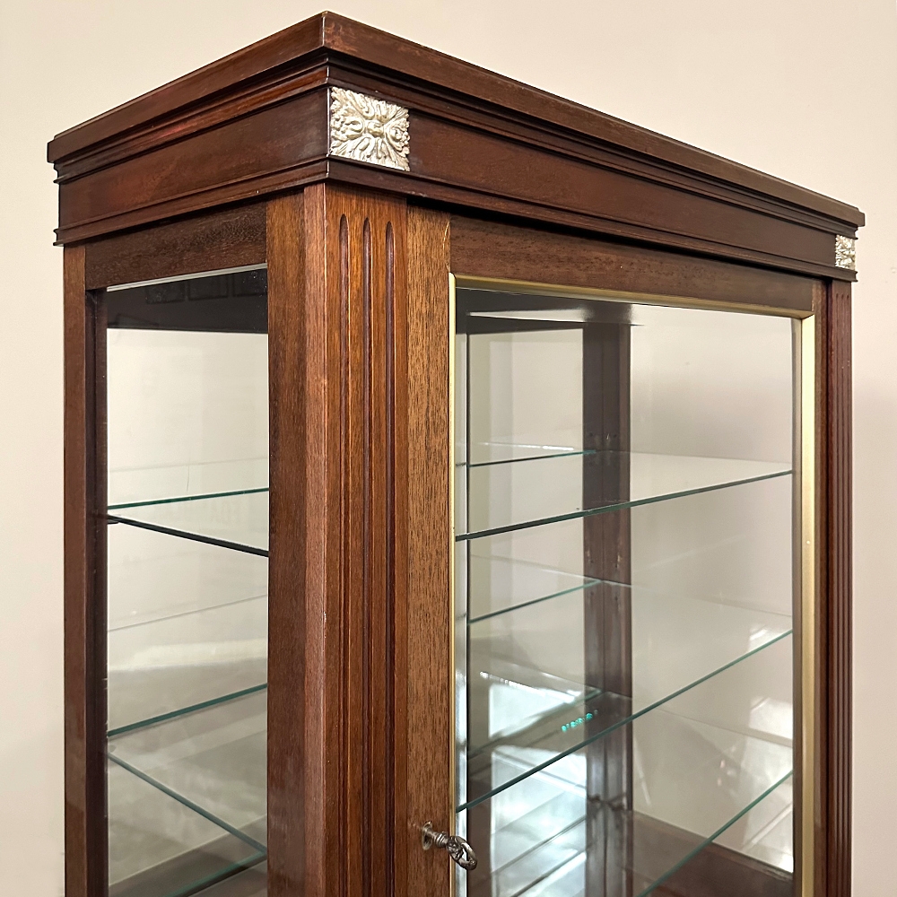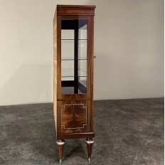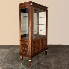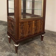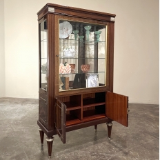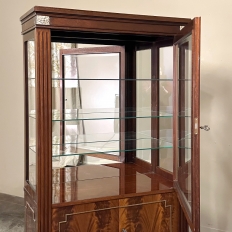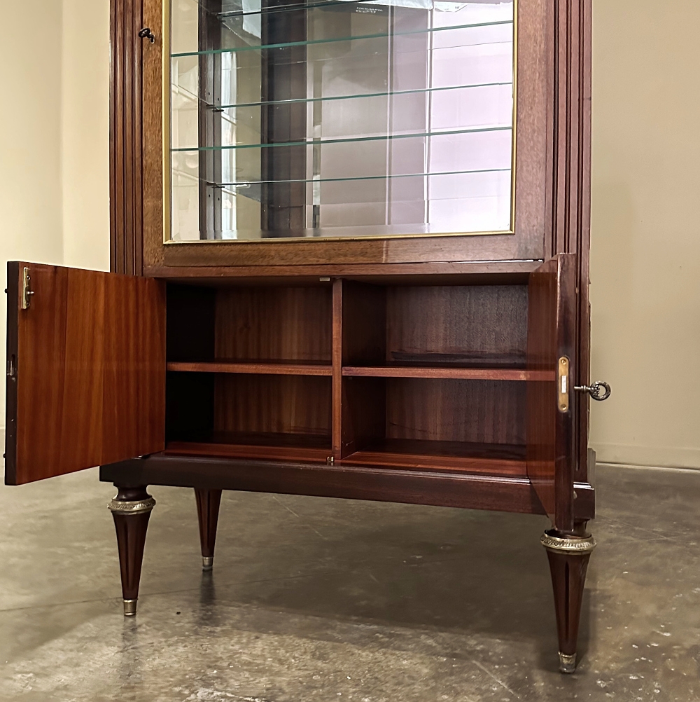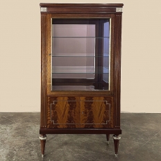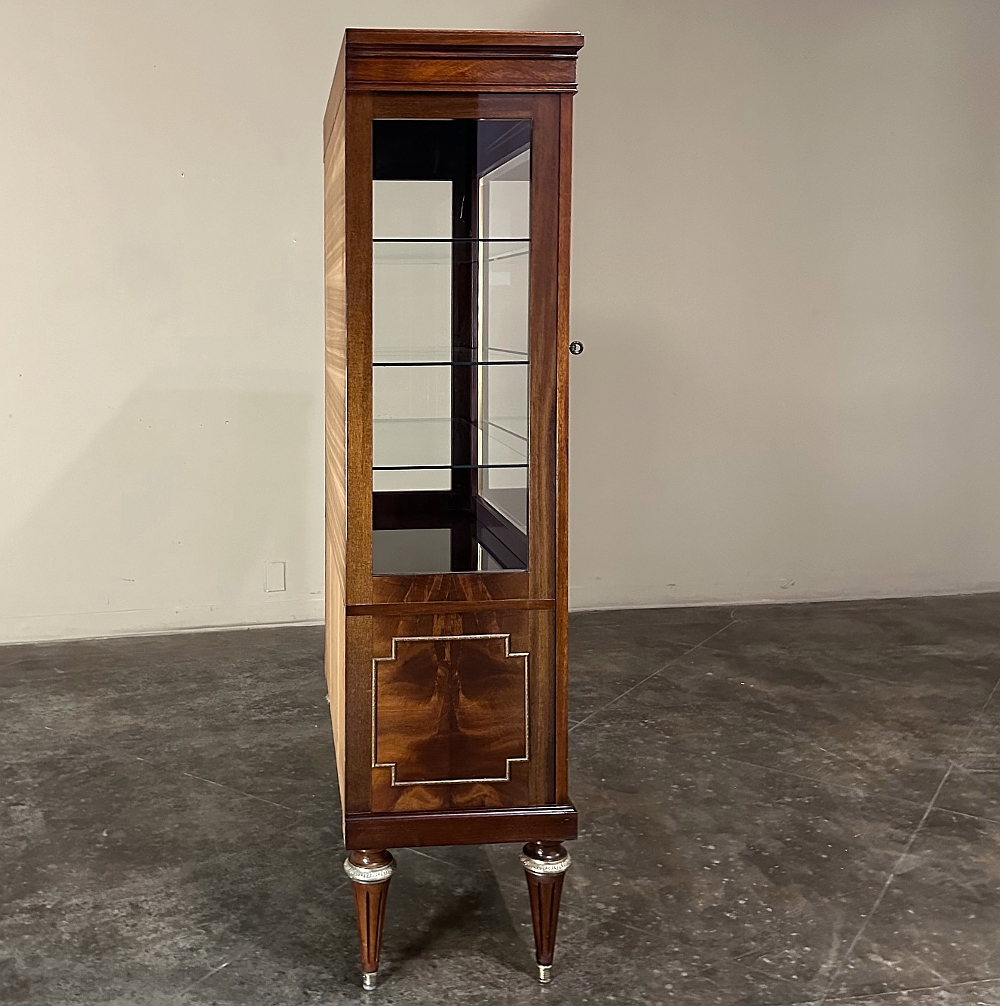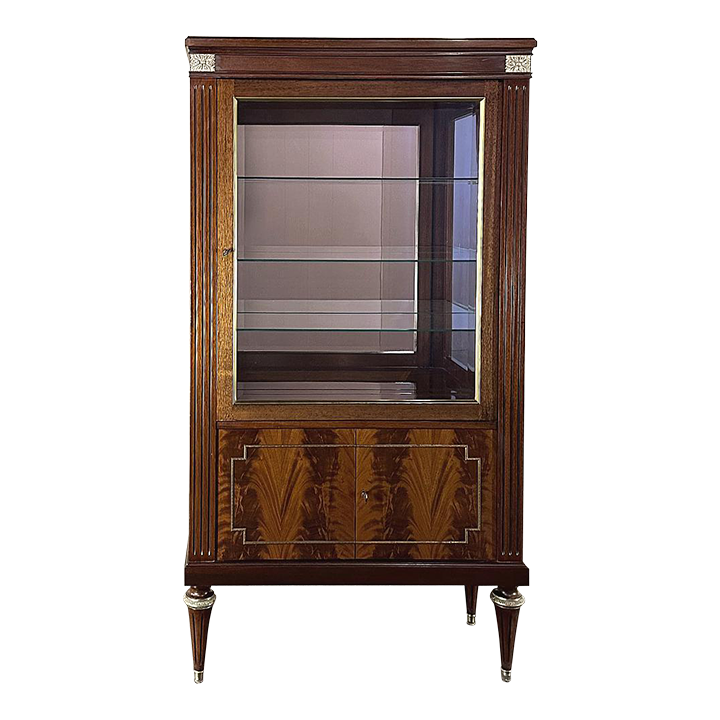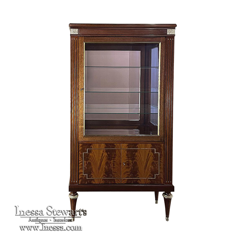 Antique French Louis XVI Flame Mahogany Vitrine is the perfect choice to display your family heirlooms, special collection, or just a seasonal display! Hand-crafted from imported mahogany, it features flame pattern veneers on the front and sides. Tailored molding provides the trim and a panel effect on the lower portion, which opens up to reveal a nice storage area. The fronts of the corner posts are fluted, and frame the glass on all three sides, allowing ample ambient light in which negates the necessity of artificial lighting, especially with the three original glass shelves and mirrored back. Cast brass rosettes on top and ring collars on the tops of the tapered and fluted legs, as well as leg tips below, all combine to add a little elegance to the otherwise understated style.