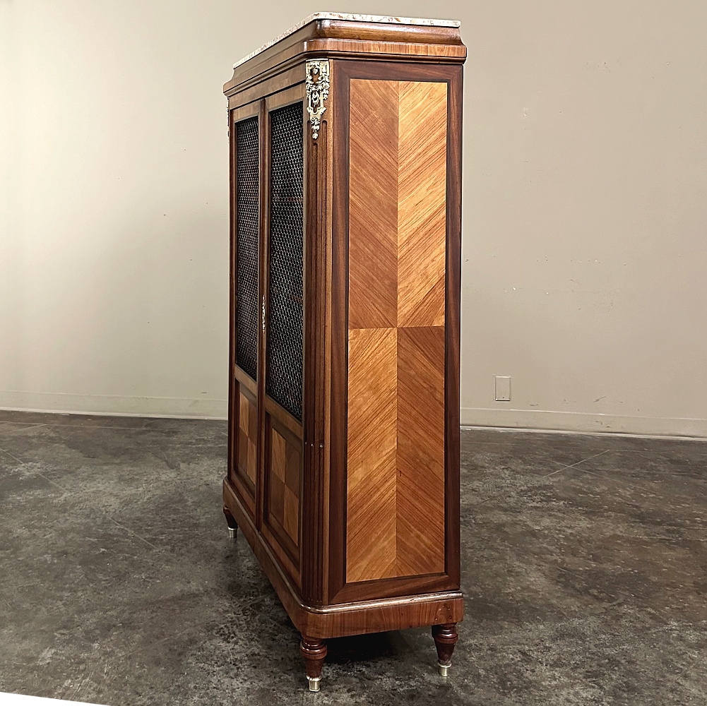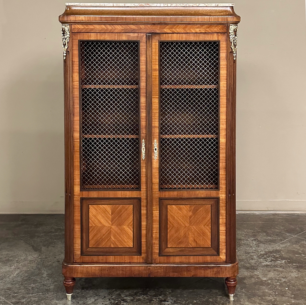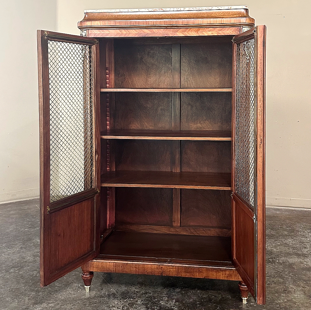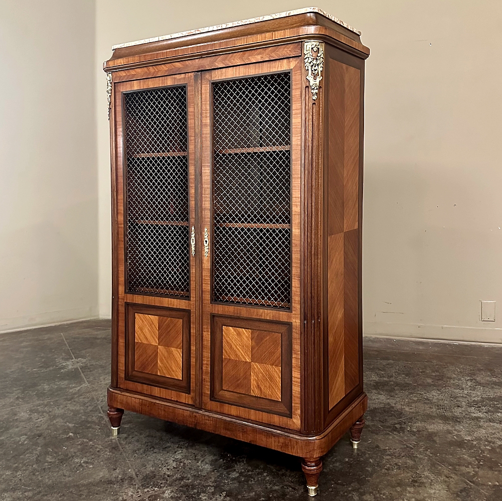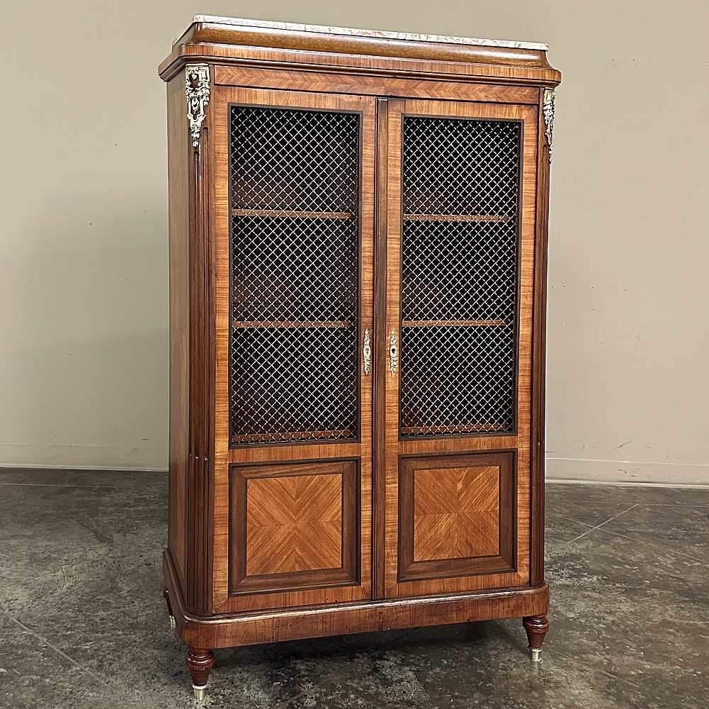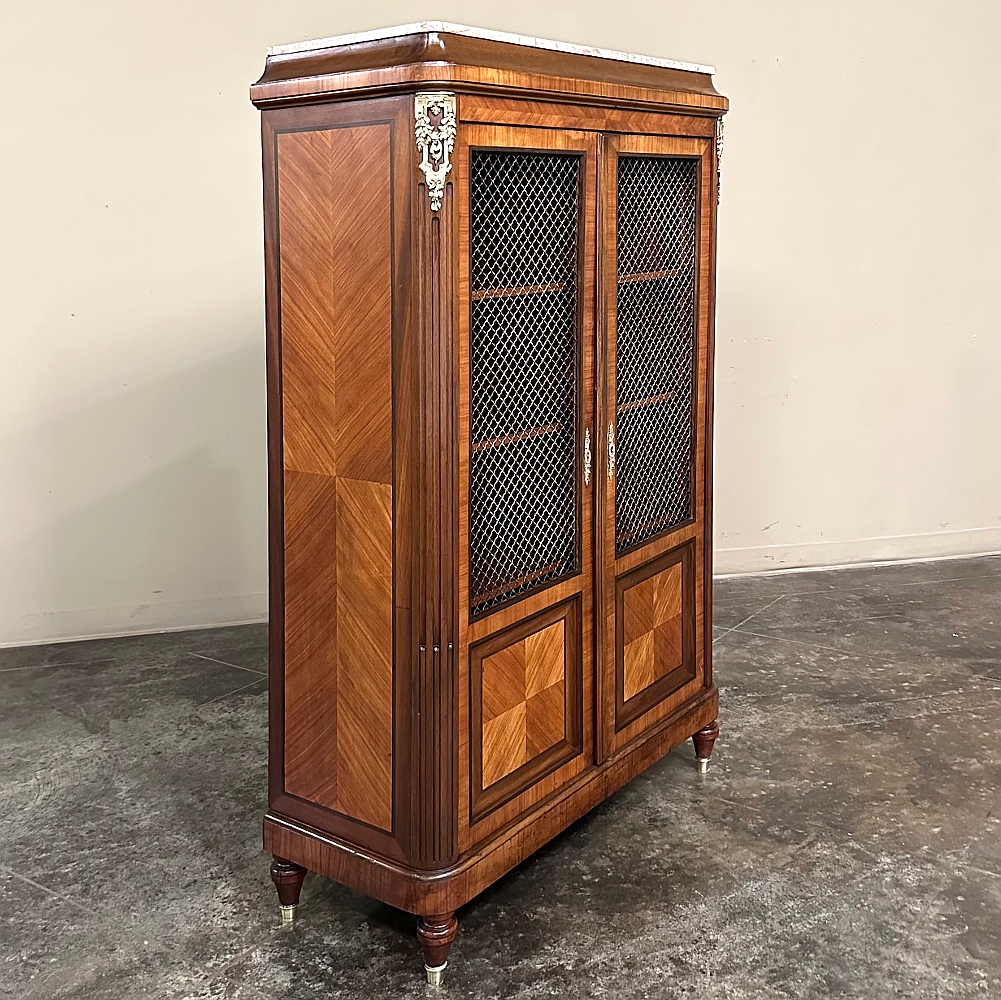 Antique French Louis XVI Mahogany Marble Top Vitrine will make a great addition to a collector's decor. The rectilinear lines of the neoclassical architecture are embellished with cross-matched veneering on the lower door panels and sides, and accented with brass decorative mounts on the shoulders with complementary key guards on the doors. The doors are also fitted with brass mesh which allows viewing of the contents without heavy glass. A fitted marble top provides additional display surface above, adding to the visual impact. Doors open to reveal three original adjustable shelves.