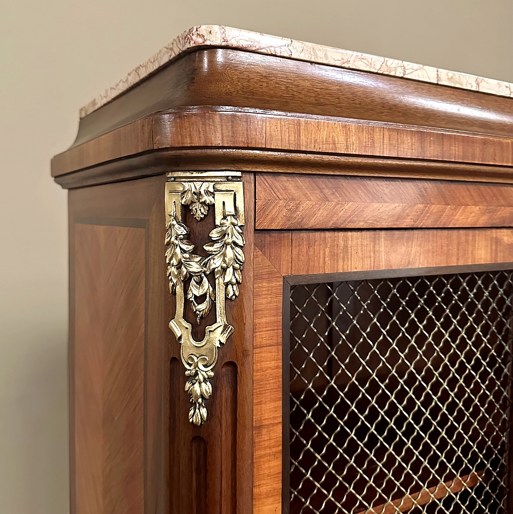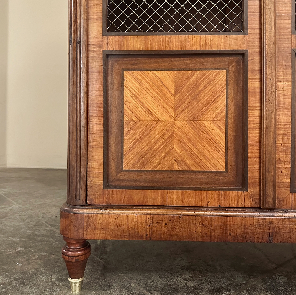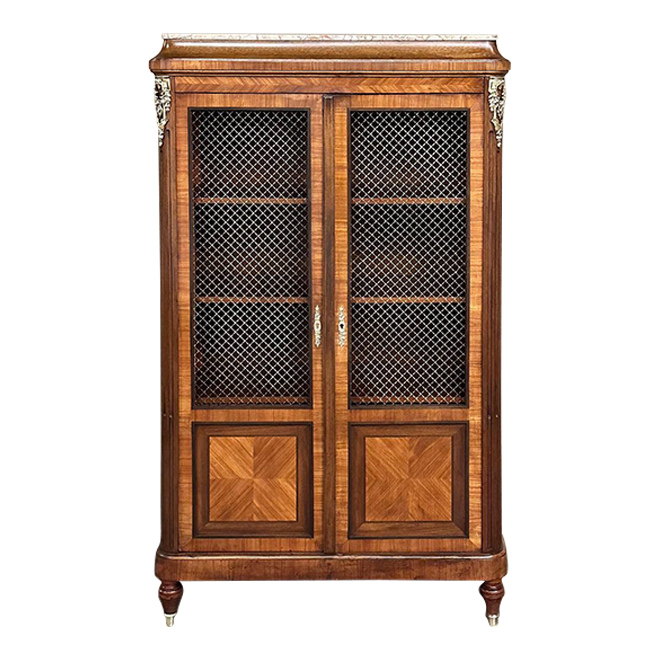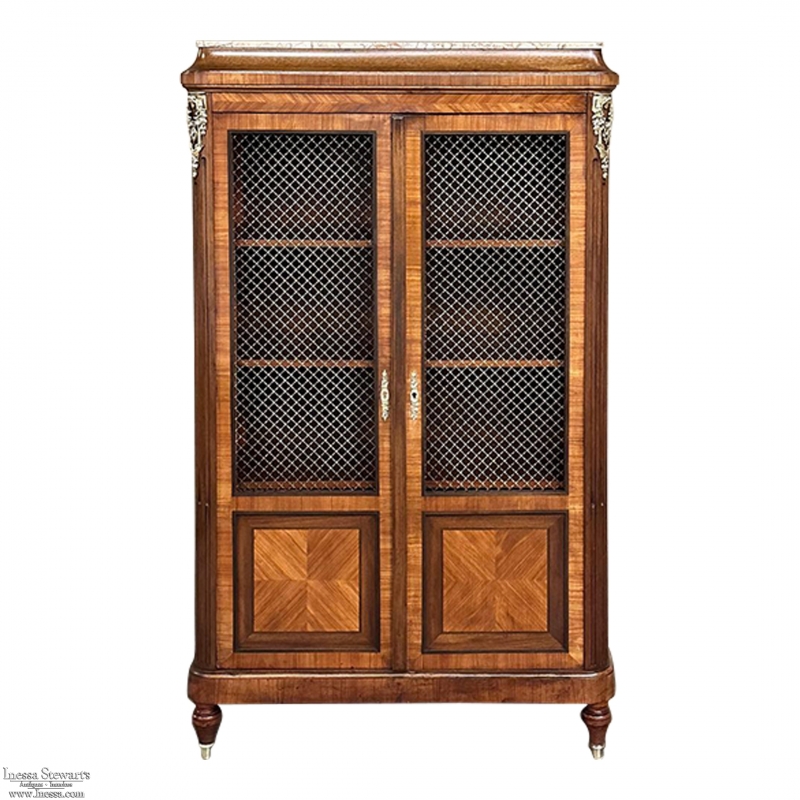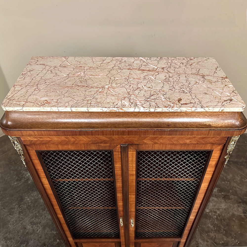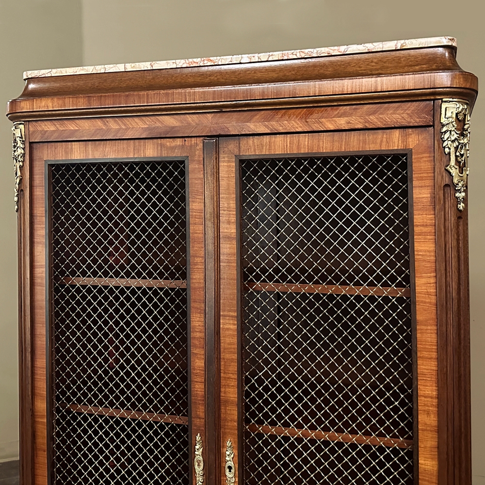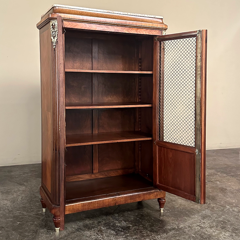 Antique French Louis XVI Mahogany Marble Top Vitrine will make a great addition to a collector's decor. The rectilinear lines of the neoclassical architecture are embellished with cross-matched veneering on the lower door panels and sides, and accented with brass decorative mounts on the shoulders with complementary key guards on the doors. The doors are also fitted with brass mesh which allows viewing of the contents without heavy glass. A fitted marble top provides additional display surface above, adding to the visual impact. Doors open to reveal three original adjustable shelves.