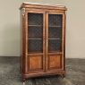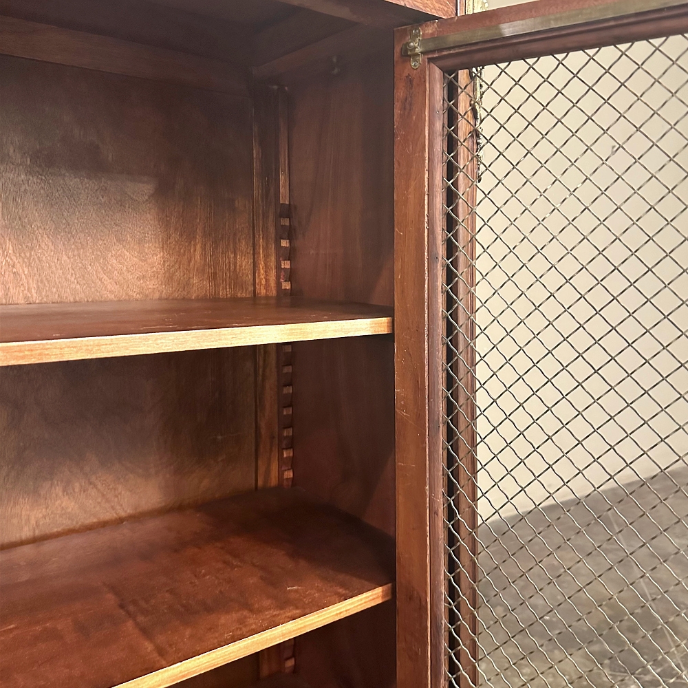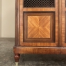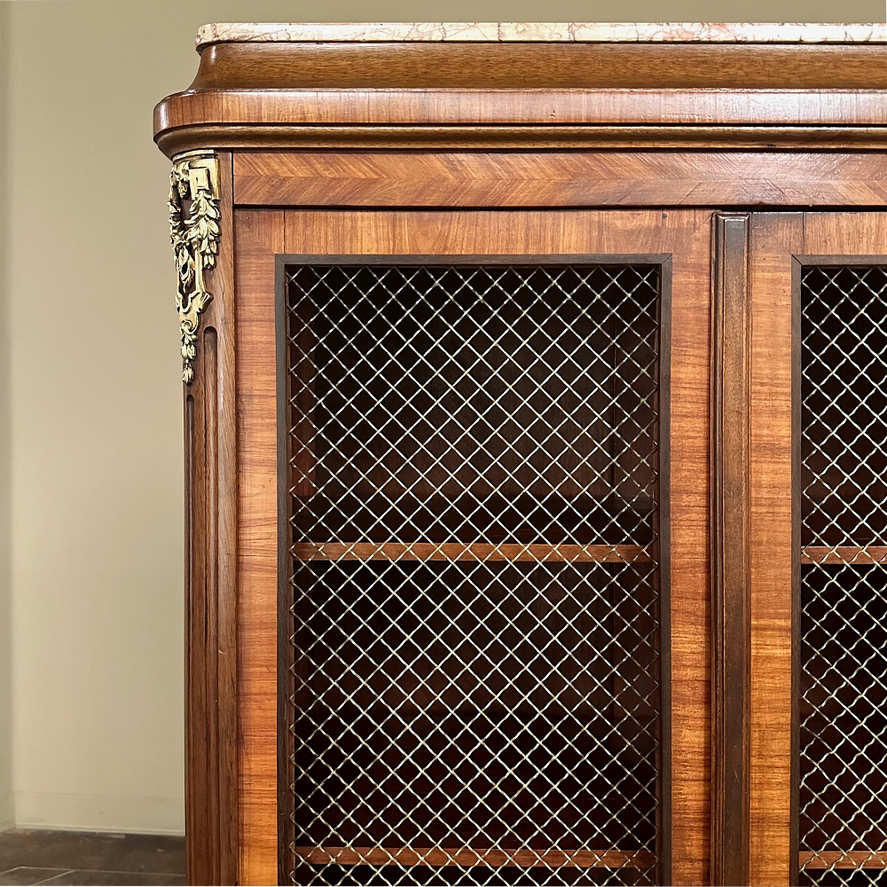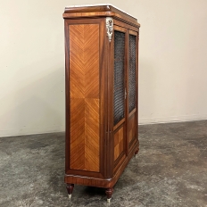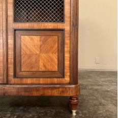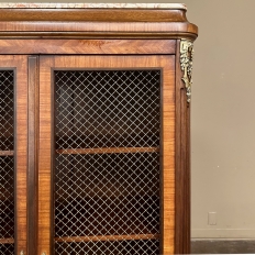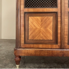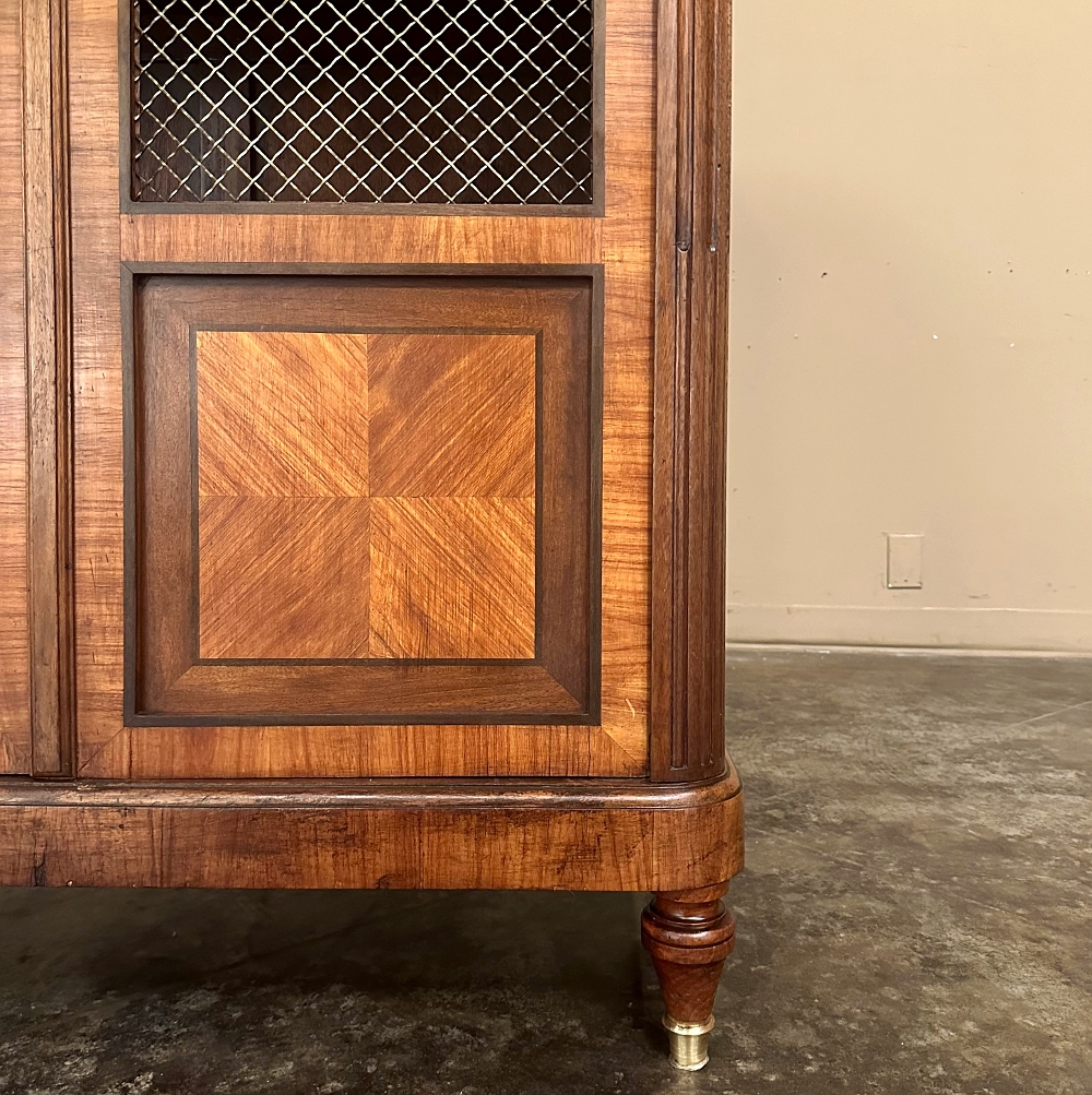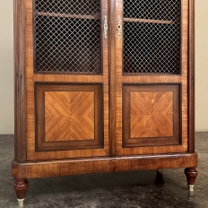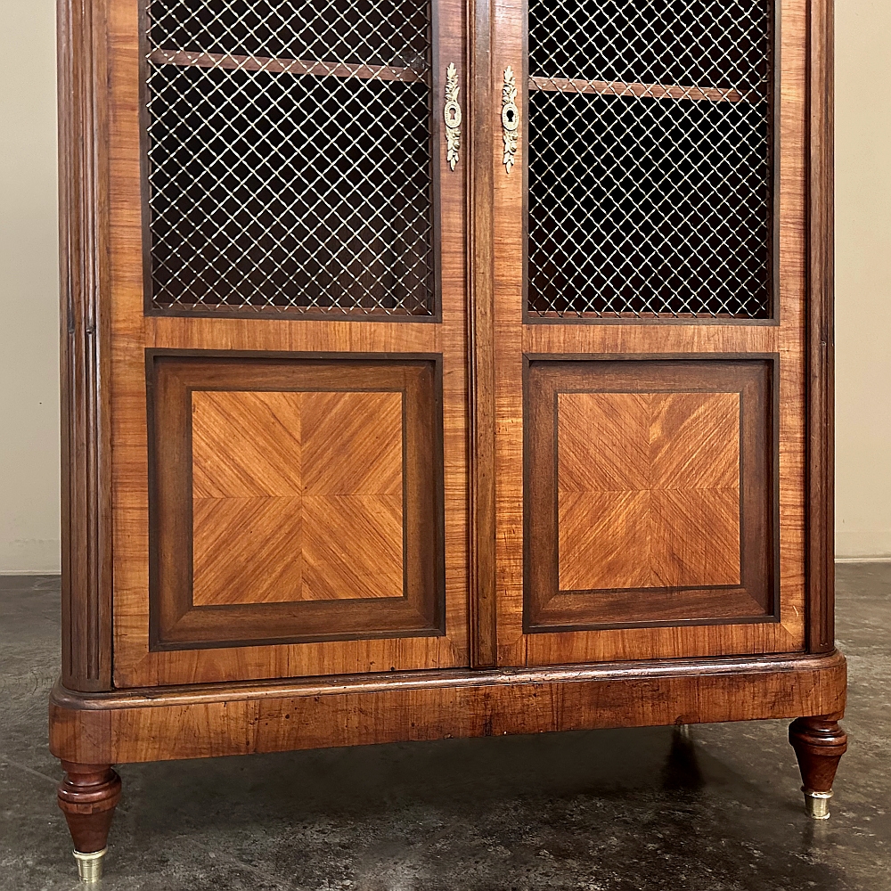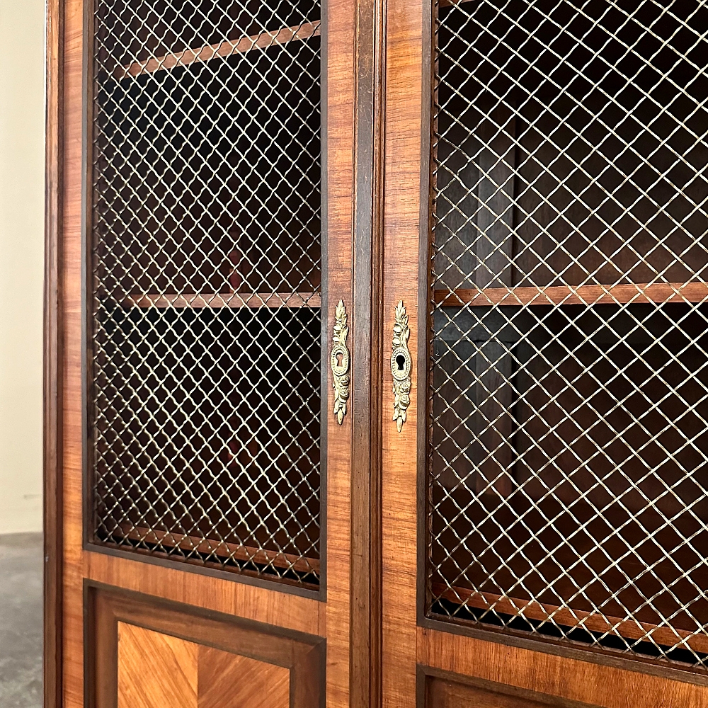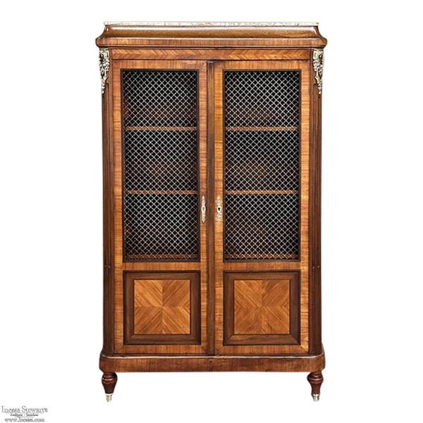 Antique French Louis XVI Mahogany Marble Top Vitrine will make a great addition to a collector's decor. The rectilinear lines of the neoclassical architecture are embellished with cross-matched veneering on the lower door panels and sides, and accented with brass decorative mounts on the shoulders with complementary key guards on the doors. The doors are also fitted with brass mesh which allows viewing of the contents without heavy glass. A fitted marble top provides additional display surface above, adding to the visual impact. Doors open to reveal three original adjustable shelves.