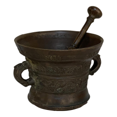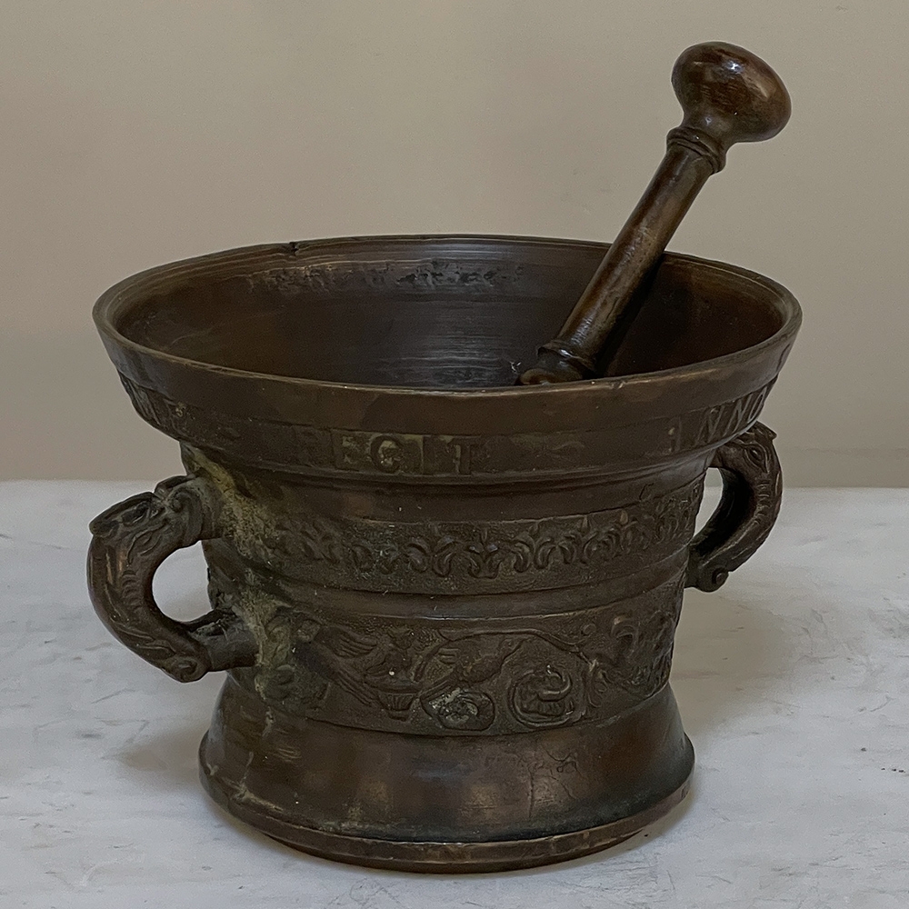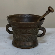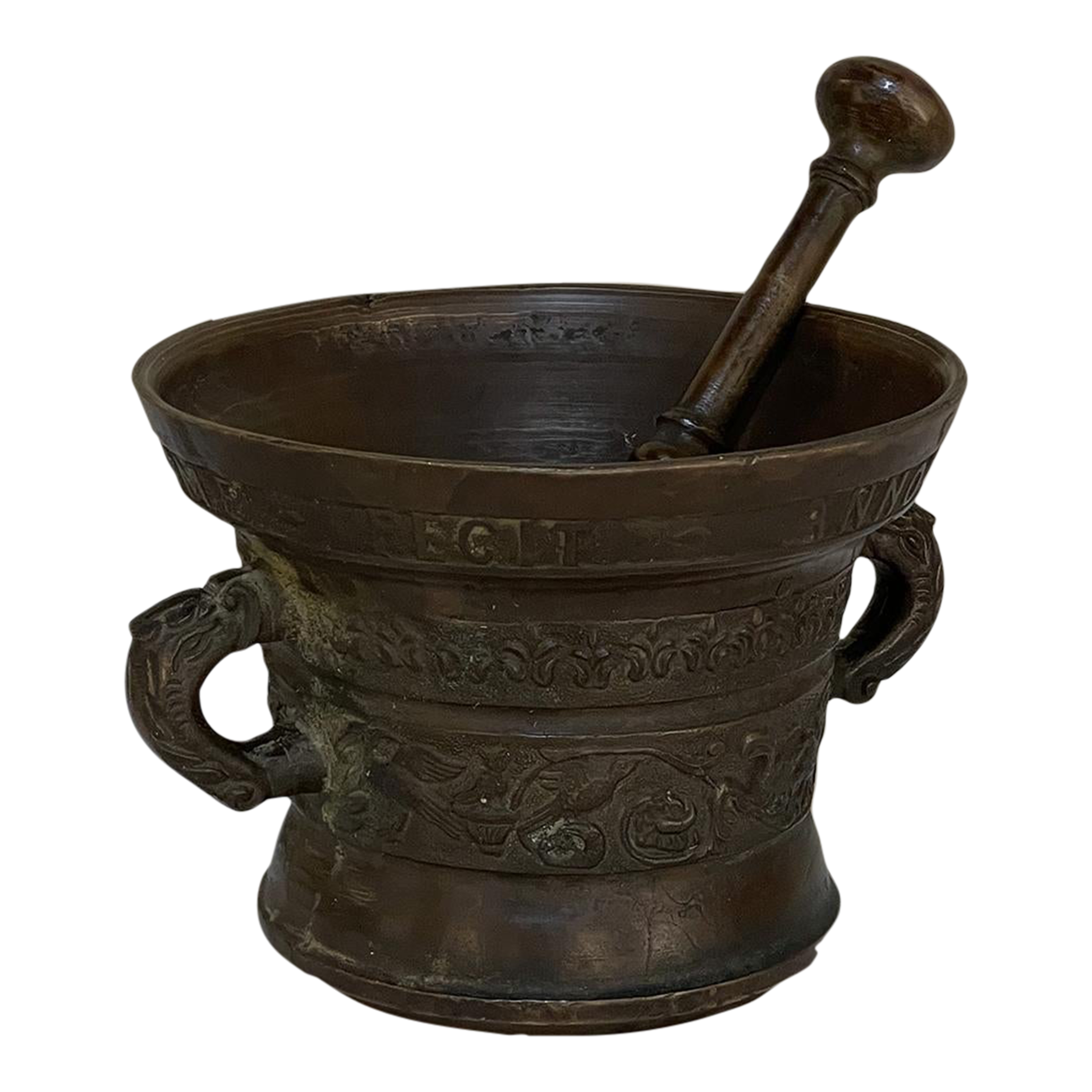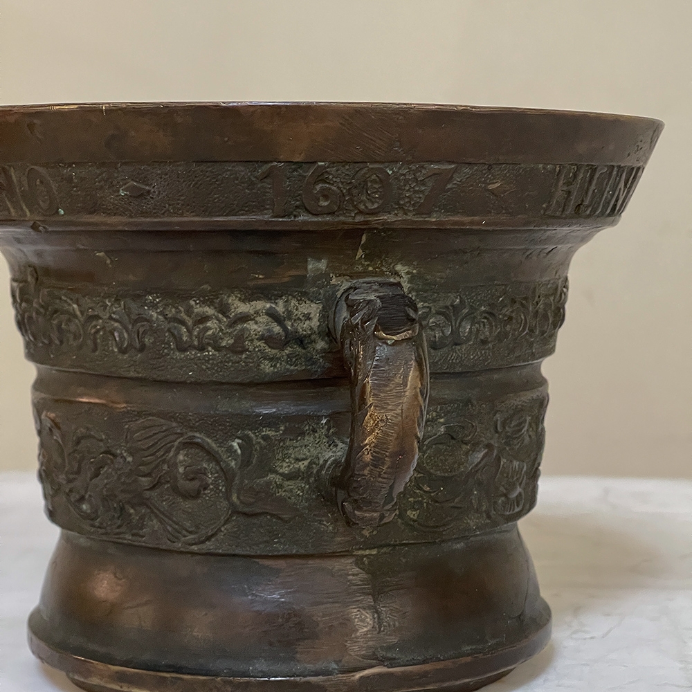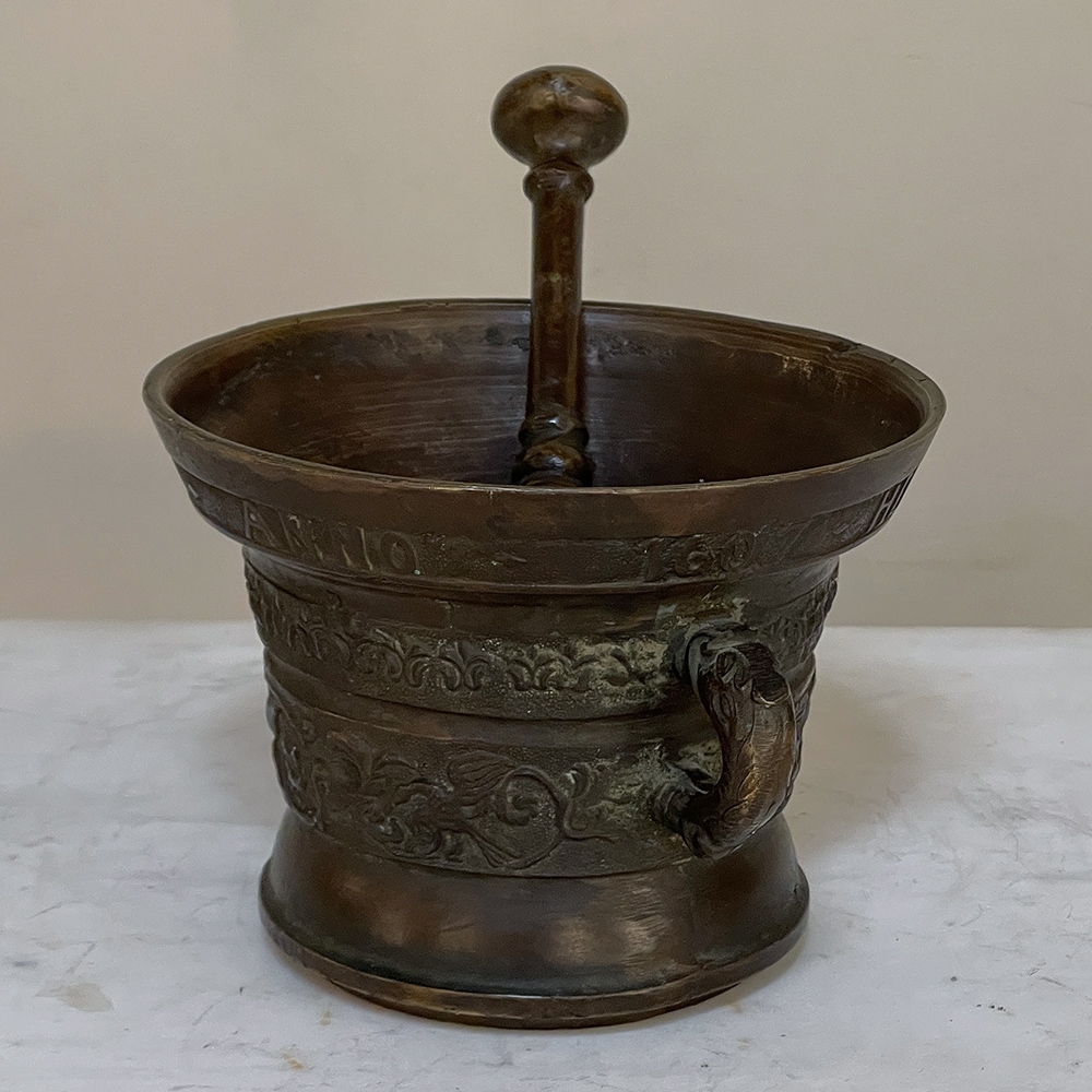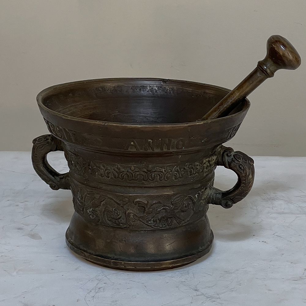 Antique Bronze Mortar & Pestle is a particularly intriguing artifact inspired by a bygone era! Although cast during the early half of the 20th century, it features a prominent commemorative date of 1607, undoubtedly significant to the person or group that had it produced. The originals were cast in the same foundries that produced cannons and other heavy bronze implements but were used primarily for pharmaceutical production, when ingredients were hand-blended and prepared in small batches, completely unlike today's robotic manufacturing factories.